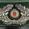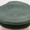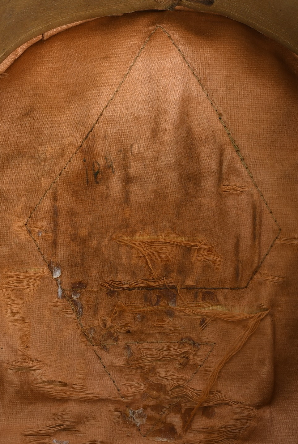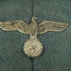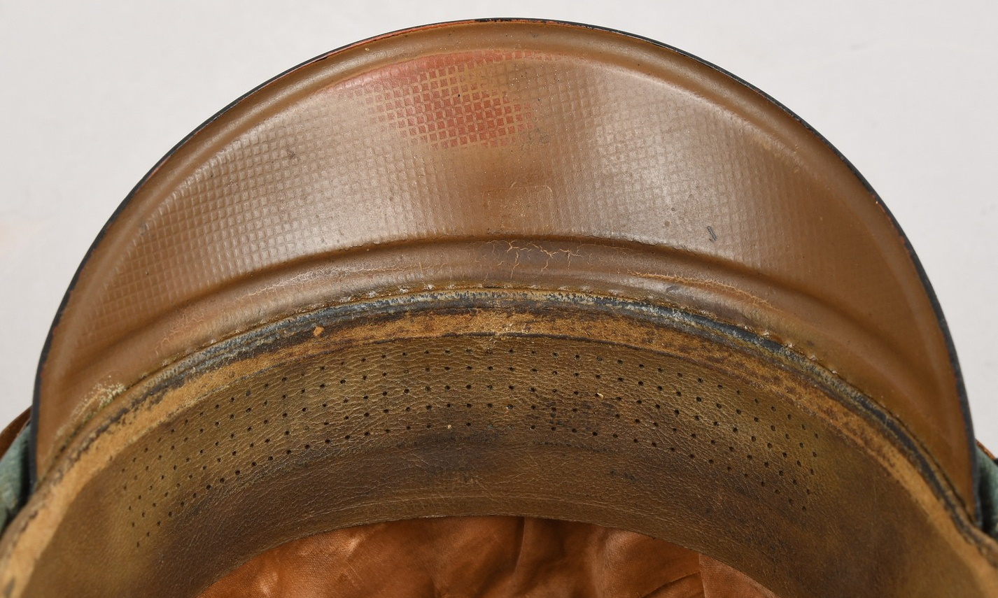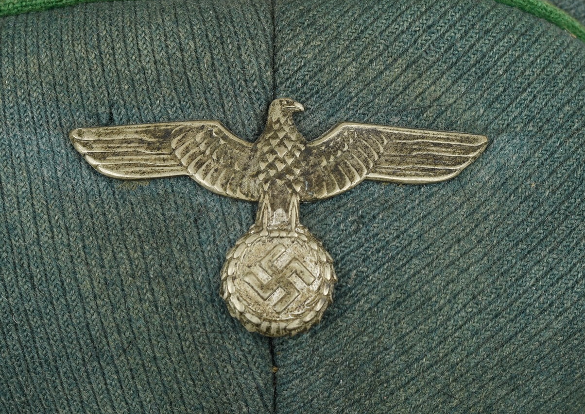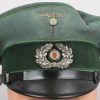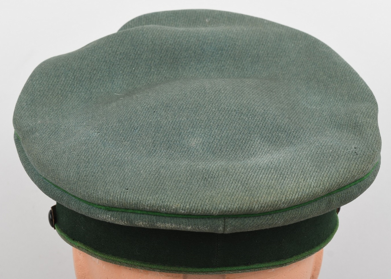 Early produced, private purchase jäger EM/NCO´s visor cap made of field-grey tricot cloth with green, trimmed wool piping. Pinned in place to the front is a early buntmetal, silver washed national eagle and wreath/cockade as well as EM/NCO´s black laquered pressed paper chincord. Inside cap is lined with orange/brown rayon cloth. Cap has lost it’s sweatshield. Brown leather sweatband is all intact. Cap shows clear signs of age and use. Inside with some tears from wear to the lining. The cap is very large approx size 59.