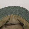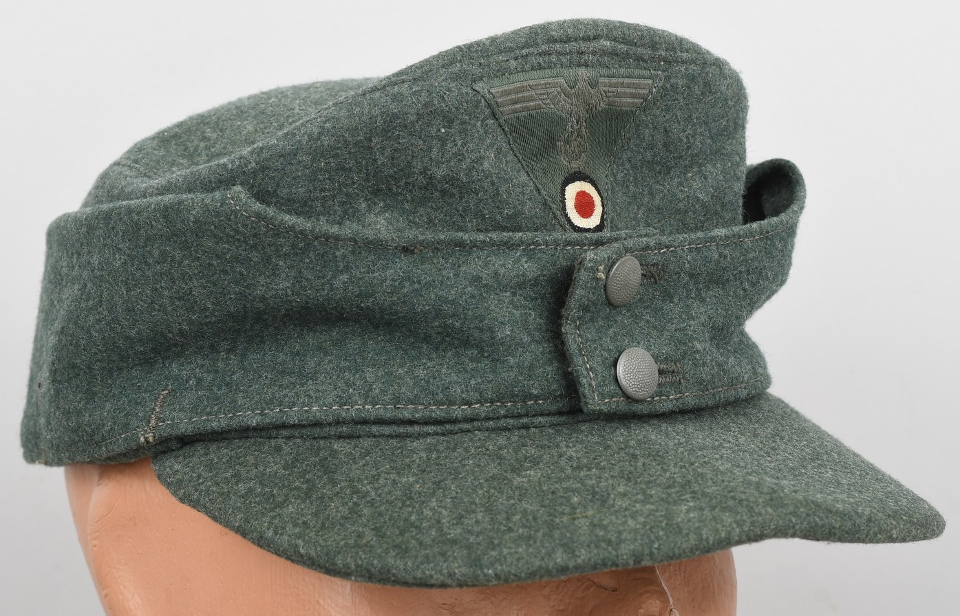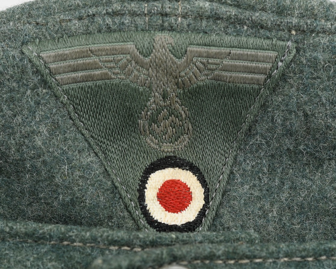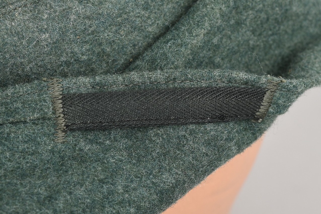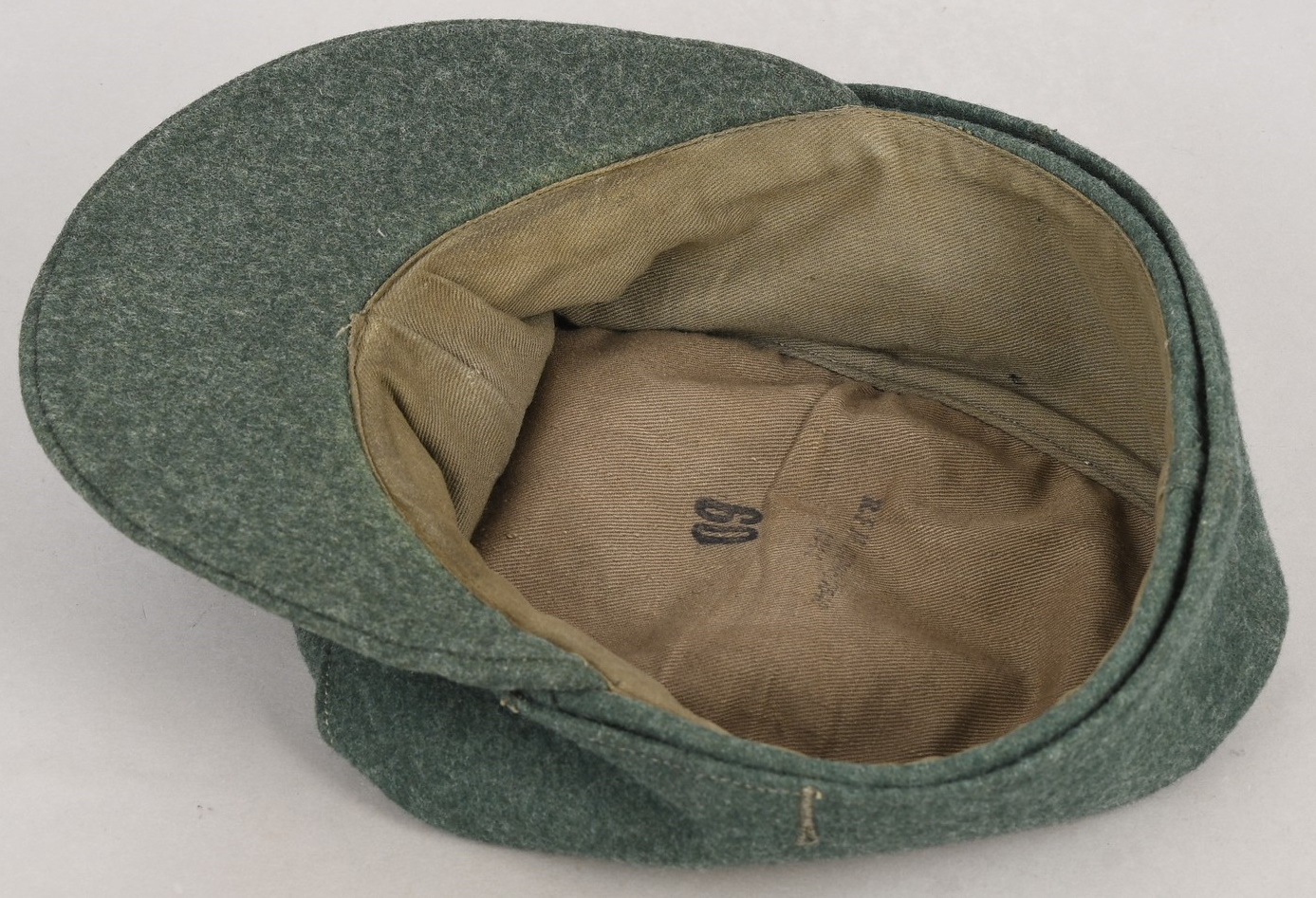 Field-grey wool construction cap features fold down back and side panels with two pebbled metal button front closure. The back and side panels were designed to be folded down to protect the wearers ears and neck and the scalloped front section could be secured with the buttons closed under the wearers chin. The front center of the cap has a machine woven m43 style national eagle machine sewn in place. The cap has an extended, cloth covered, forward visor with an internal stiffener. The interior of the cap is fully lined in mouse grey brushed cotton. The lining has a faint rfnr stamp and a clear size stamp “60”. The cap is also marked “1944” (year of production). Cap is in good, little used condition. No holes, mendings or larer stains.