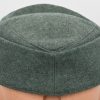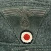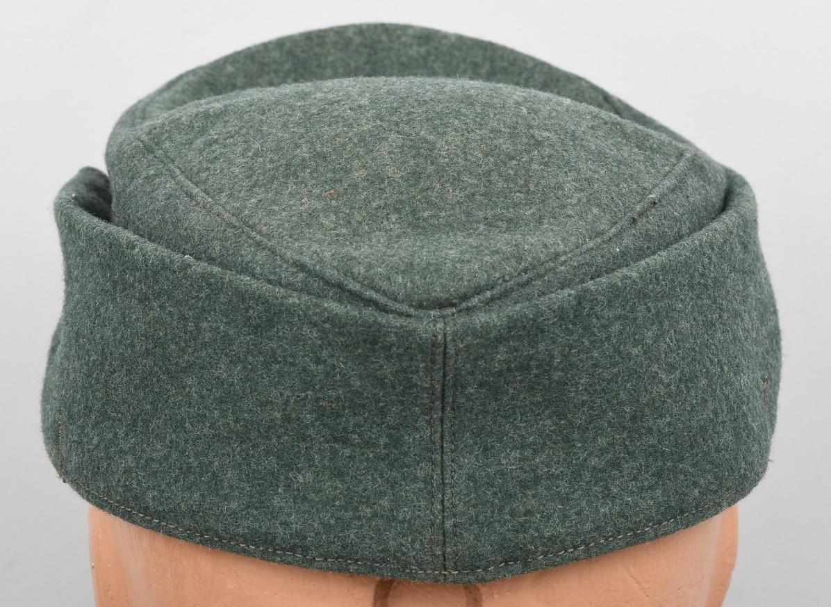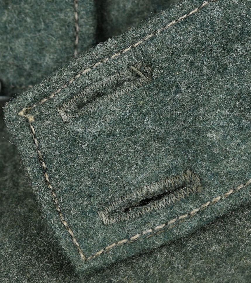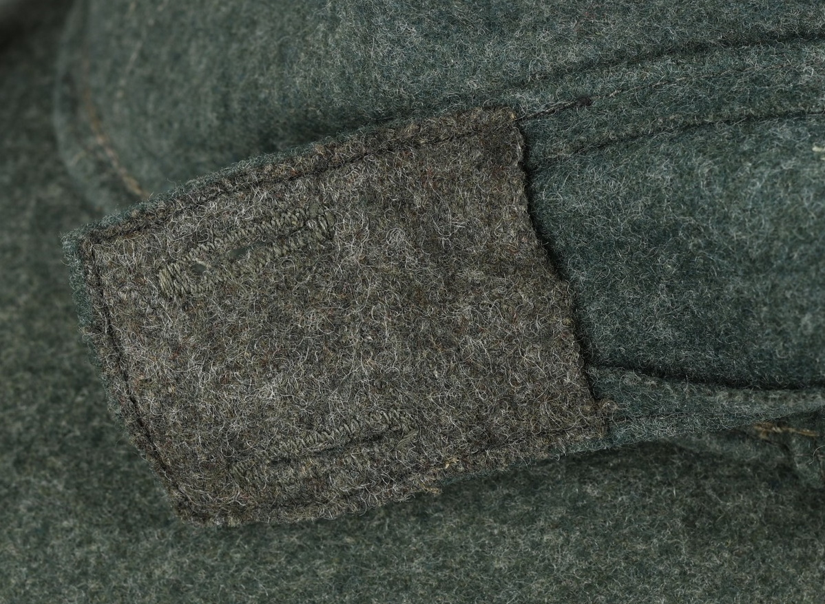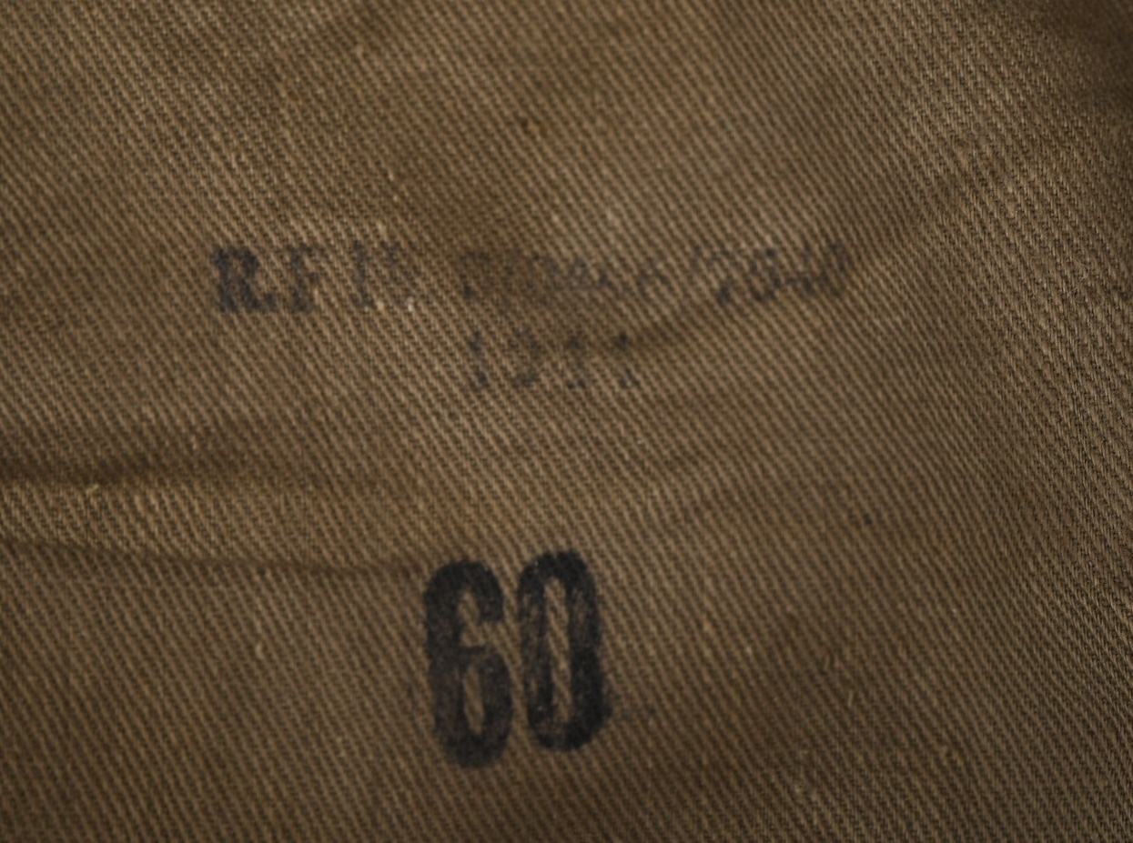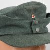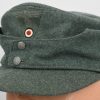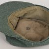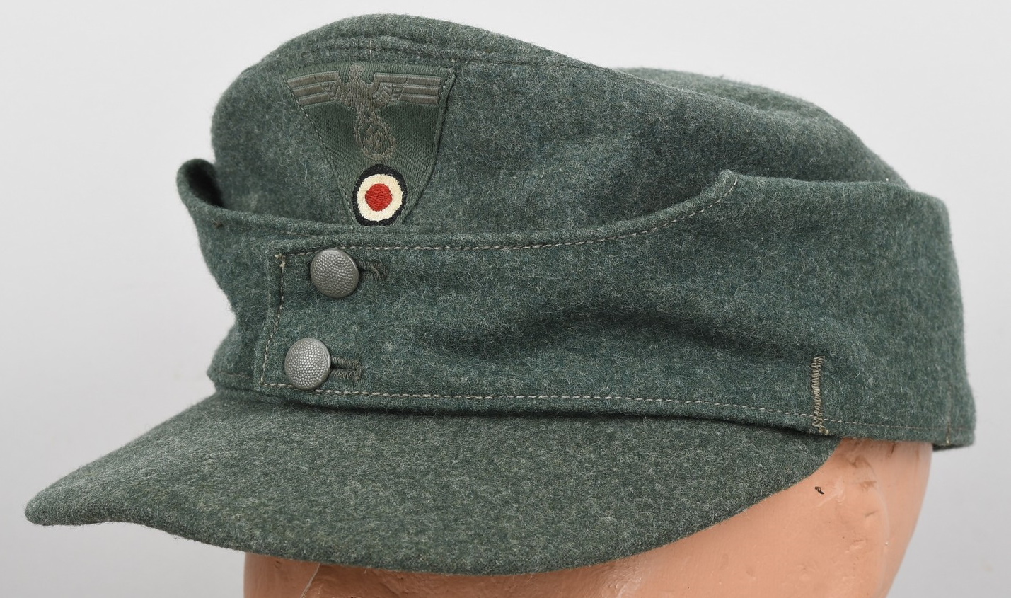 Field-grey wool construction cap features fold down back and side panels with two pebbled metal button front closure. The back and side panels were designed to be folded down to protect the wearers ears and neck and the scalloped front section could be secured with the buttons closed under the wearers chin. The front center of the cap has a machine woven m43 style national eagle machine sewn in place. The cap has an extended, cloth covered, forward visor with an internal stiffener. The interior of the cap is fully lined in mouse grey brushed cotton. The lining has a faint rfnr stamp and a clear size stamp “60”. The cap is also marked “1944” (year of production). Cap is in good, little used condition. No holes, mendings or larer stains.