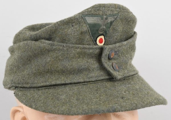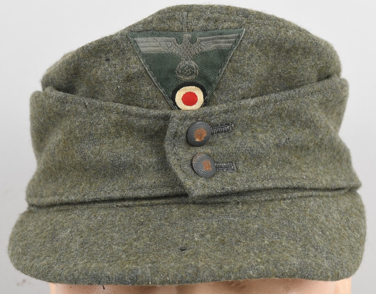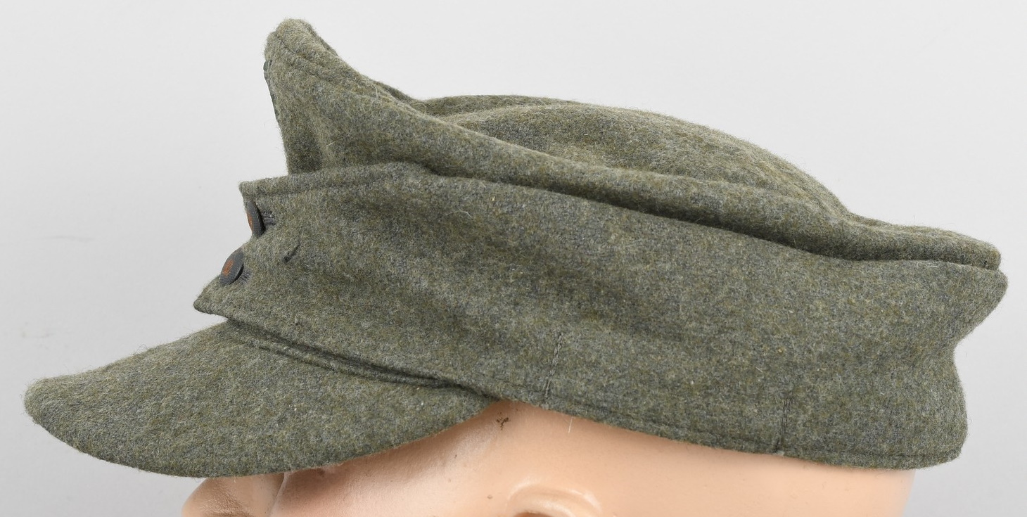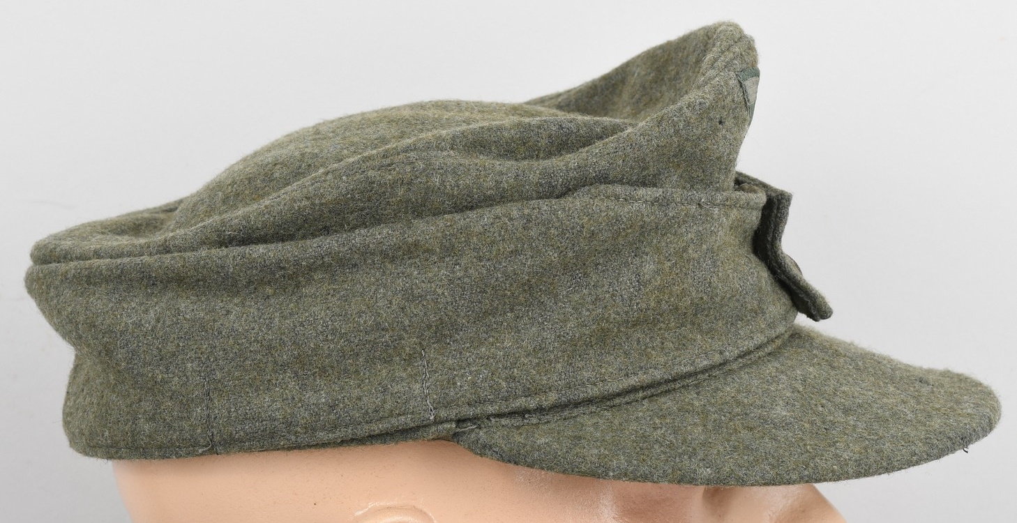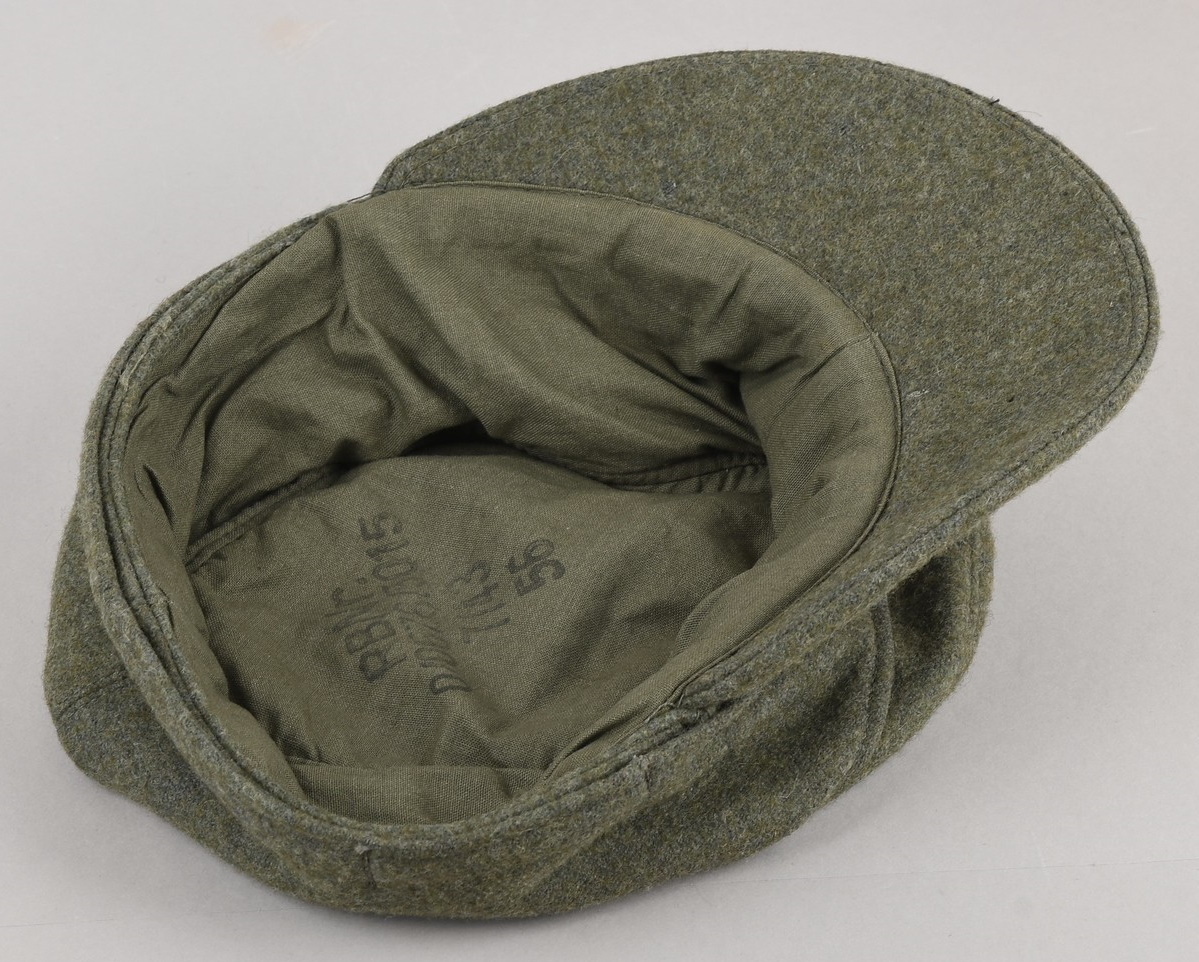 Field-grey wool construction cap features fold down back and side panels with two grey painted pebbled metal button front closure. The back and side panels were designed to be folded down to protect the wearers ears and neck and the scalloped front section could be secured with the buttons closed under the wearers chin. The front center of the cap has a machine woven M43 style national eagle factory machine and hand sewn in place. The cap has an extended, cloth covered, forward visor with an internal stiffener with a subtly raised lip to the top of the forward edge and a single row of reinforcement stitching to the bottom of the forward edge. The interior of the cap is fully lined in grey cotton. The lining has well marked with black ink: RBNr. 0/0578/5015 (factory code), “7/43” (which means the cap was produced July 1943. And last “56” which is the size of the cap.