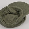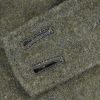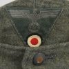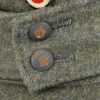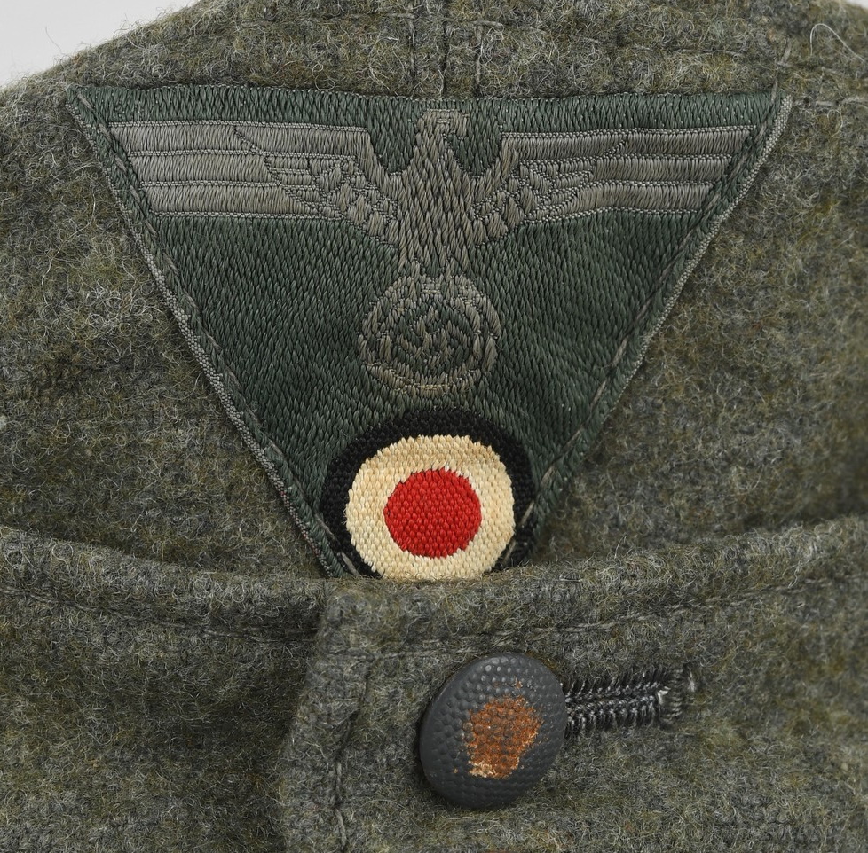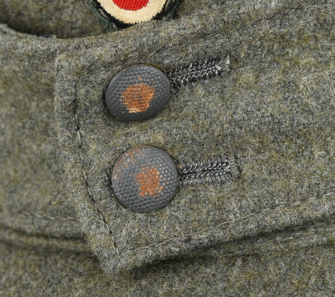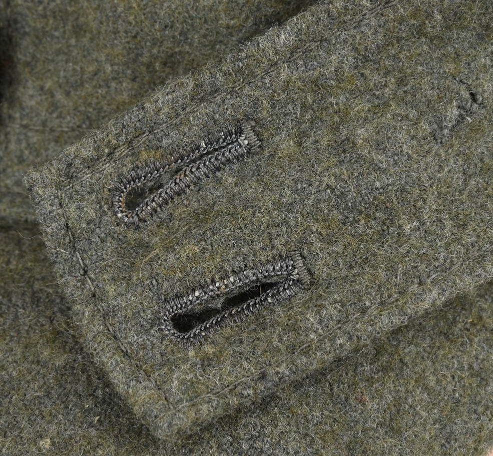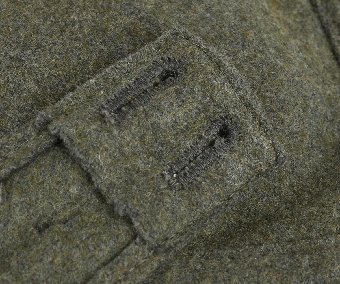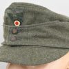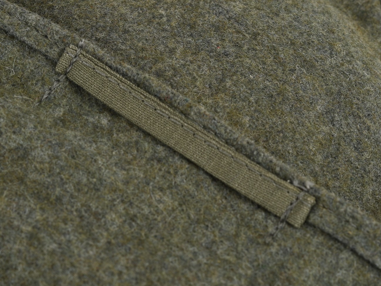 Field-grey wool construction cap features fold down back and side panels with two grey painted pebbled metal button front closure. The back and side panels were designed to be folded down to protect the wearers ears and neck and the scalloped front section could be secured with the buttons closed under the wearers chin. The front center of the cap has a machine woven M43 style national eagle factory machine and hand sewn in place. The cap has an extended, cloth covered, forward visor with an internal stiffener with a subtly raised lip to the top of the forward edge and a single row of reinforcement stitching to the bottom of the forward edge. The interior of the cap is fully lined in grey cotton. The lining has well marked with black ink: RBNr. 0/0578/5015 (factory code), “7/43” (which means the cap was produced July 1943. And last “56” which is the size of the cap.