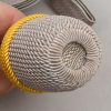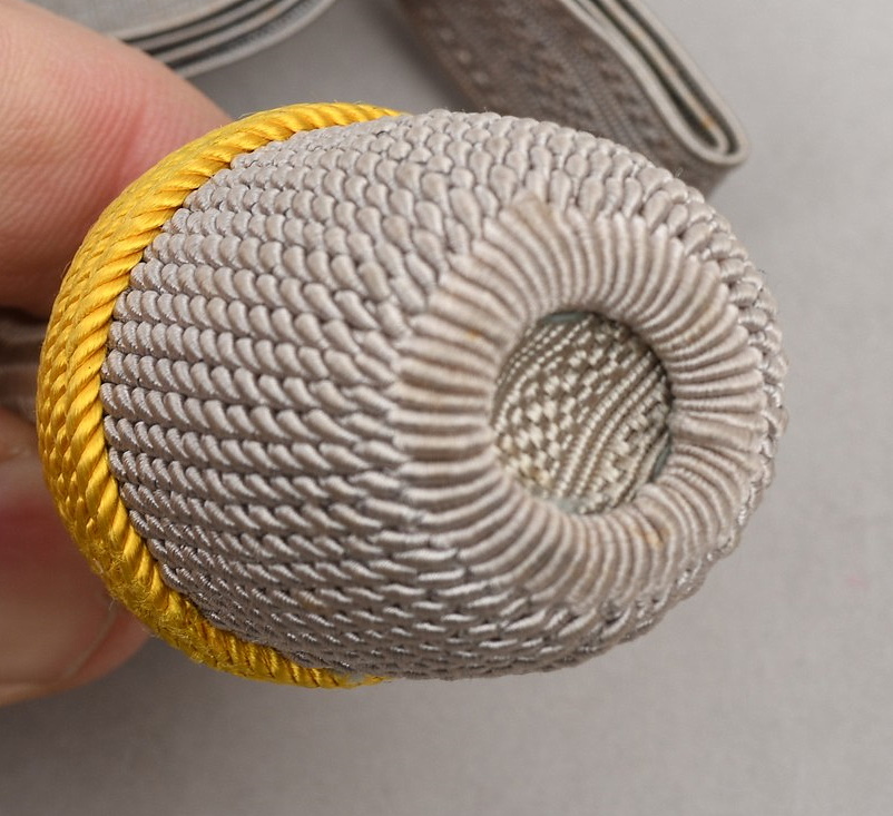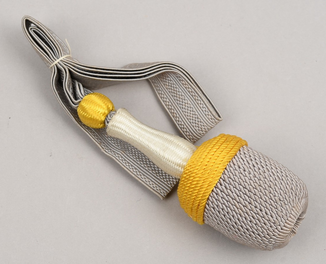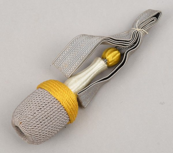 This troddel is in very good condition never appearing to have been issued. It features the gray rayon strapping with a white slide stem and ball cap all being of matching yellow. The lower ball is in yellow gray yarn like material. Ball cap is also in yellow. The insert matches the strapping.