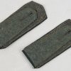 Later 1935-1938, first pattern slip on shoulder strap’s with pointed tips and no branch color piping. Blue/green badge cloth construction shoulder strap’s with has bright silver/aluminum NCO’s tress to all of the outside edges. Singel rank pip pinned in place to each strap. A unit cypher was removed leaving a small hole to the center of each strap. Reverse complete with intact retaining tounges. The perfect matching pair shows signs of age and real use.