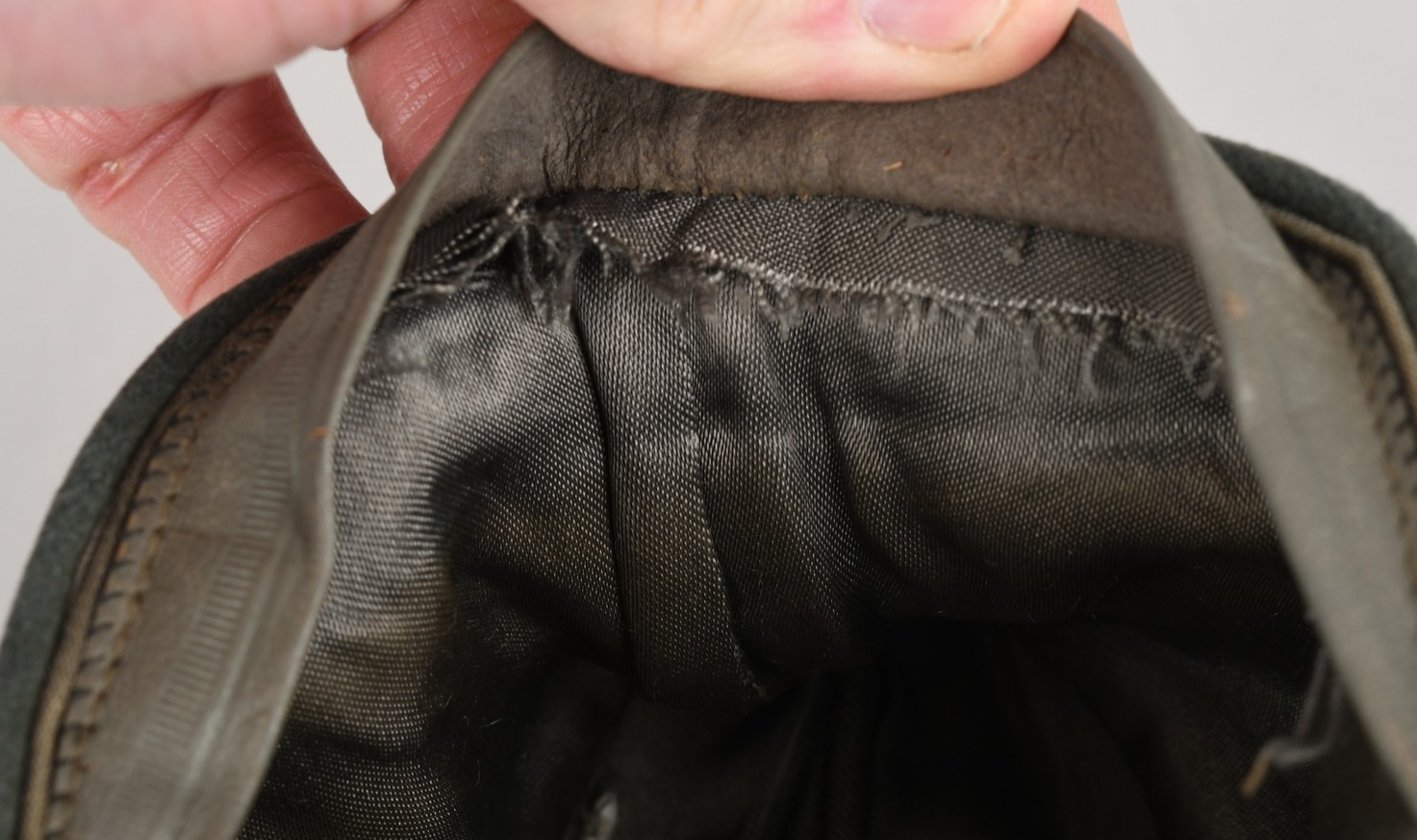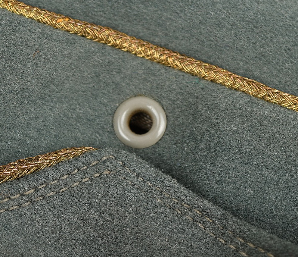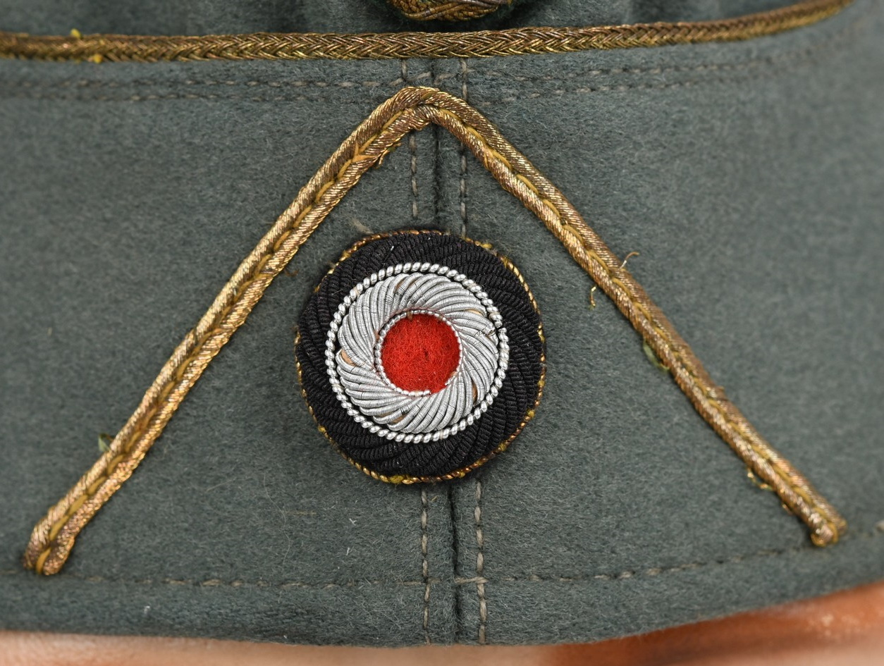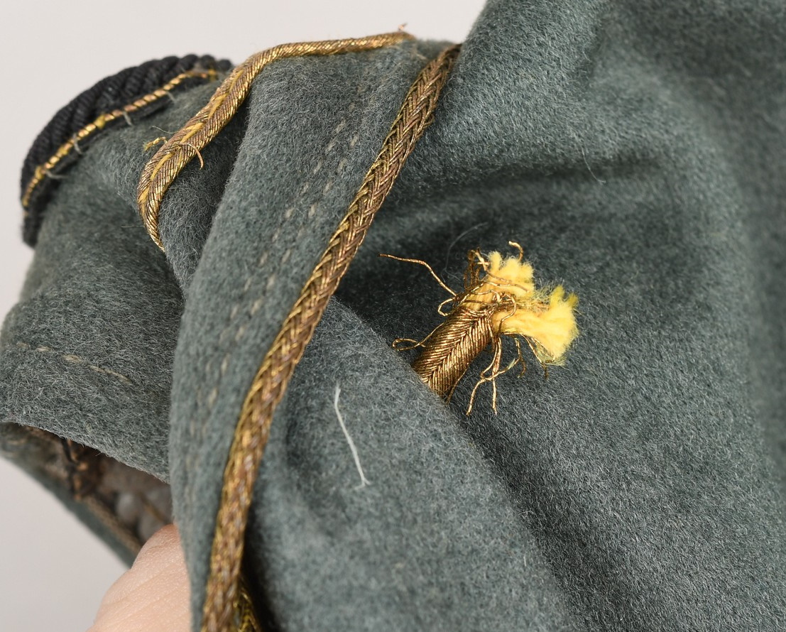 Constructed of high quality field-grey doeskin cloth. Fold down side and back panels with scalloped slopes to the forward side panels. The crown edge and the forward scalloped side panels are both piped in gilt braiding. The front center of the cap has a hand embroidered general’s national eagle in golden bullion threads on a cut-out bottle green wool base. The eagle is neatly handstitched to the cap. The front center of the fold down panels has a hand national tri-color cockade with gilt wire. The cockade is also neatly handstitched to the cap. The cockade is flanked by a golden soutache in an inverted “V” pattern. The soutache is applied in the proper manner being machine sewn in place and inserted through small puncture holes at the seam near the bottom edge of the cap. Inside is lined with silver/grey rayon cloth. Inside also with a intact partial sweatband. Cap is roughly a size 57. The cap shows clear signs of real use with color darkening to all exposed parts. Inside also shows color darkening to all exposed parts from grease, hair, fat, sweat and old hair products. All as expected to find from a well used cap. Exterior of the cap shows very light moth tracking to a couple of places.
