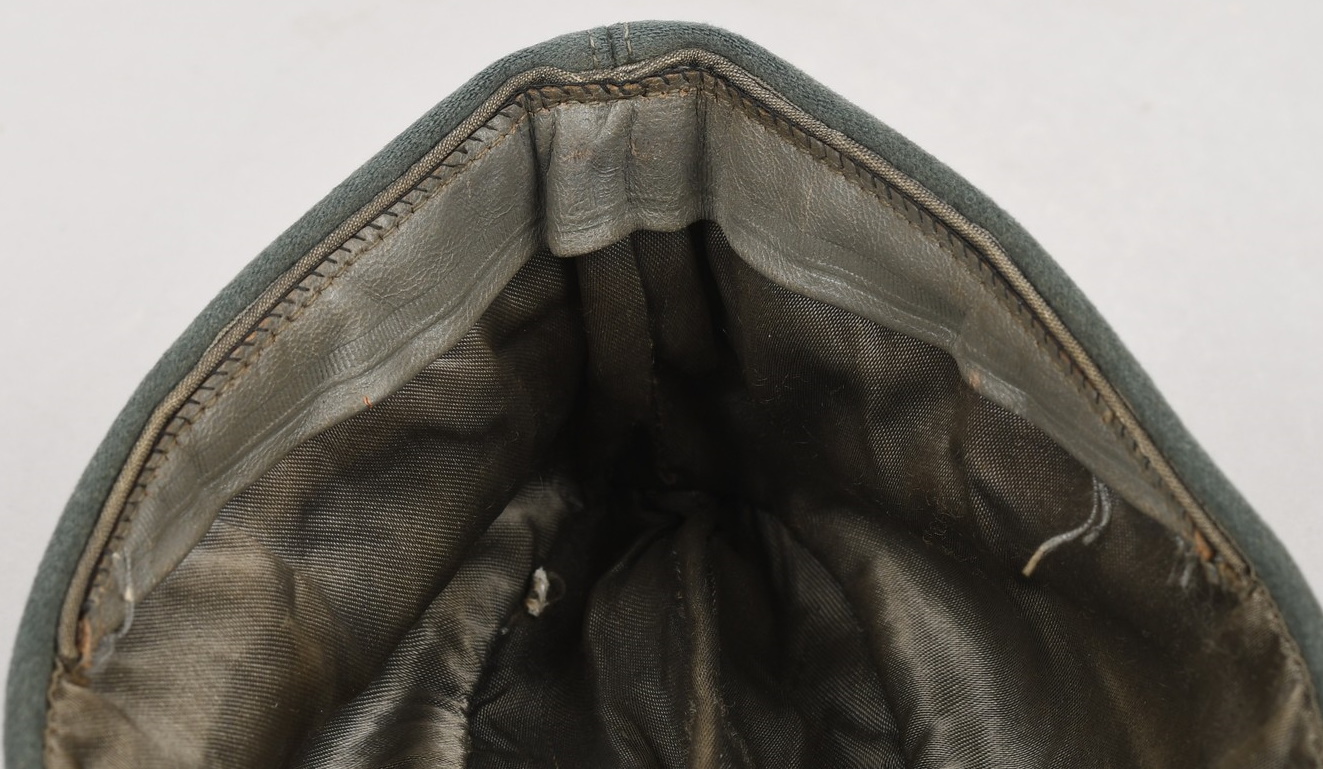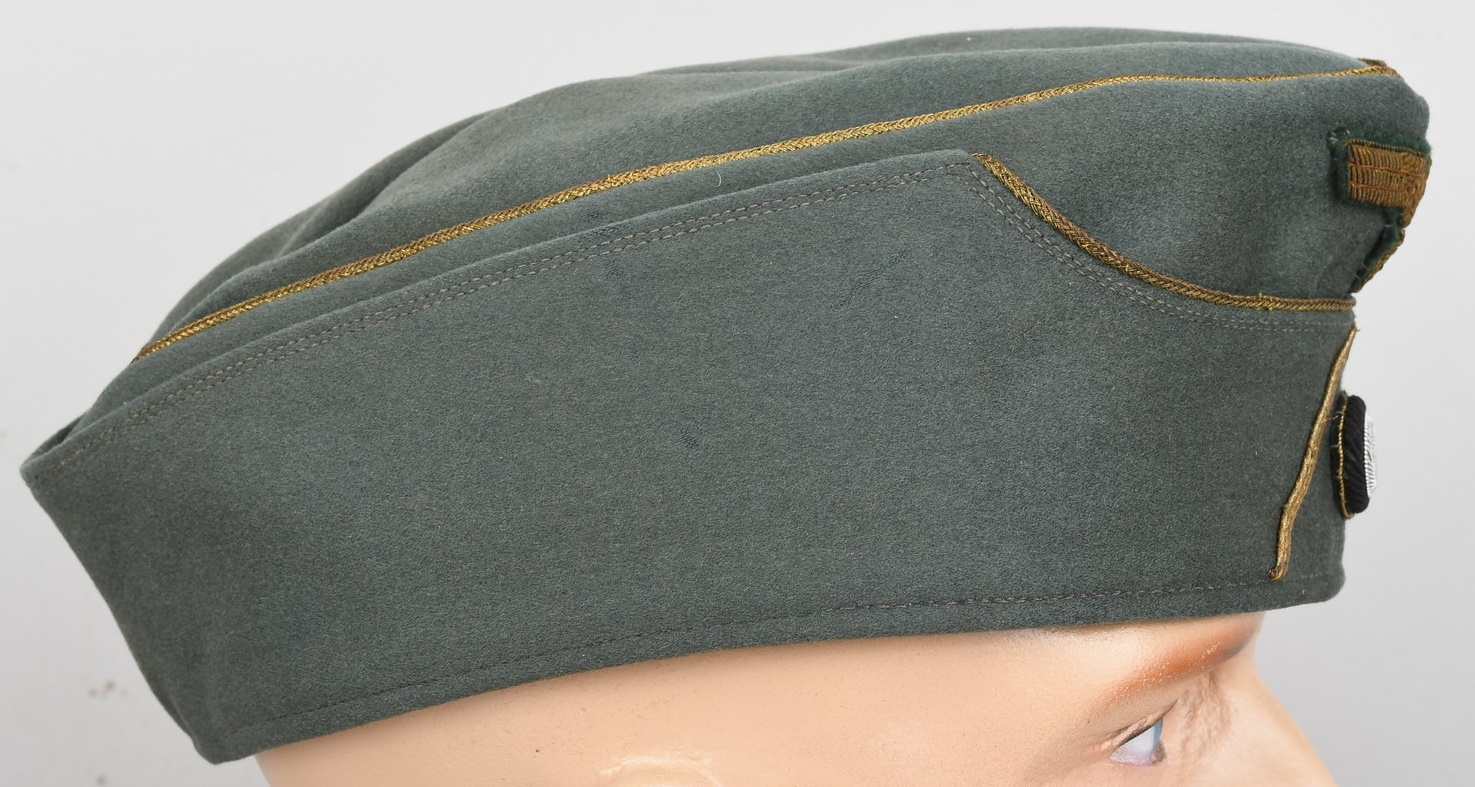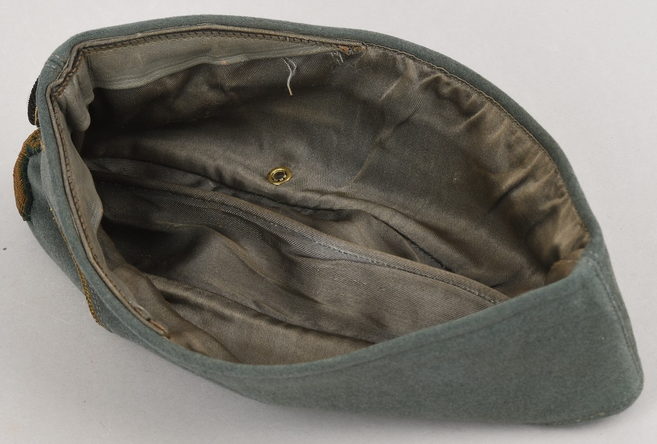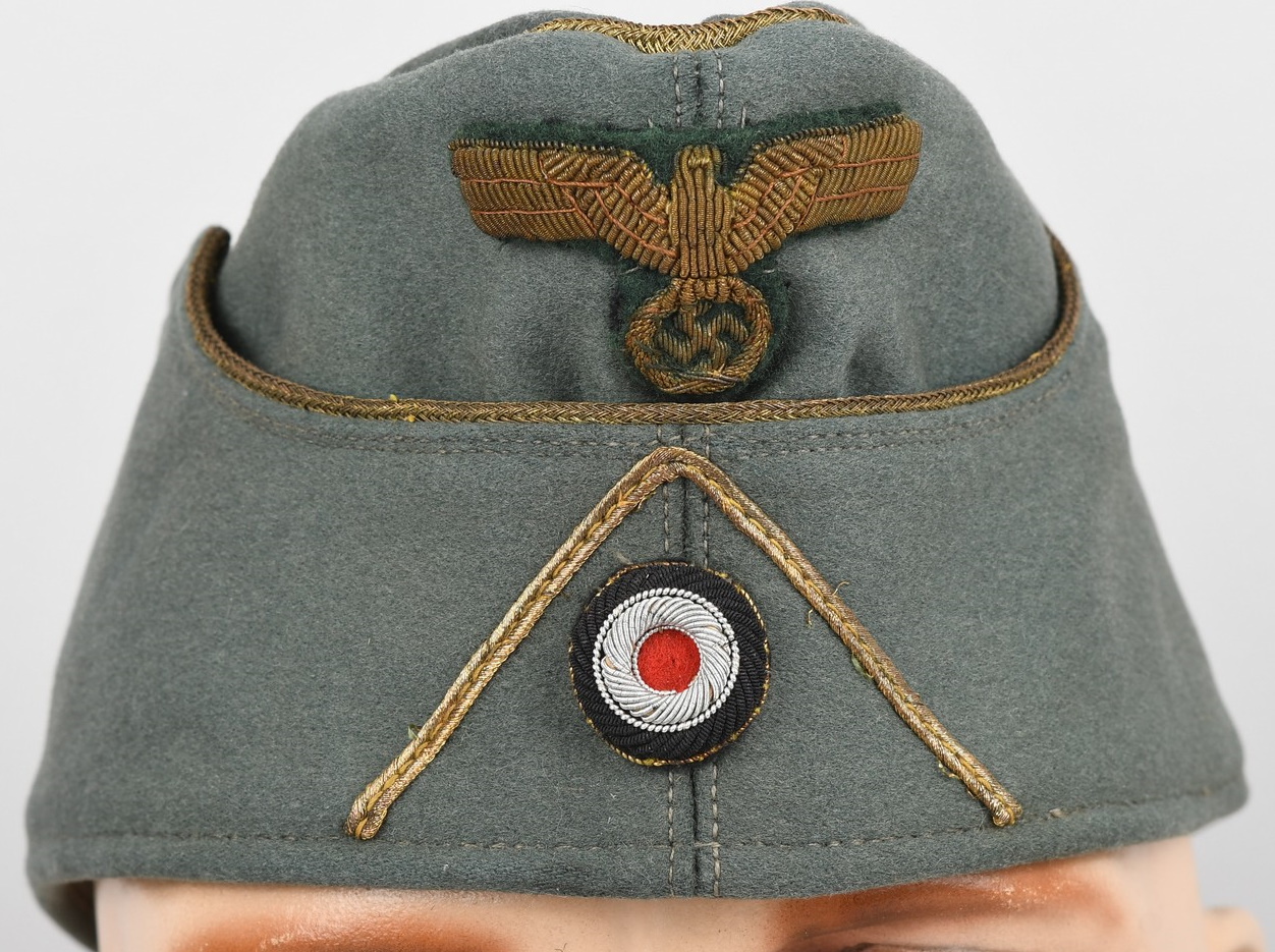 Constructed of high quality field-grey doeskin cloth. Fold down side and back panels with scalloped slopes to the forward side panels. The crown edge and the forward scalloped side panels are both piped in gilt braiding. The front center of the cap has a hand embroidered general’s national eagle in golden bullion threads on a cut-out bottle green wool base. The eagle is neatly handstitched to the cap. The front center of the fold down panels has a hand national tri-color cockade with gilt wire. The cockade is also neatly handstitched to the cap. The cockade is flanked by a golden soutache in an inverted “V” pattern. The soutache is applied in the proper manner being machine sewn in place and inserted through small puncture holes at the seam near the bottom edge of the cap. Inside is lined with silver/grey rayon cloth. Inside also with a intact partial sweatband. Cap is roughly a size 57. The cap shows clear signs of real use with color darkening to all exposed parts. Inside also shows color darkening to all exposed parts from grease, hair, fat, sweat and old hair products. All as expected to find from a well used cap. Exterior of the cap shows very light moth tracking to a couple of places.