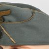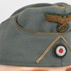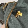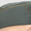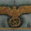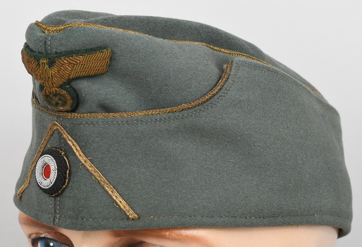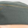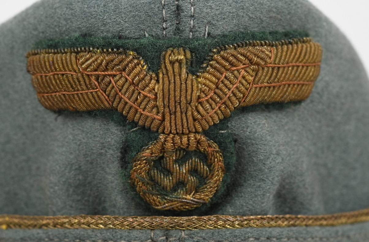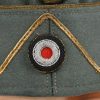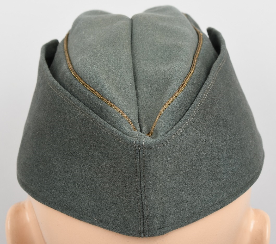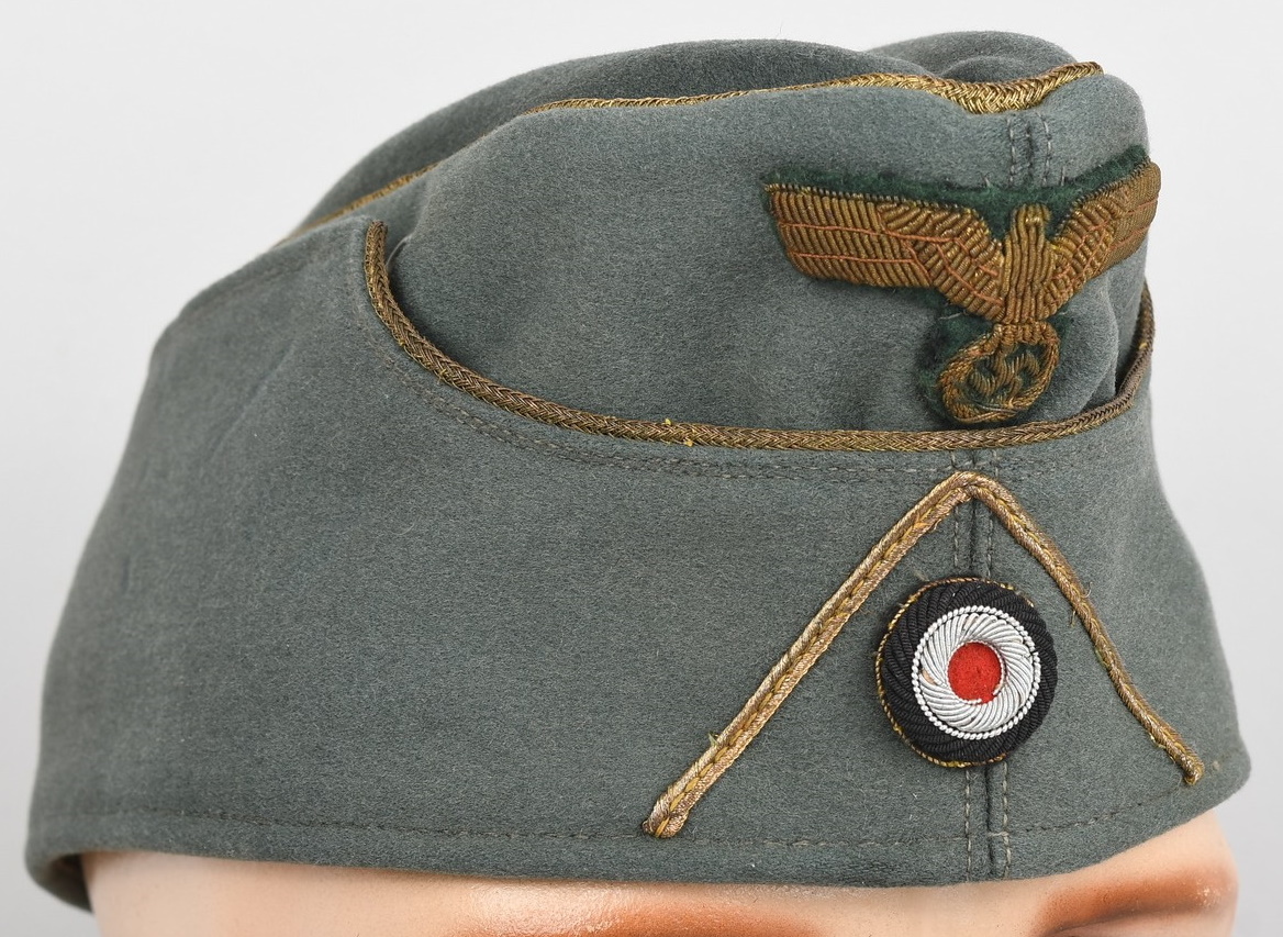 Constructed of high quality field-grey doeskin cloth. Fold down side and back panels with scalloped slopes to the forward side panels. The crown edge and the forward scalloped side panels are both piped in gilt braiding. The front center of the cap has a hand embroidered general’s national eagle in golden bullion threads on a cut-out bottle green wool base. The eagle is neatly handstitched to the cap. The front center of the fold down panels has a hand national tri-color cockade with gilt wire. The cockade is also neatly handstitched to the cap. The cockade is flanked by a golden soutache in an inverted “V” pattern. The soutache is applied in the proper manner being machine sewn in place and inserted through small puncture holes at the seam near the bottom edge of the cap. Inside is lined with silver/grey rayon cloth. Inside also with a intact partial sweatband. Cap is roughly a size 57. The cap shows clear signs of real use with color darkening to all exposed parts. Inside also shows color darkening to all exposed parts from grease, hair, fat, sweat and old hair products. All as expected to find from a well used cap. Exterior of the cap shows very light moth tracking to a couple of places.