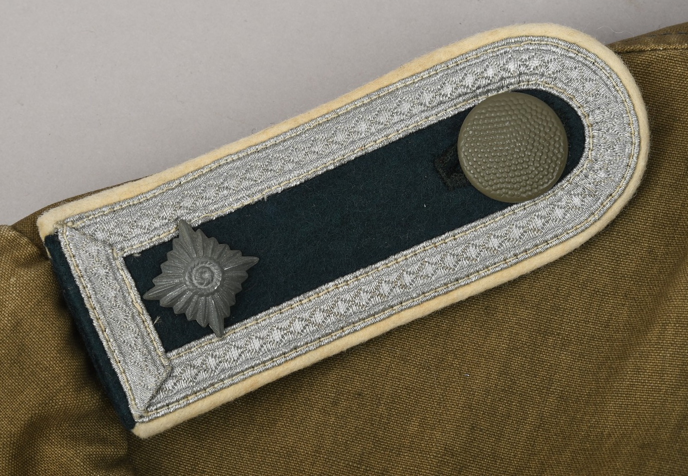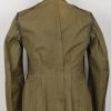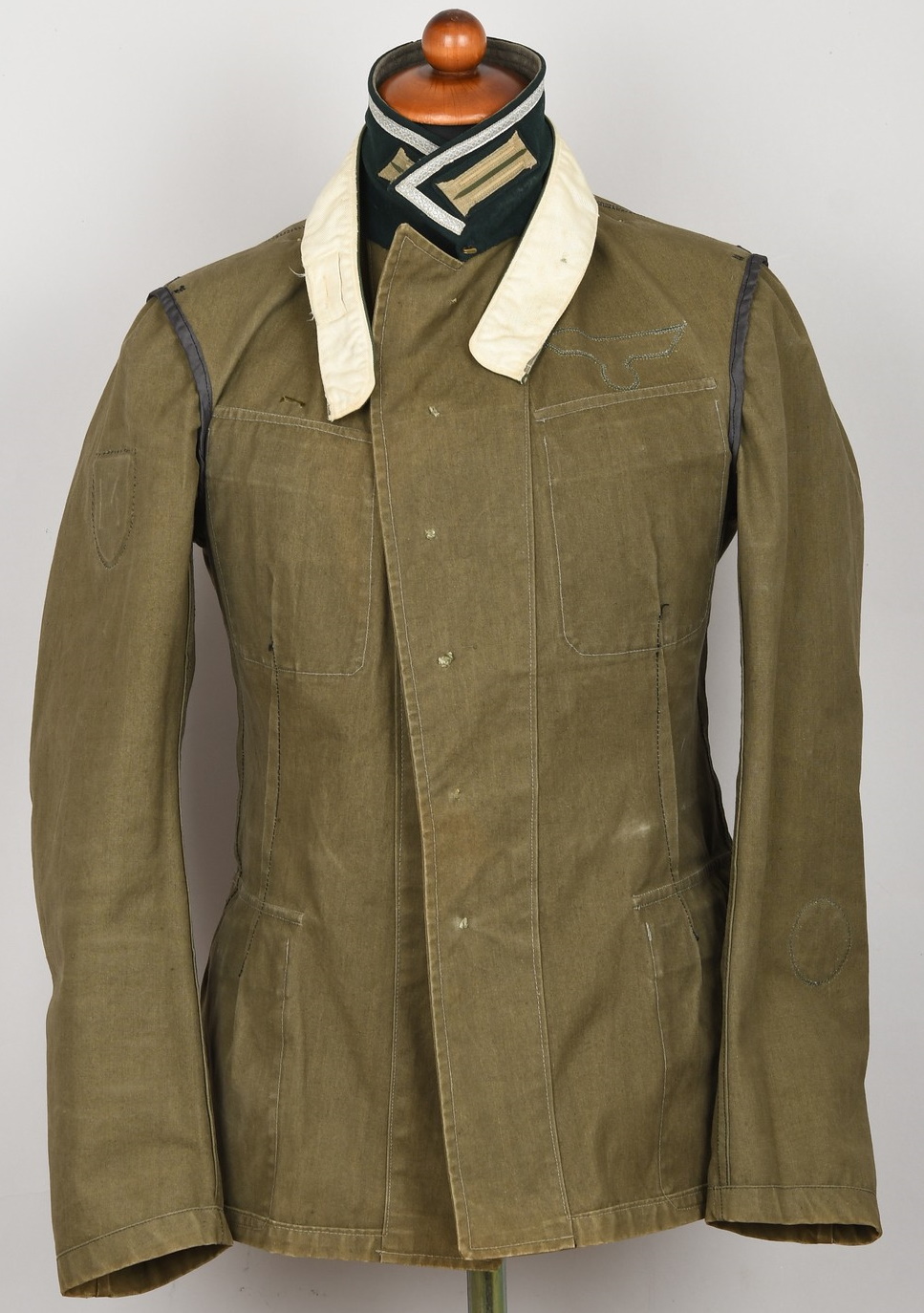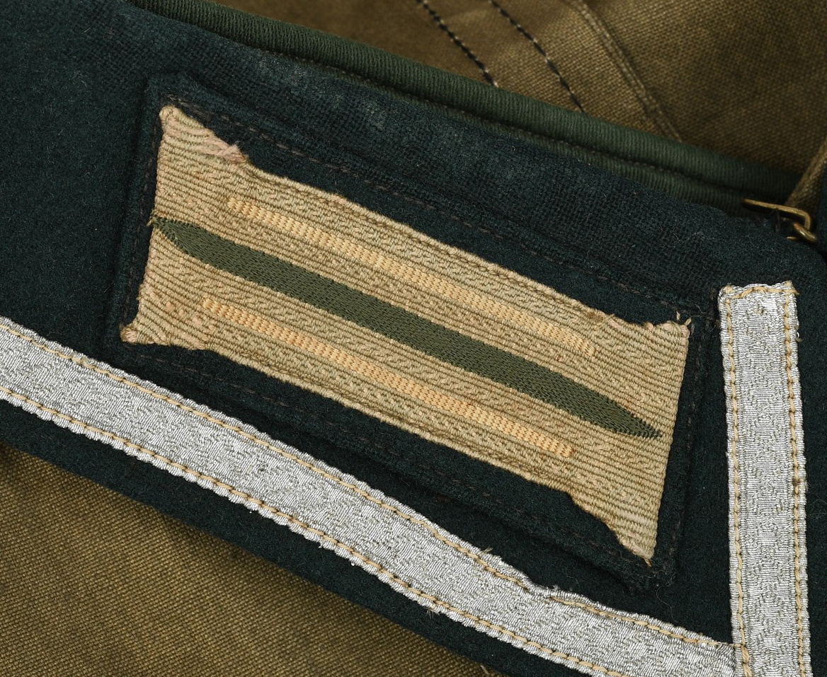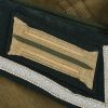 M36 style, light weight, cotton construction south front field tunic. The tunic has a six button front closure, a bottle green collar a singel metal hook and eye positioned at the forward neckline. The tunic has two, pleated, patch, breast pockets and two, pleated hip pockets. All pockets with scalloped edged, button down flaps. The right breast has a EM/NCO’s national eagle in grey cotton threads on a cut-out dark green rayon base. The eagle is machine sewn to the tunic. The tunic has early second pattern slip-on shoulder straps, dark green base with white wool piping, silver/aluminum nco tresse and a singel alloy metal rank pip pinned in place. Machine sewn to the collar is a pair of issue, Infantry em/nco’s collar tabs. To the left breast pocket is award loops sewn for two awards and above the pocket is a east front ribbon bar attached through retaining loops. The ribbon bar comes with the tunic. To the left upper sleeve is KRIM shield neatly hand sewn in place. To the right lower sleeve is a NCO radio operator trade patch netaly hand sewn in place. Interior is unlined. The tunic shows light signs of age and real use, all insignias match perfectly in condition and are original to the tunic. No holes, rips, mendings or larger staisns. The tunic comes with a protective inner collar.