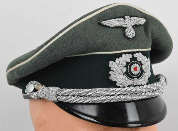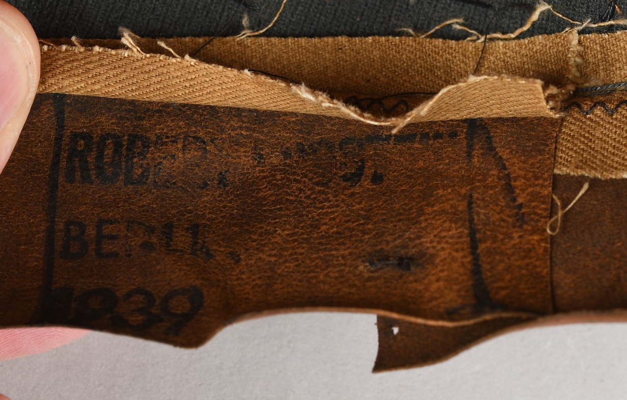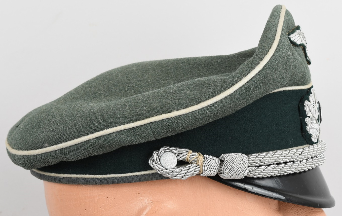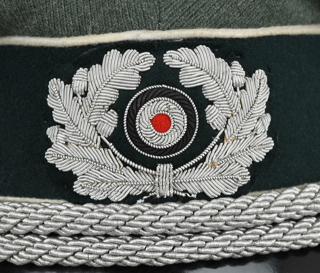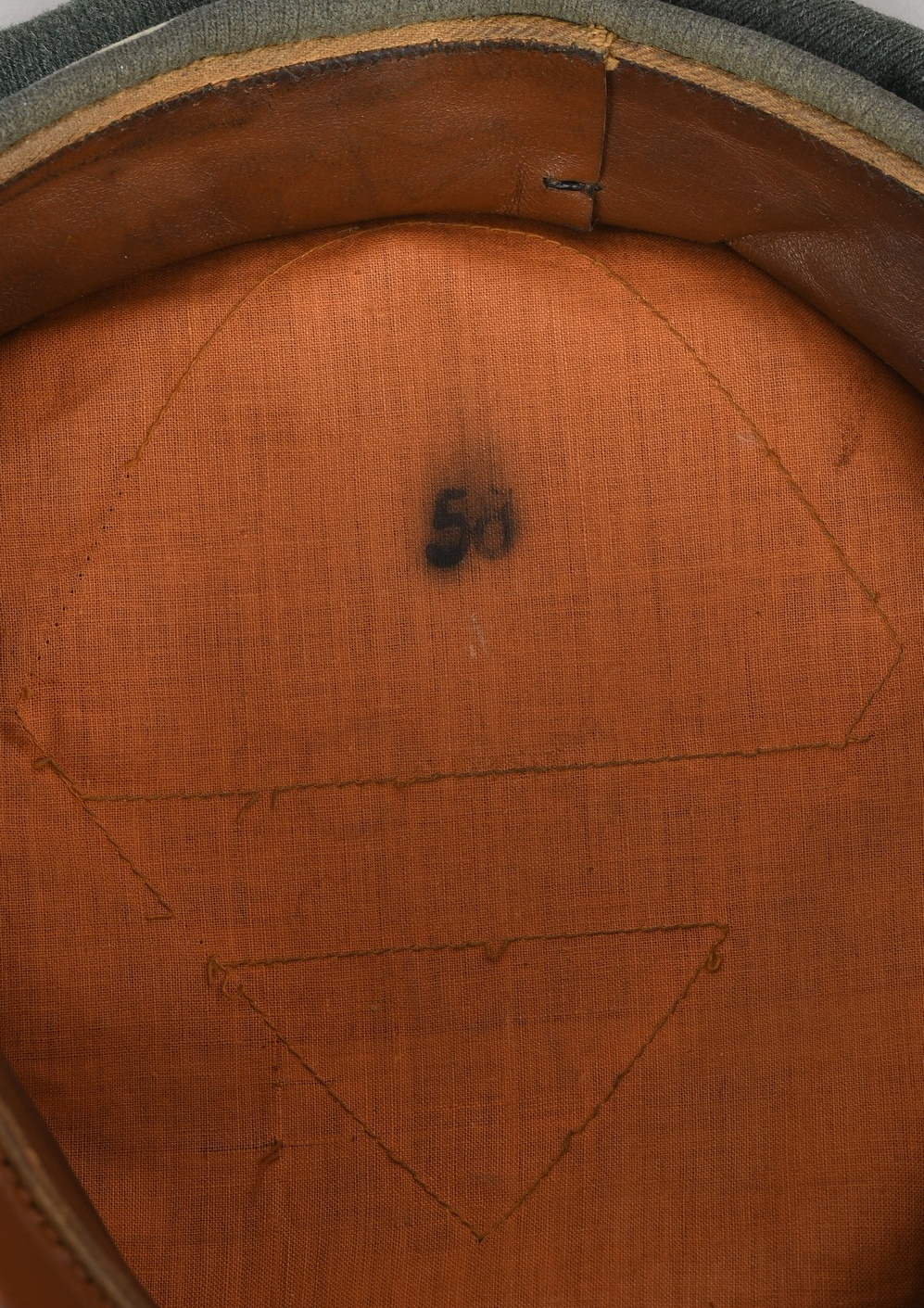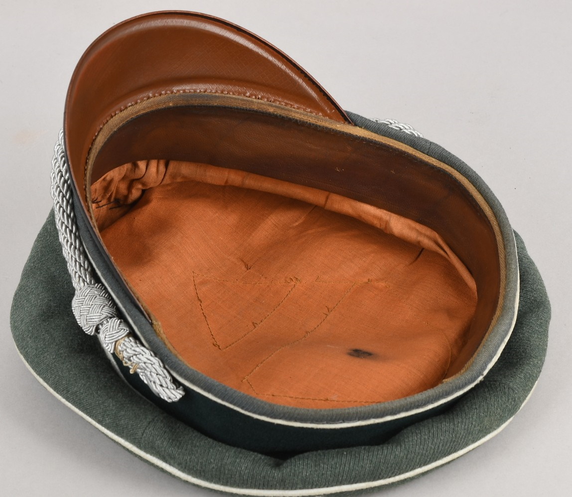 Issu EM/Nco issue visor war time upgraded to Officer. Constructed of field-grey tricot cloth with a dark green badge cloth centerband and trimmed white wool branch color piping to the crown edge and both the top and bottom edges of the centerband. The front center of the cap features a high quality, early pattern, hand embroidered national eagle with short, wings in bright, silver/aluminum and bullion wire threads on a dark green cloth base. The front center of the centerband has a hand embroidered, oak-leaf wreath and cockade in bright, silver/aluminum wire threads. Both the eagle and wreath are neatly handsewn to the cap. The cap has a twisted silver/aluminum chin cord which is secured in place by two small, silver washed, buttons. The cap has a black lacquered vulcanfibre visor. Inside is lined with orange/brown cotton (indicating early production) drill cloth. Brown leather sweatband is also complete withour rips, tears or mendings. Sweatband is nicely stamped with manufacturers name “Robert Lubstein” (Erel), Berlin 1939″. Sweat shield diamond is missing and lining is size stamped “58” in black ink.