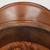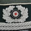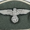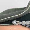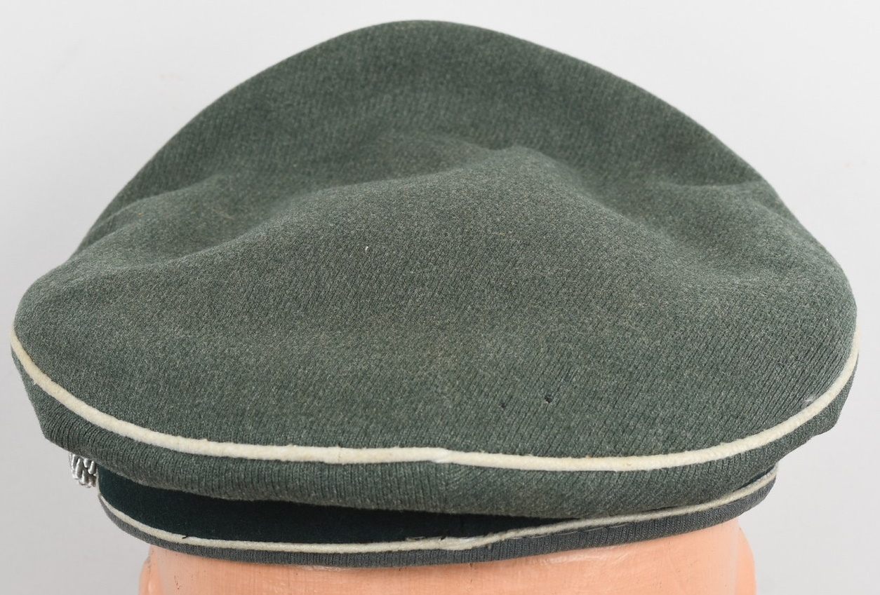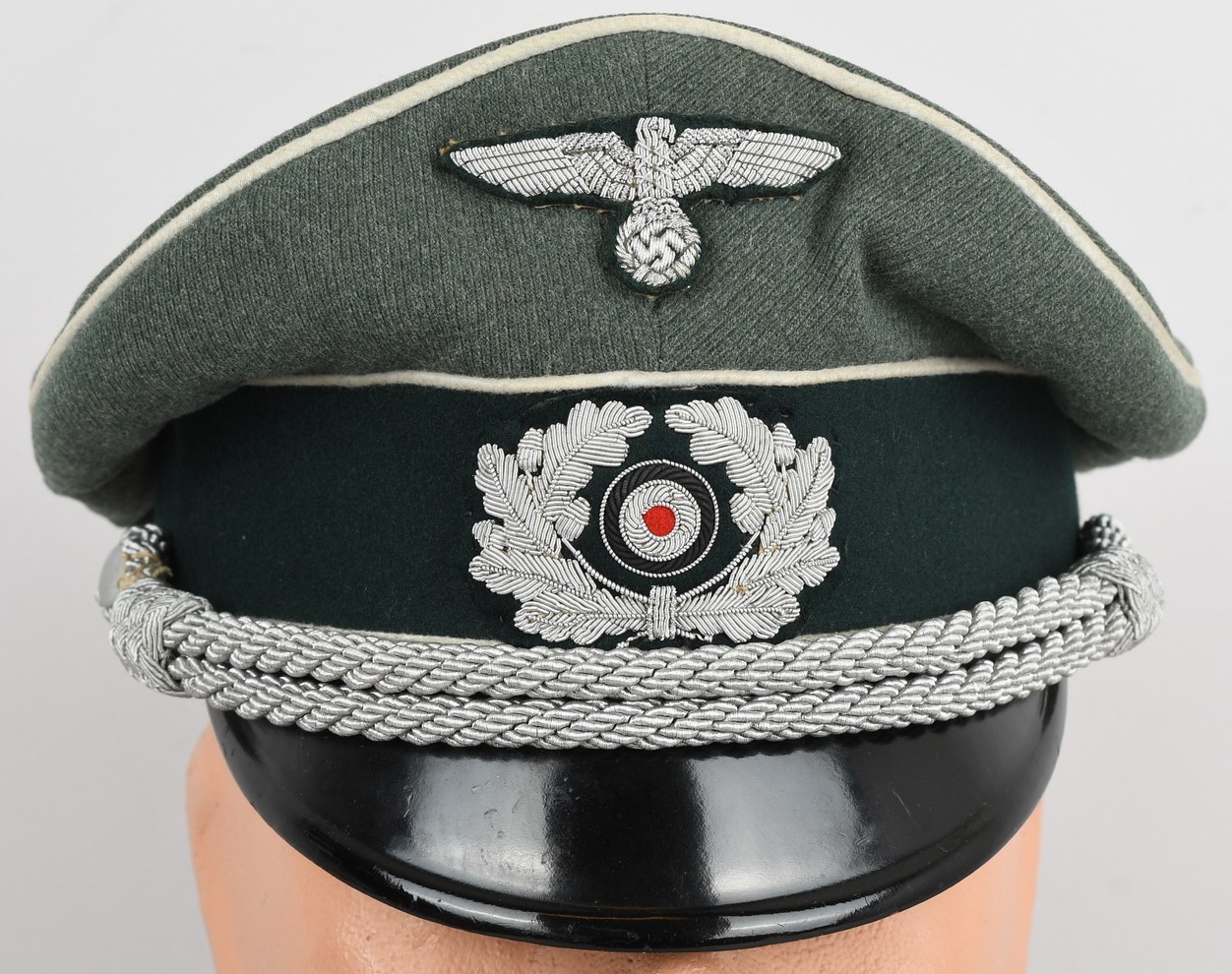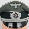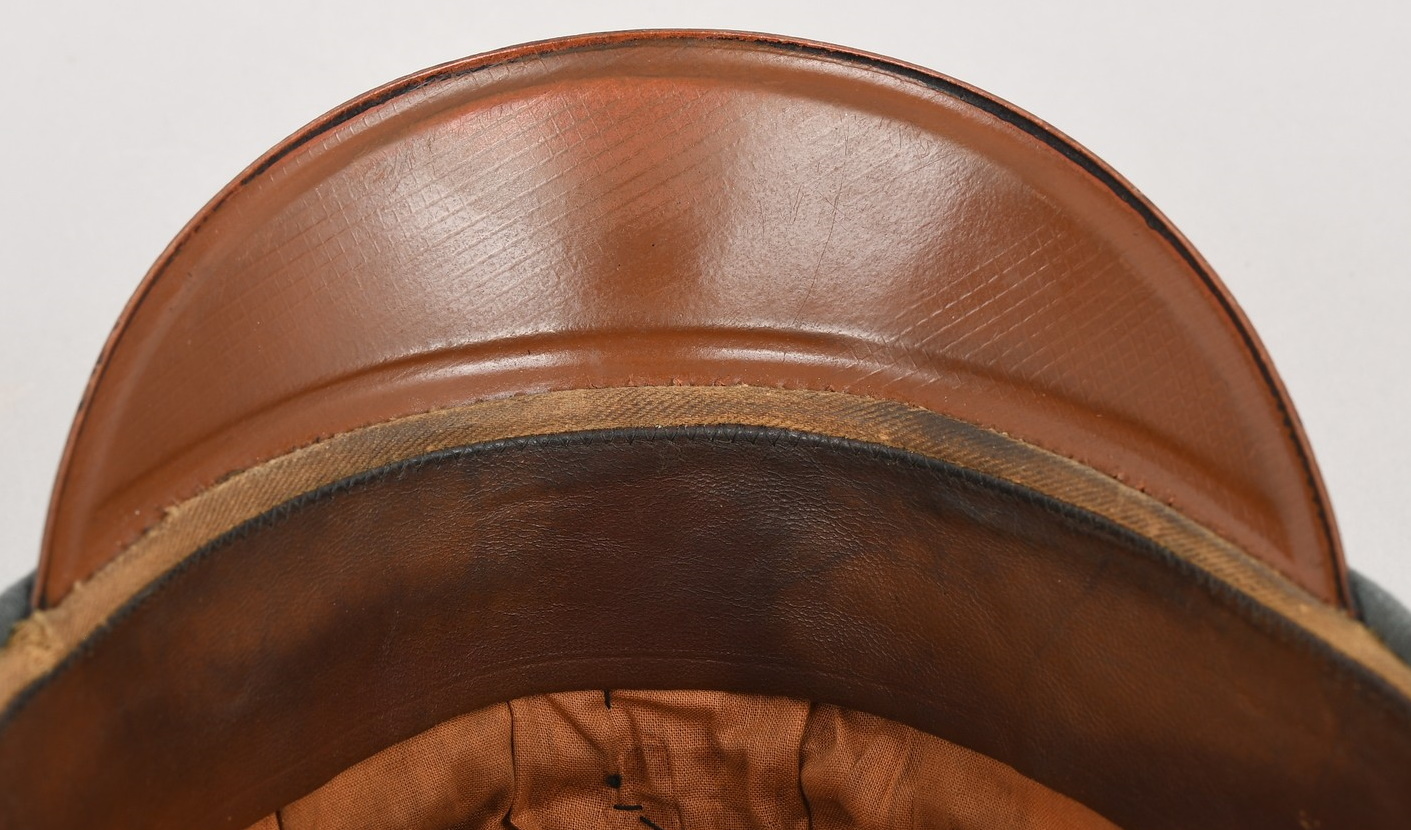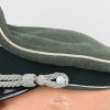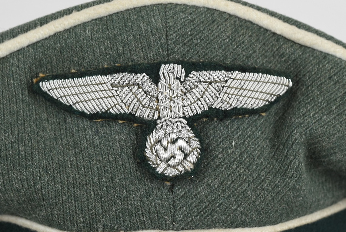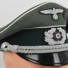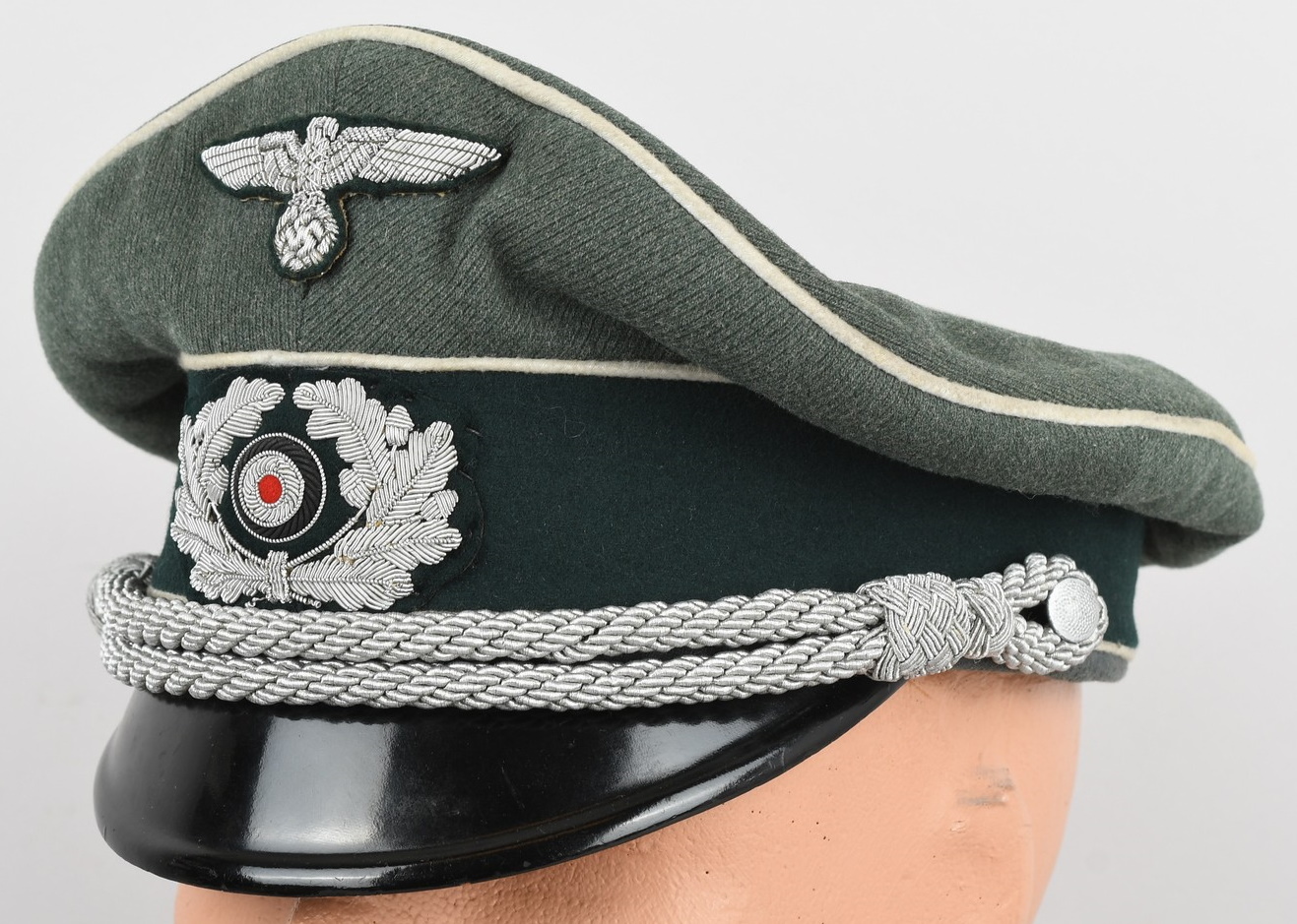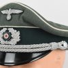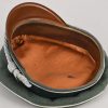 Issu EM/Nco issue visor war time upgraded to Officer. Constructed of field-grey tricot cloth with a dark green badge cloth centerband and trimmed white wool branch color piping to the crown edge and both the top and bottom edges of the centerband. The front center of the cap features a high quality, early pattern, hand embroidered national eagle with short, wings in bright, silver/aluminum and bullion wire threads on a dark green cloth base. The front center of the centerband has a hand embroidered, oak-leaf wreath and cockade in bright, silver/aluminum wire threads. Both the eagle and wreath are neatly handsewn to the cap. The cap has a twisted silver/aluminum chin cord which is secured in place by two small, silver washed, buttons. The cap has a black lacquered vulcanfibre visor. Inside is lined with orange/brown cotton (indicating early production) drill cloth. Brown leather sweatband is also complete withour rips, tears or mendings. Sweatband is nicely stamped with manufacturers name “Robert Lubstein” (Erel), Berlin 1939″. Sweat shield diamond is missing and lining is size stamped “58” in black ink.