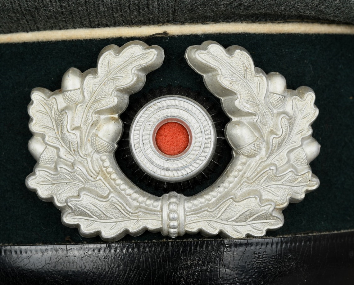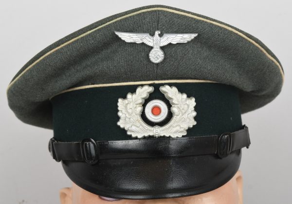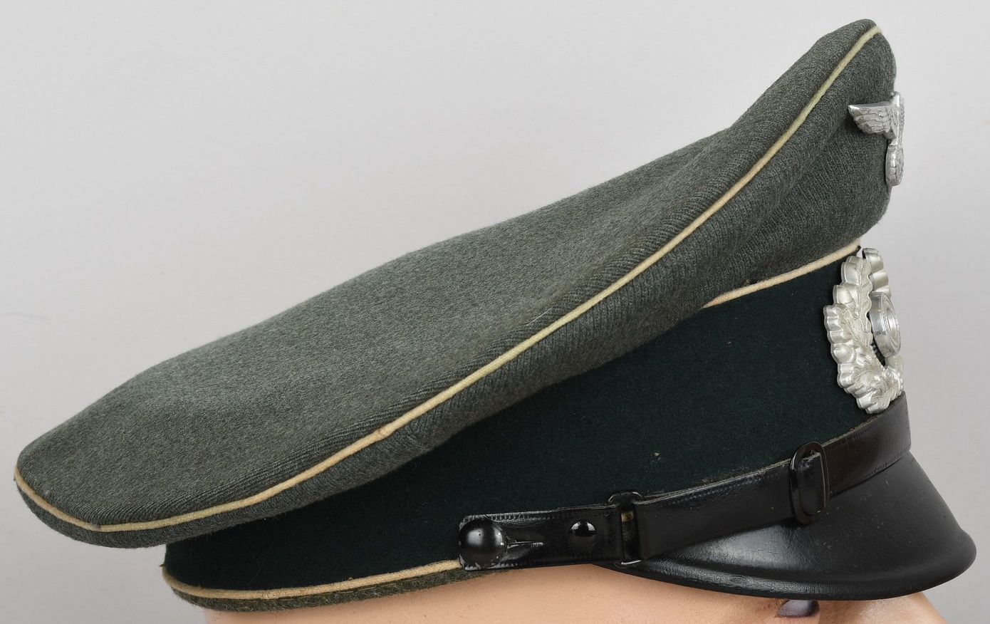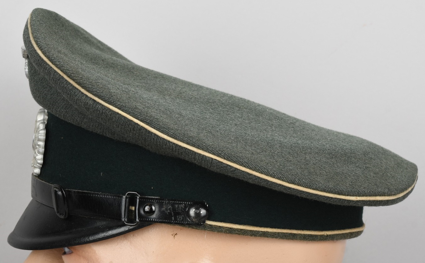 Early produced infantry EM/NCO´s visor cap made of field-grey tricot cloth with white, trimmed wool piping. Piping denots service in the Infantry. Pinned in place to the front is a silver washed alloy national eagle and wreath/cockade as well as EM/NCO´s black leather chincord.