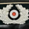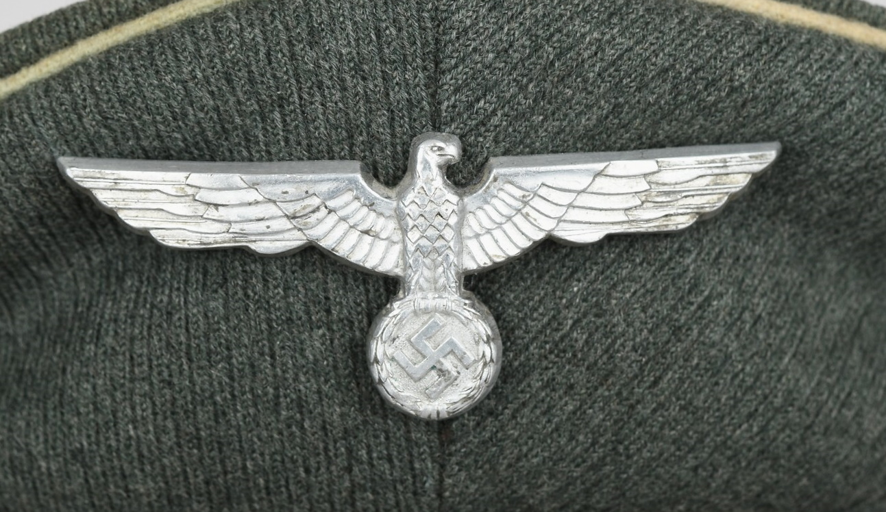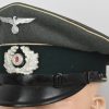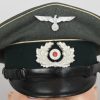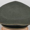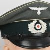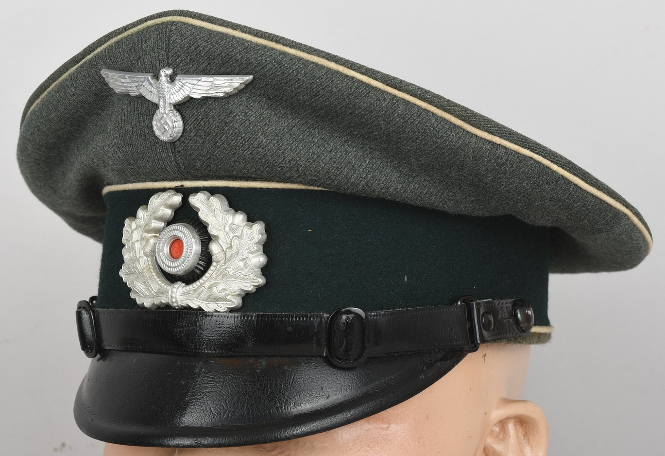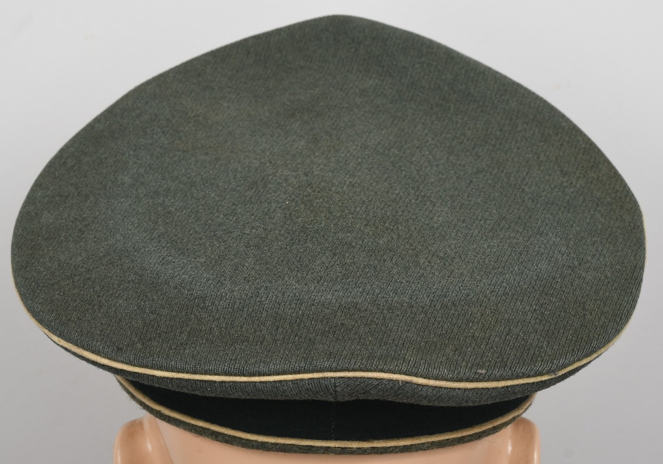 Early produced infantry EM/NCO´s visor cap made of field-grey tricot cloth with white, trimmed wool piping. Piping denots service in the Infantry. Pinned in place to the front is a silver washed alloy national eagle and wreath/cockade as well as EM/NCO´s black leather chincord.