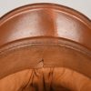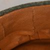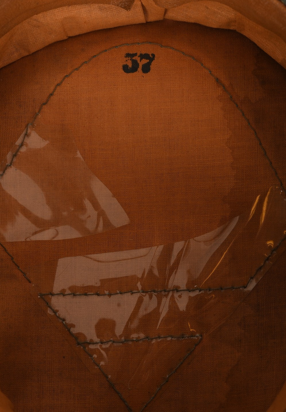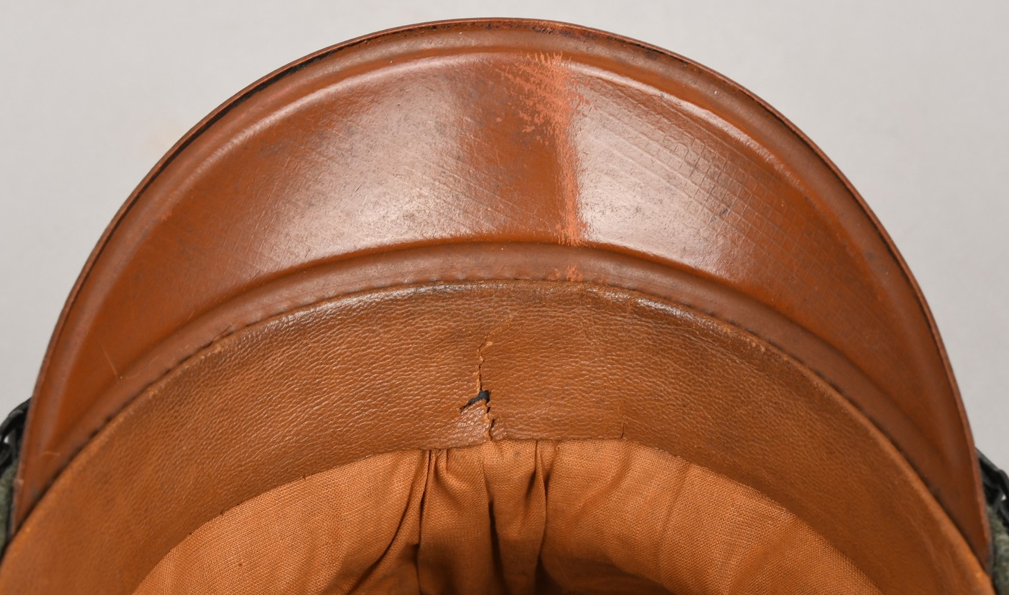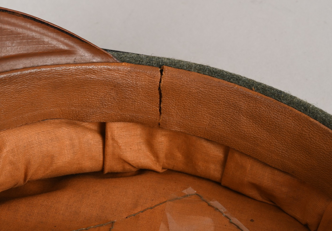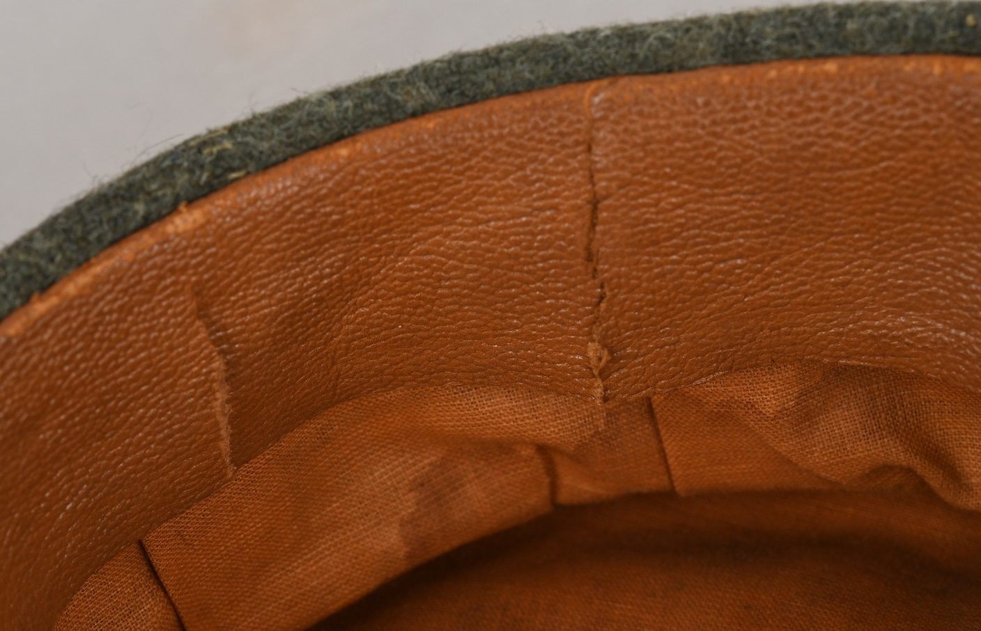Inside cap is lined with early orange/brown drill cloth. Cap still have 50% of it´s original sweat shield still intact. The cap is maker marked stamped “57” in black ink. Brown leather sweatband is all intact with three tears. Cap is in a good little used condition. No holes, rips, mendings or stains.