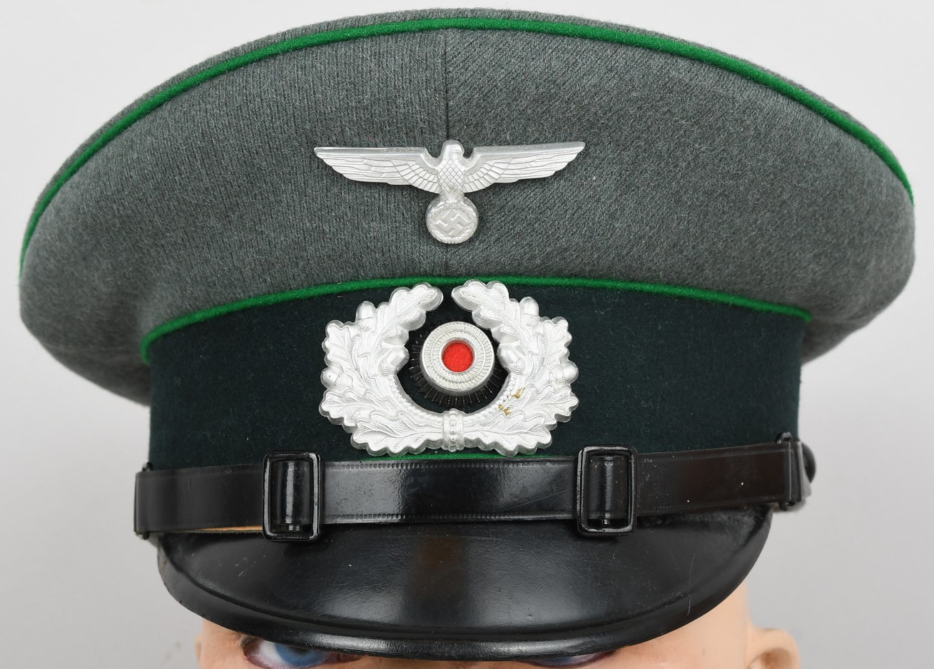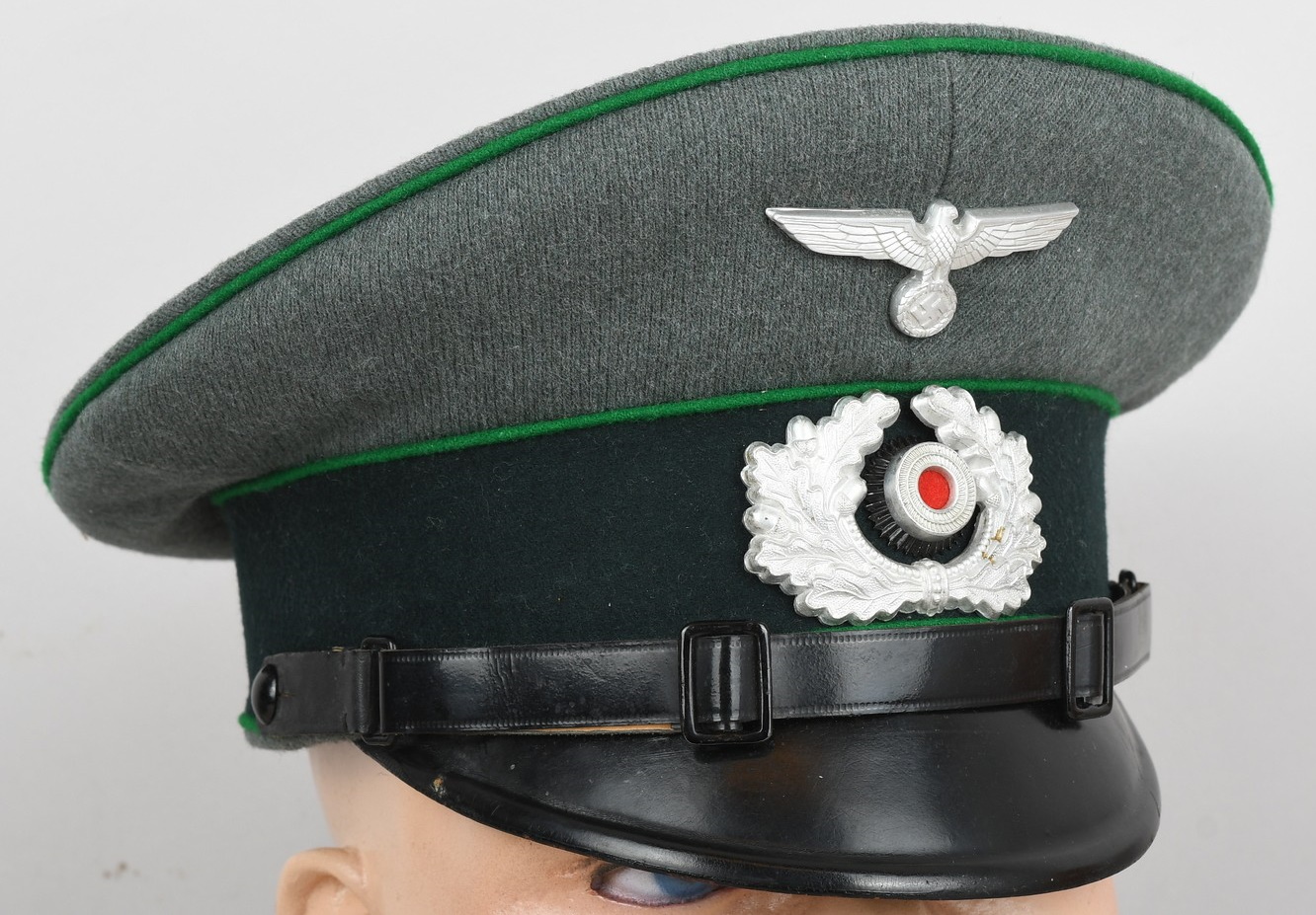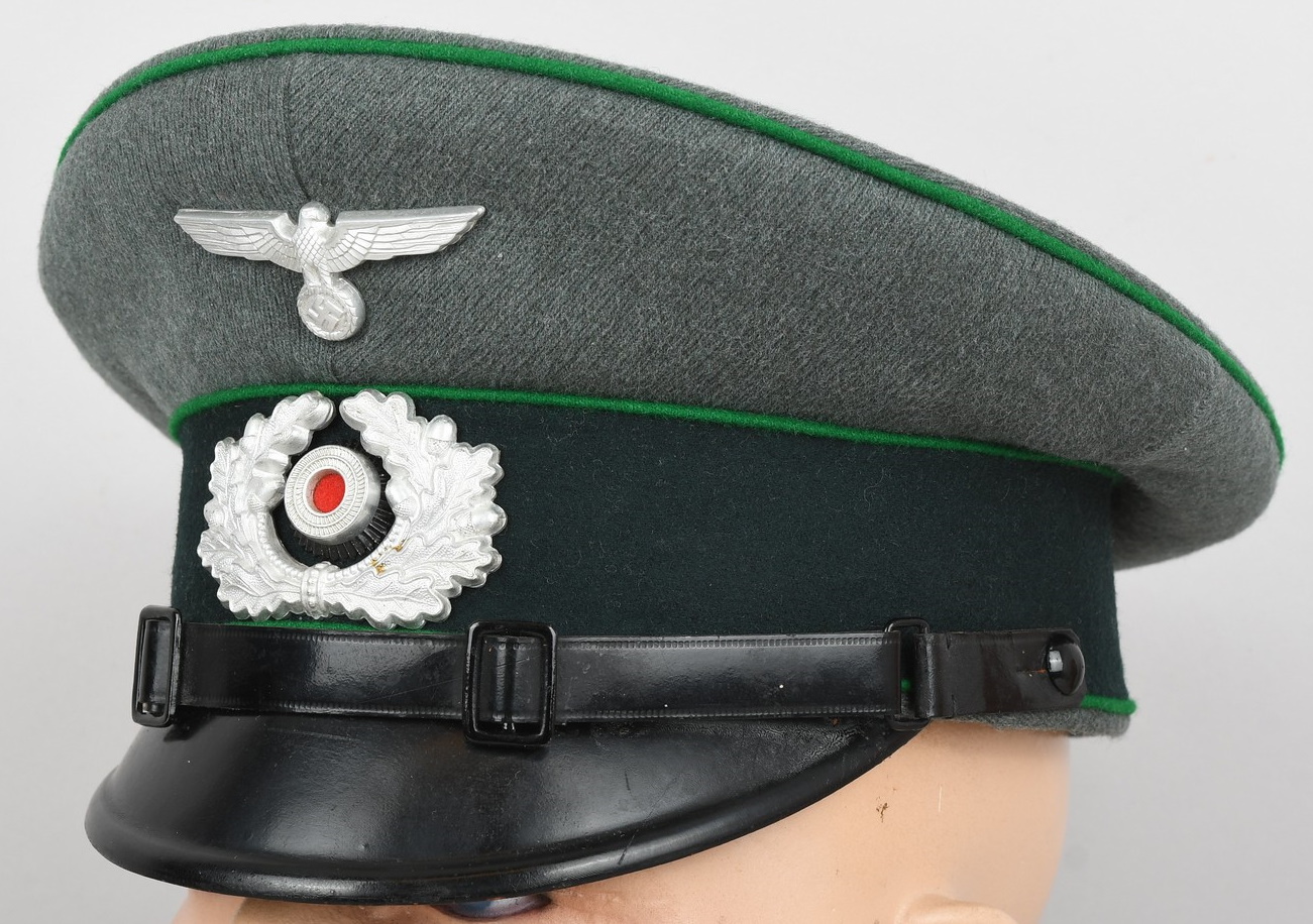 Early produced infantry EM/NCO´s visor cap made of field-grey tricot cloth with green, trimmed wool piping. Pinned in place to the front is a early Aluminum, silver washed alloy national eagle and wreath/cockade as well as EM/NCO´s black laquered leather chincord.