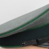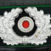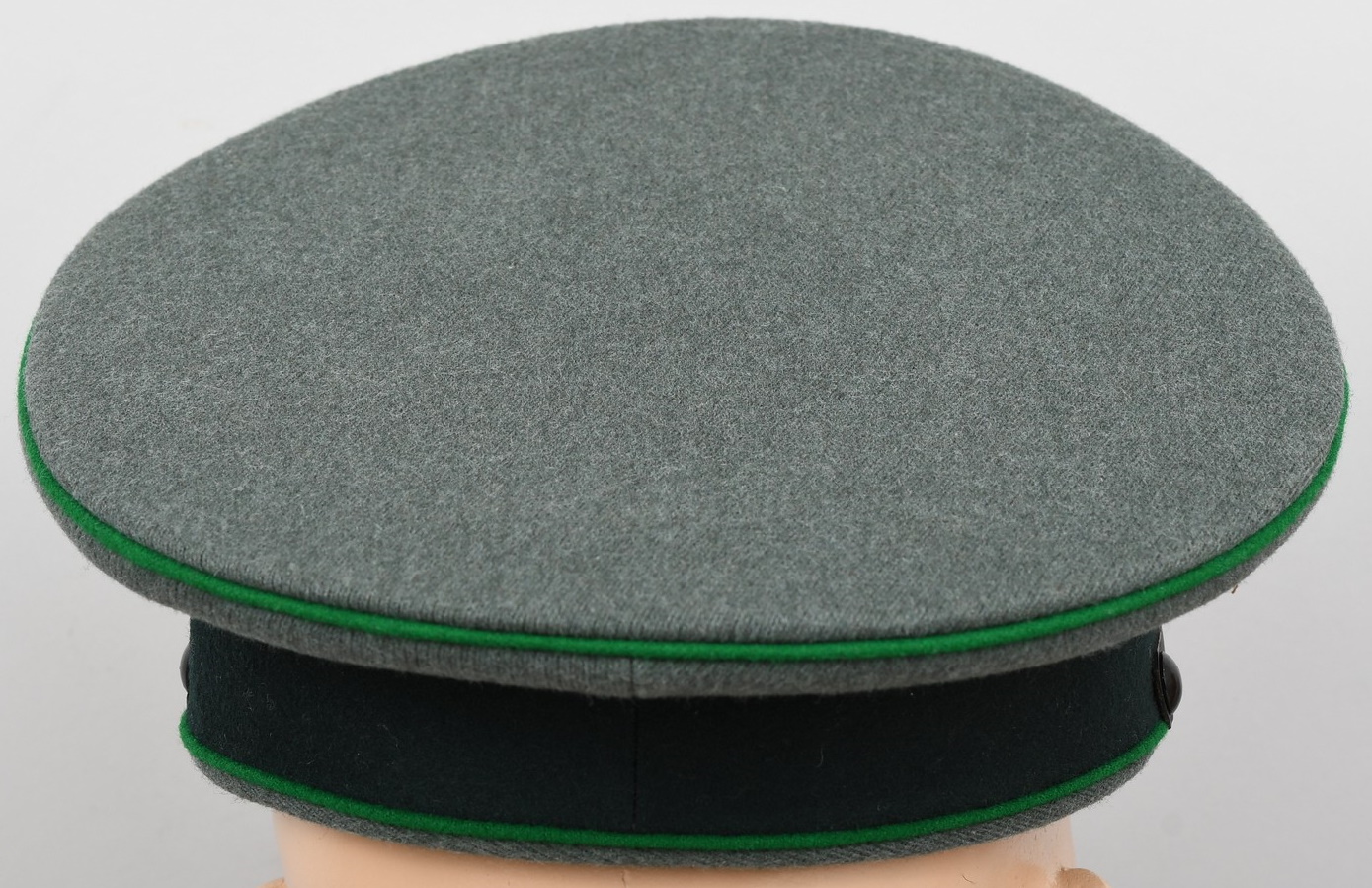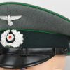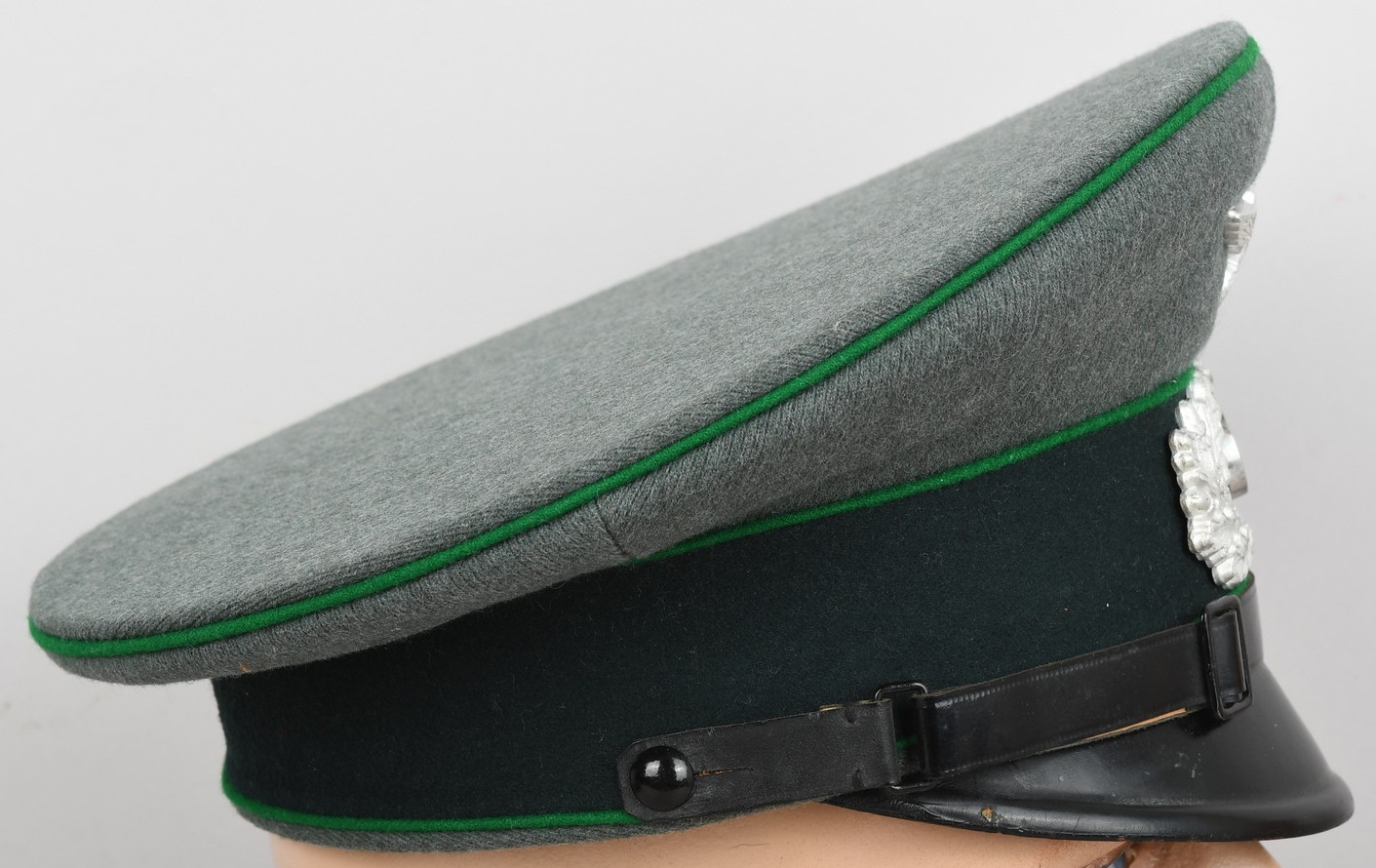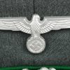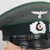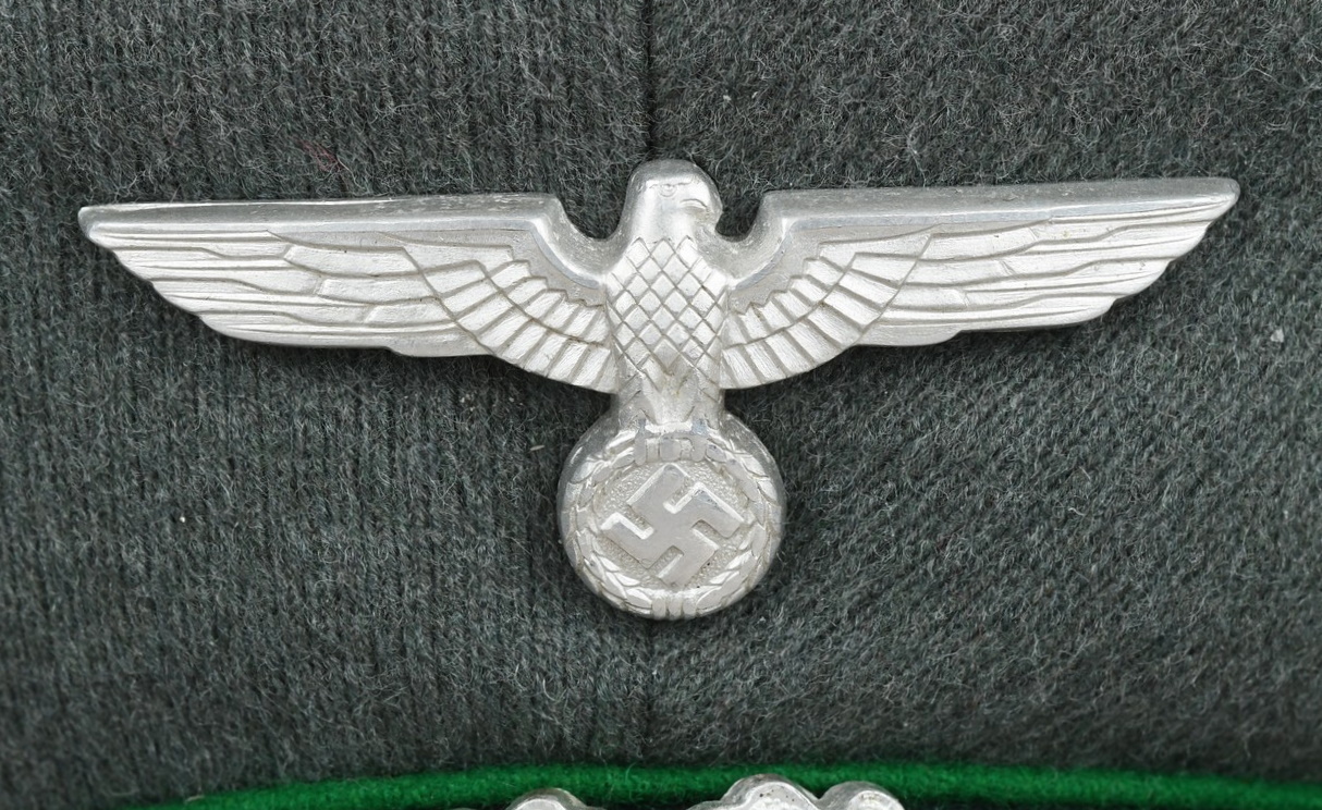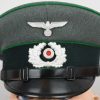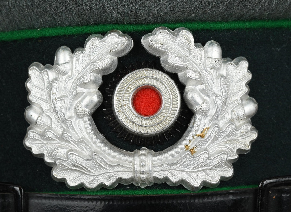 Early produced infantry EM/NCO´s visor cap made of field-grey tricot cloth with green, trimmed wool piping. Pinned in place to the front is a early Aluminum, silver washed alloy national eagle and wreath/cockade as well as EM/NCO´s black laquered leather chincord.