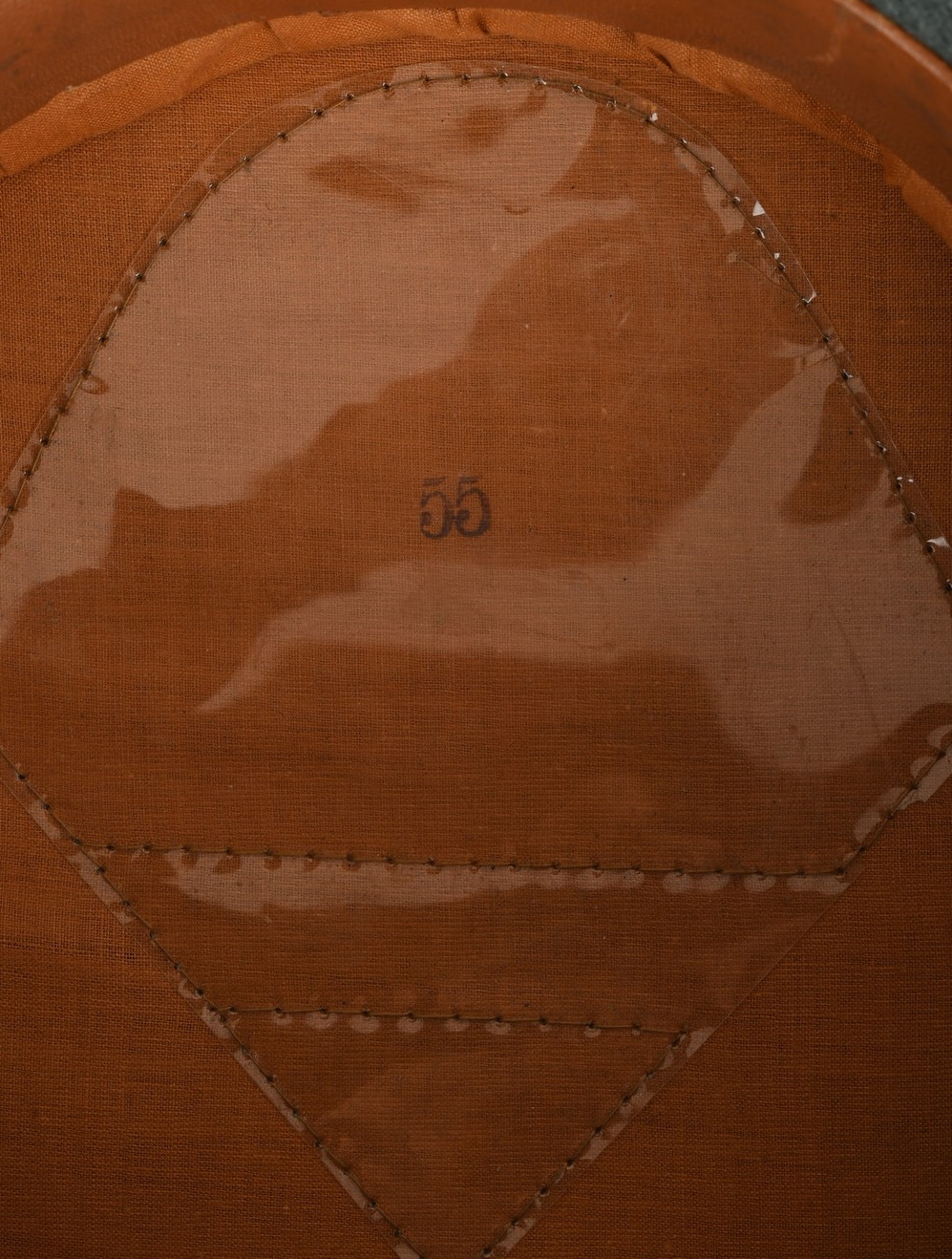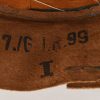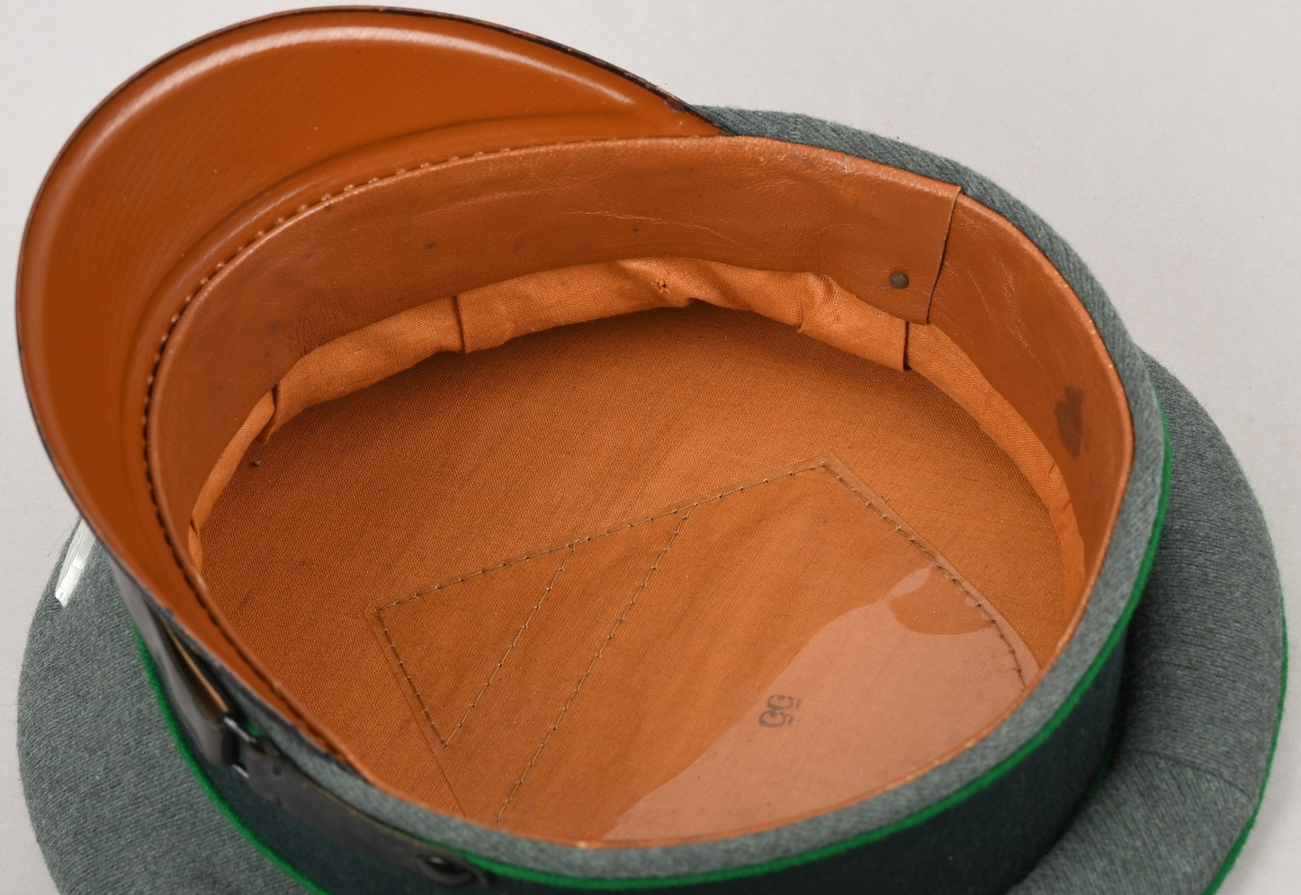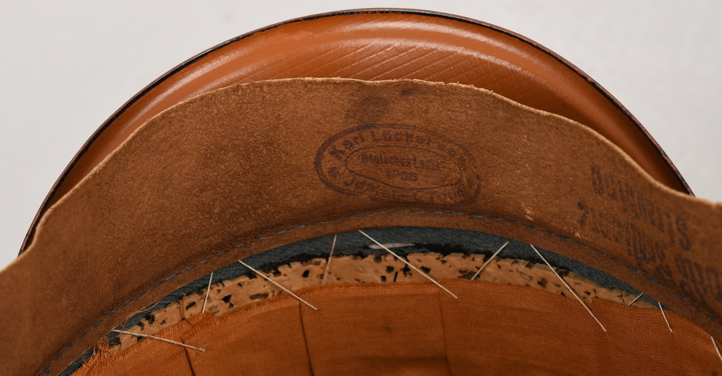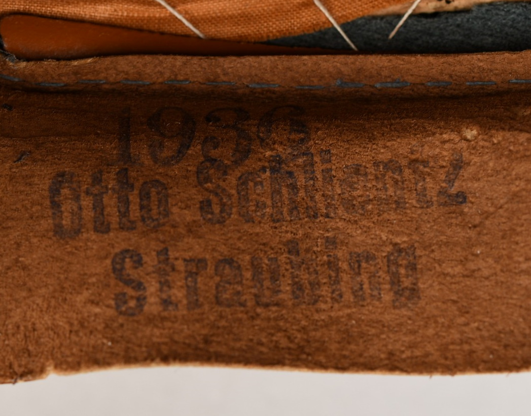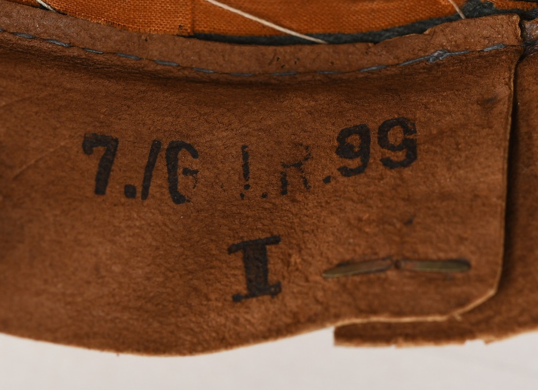 Inside cap is lined with early orange/brown drill cloth. Cap still have it´s original sweatshield still all intact. The cap is size stamped “55” in black ink beneath the sweatshield. Brown leather sweatband is all intact. Sweatband is clearly marked in three different places. The most interesting is a unit stamp which reads: “7./G.J.R 99”. The cap has also a clear cap maker stamp and year of production 1936. The sweatband is also maker stamped. Cap is in very good, little used condition. No holes, rips, mendings or stains.