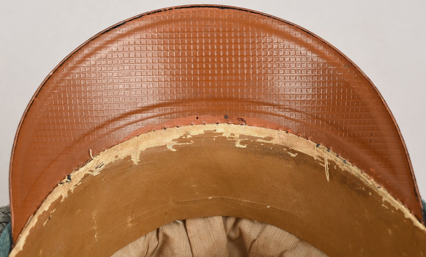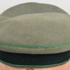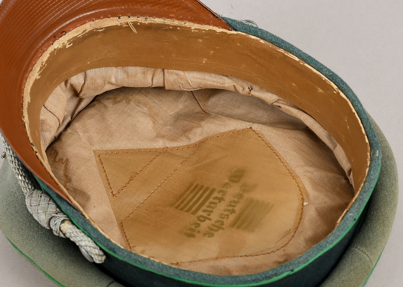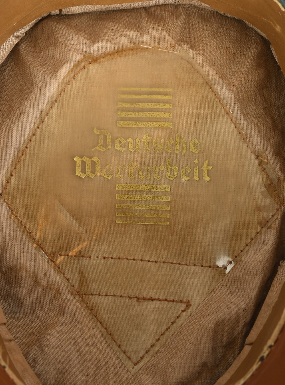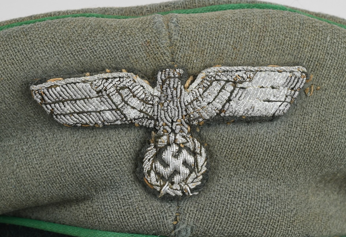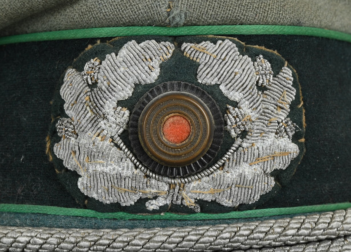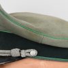 Late war produced jäger officers visor cap is in well worn condition constructed of doeskin cloth. Cap has bullion eagle as well as wreath/cockade. Also to front Officers Heavy Chin cord. Cap is piped with Jäger green rayon piping. Inside is lined with tan woven cotton material. Sweatshield all intact and well marked “Deutsche Wertarbeit”. “Erzatz” leather sweatband also all intact.