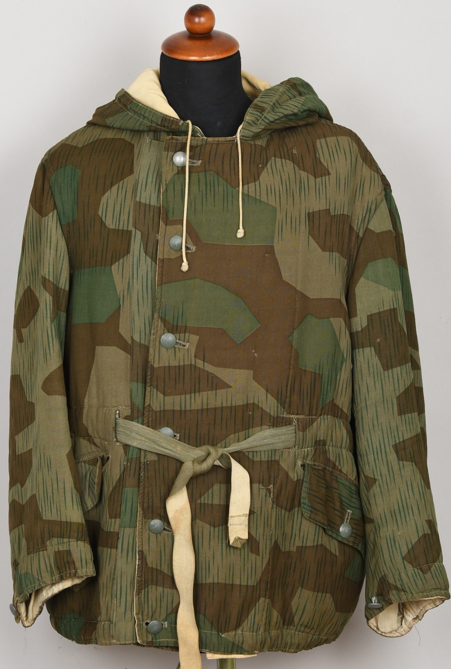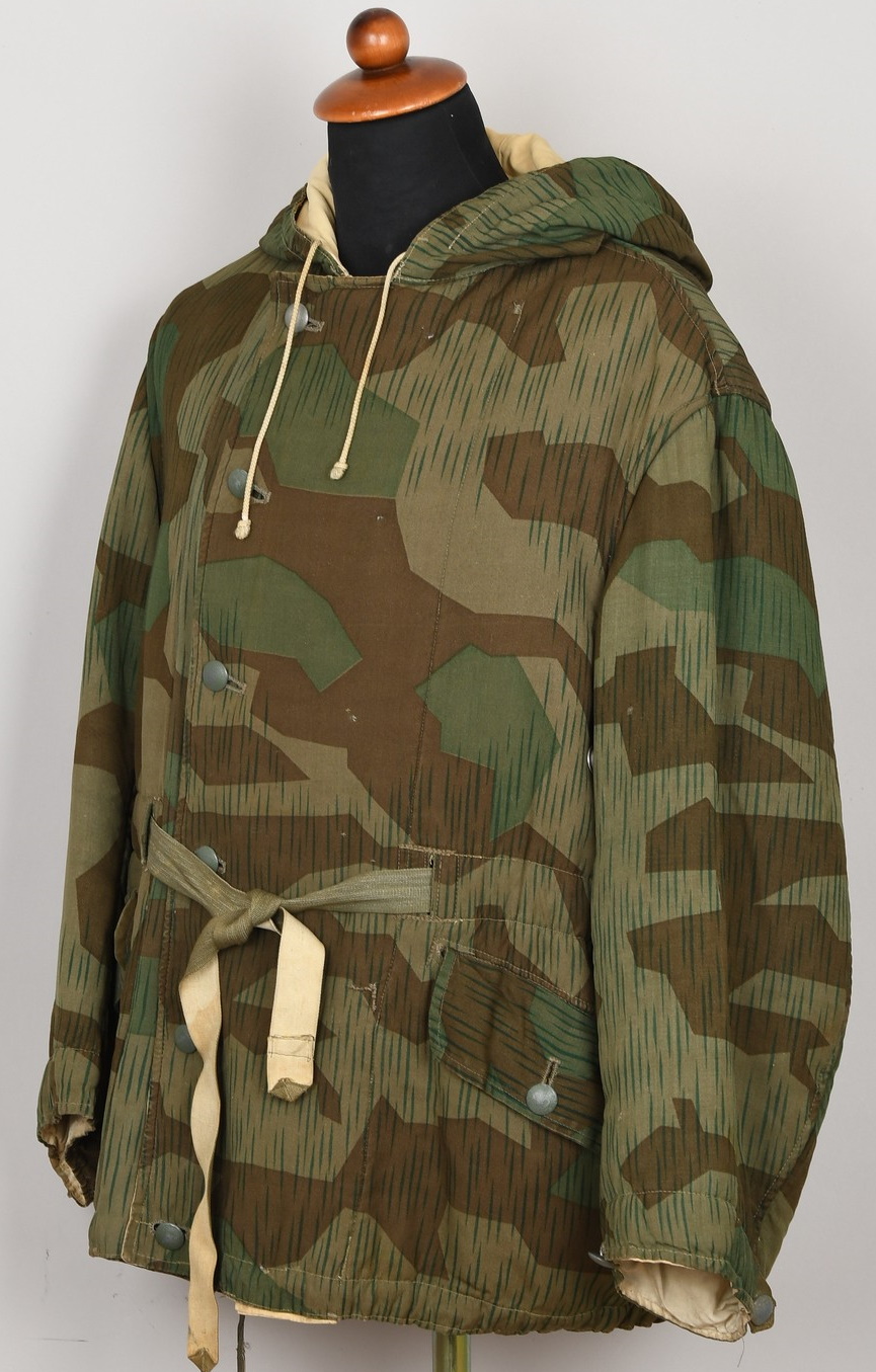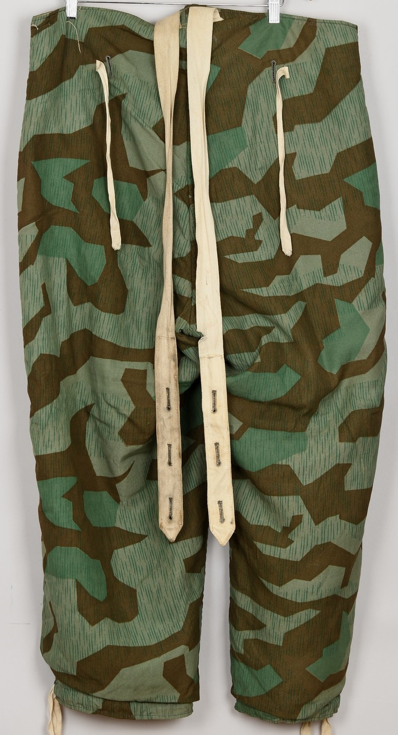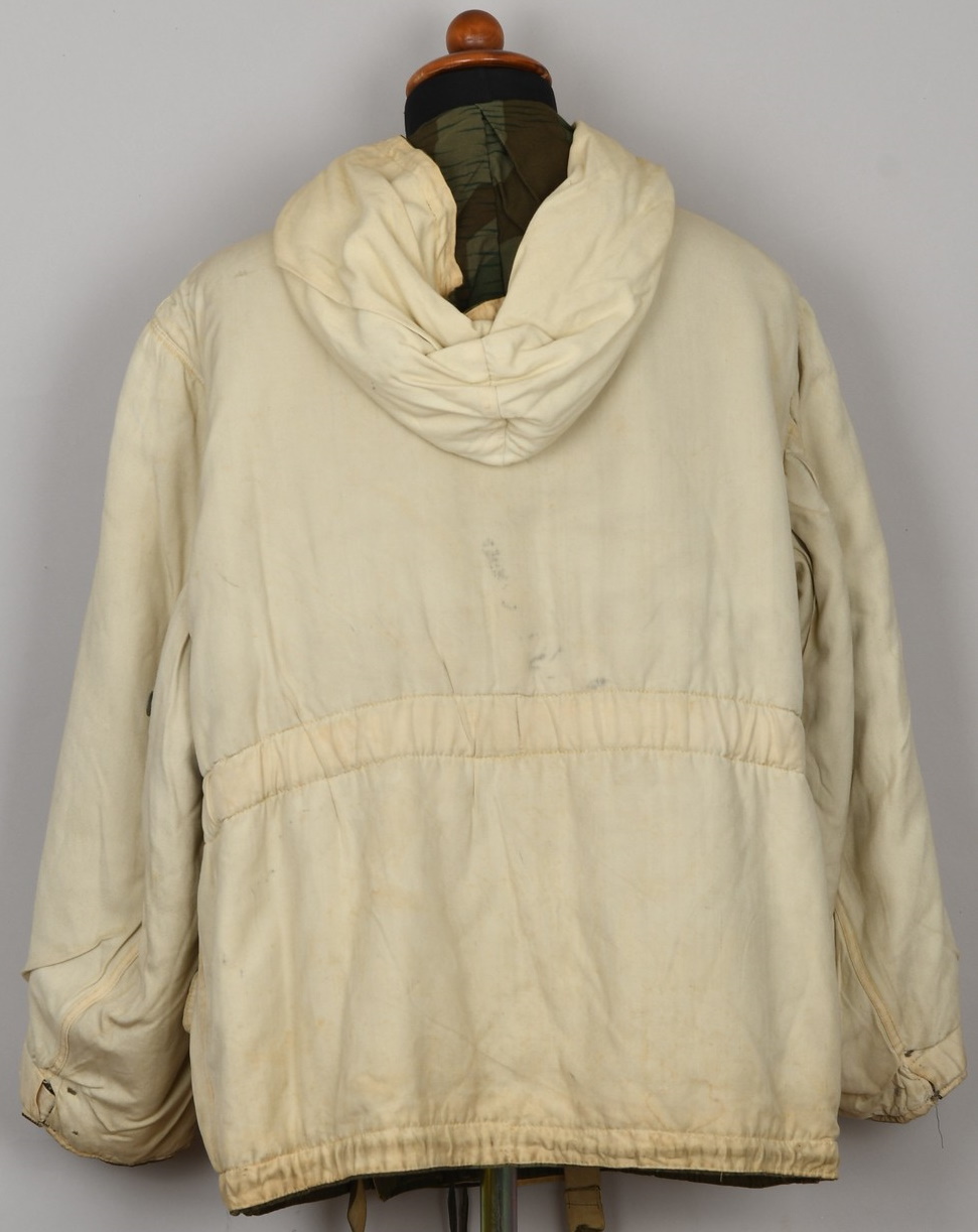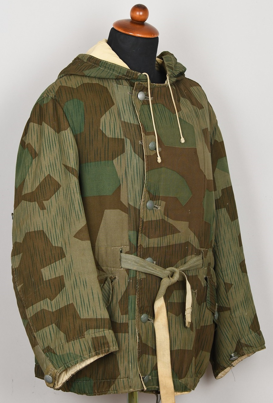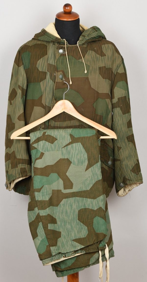 Heer / Luftwaffe winter parka and trouser set in splinter pattern. Both trousers and parka retain very strong, vivid and contrasting colors. The set retains all original factory applied buttons, hood drawstring and leg ties. Trousers even has the often missing original suspenders. The set shows light signs of use and age. The white side has one small 4cm x 4cm repair which appears to be war time made.