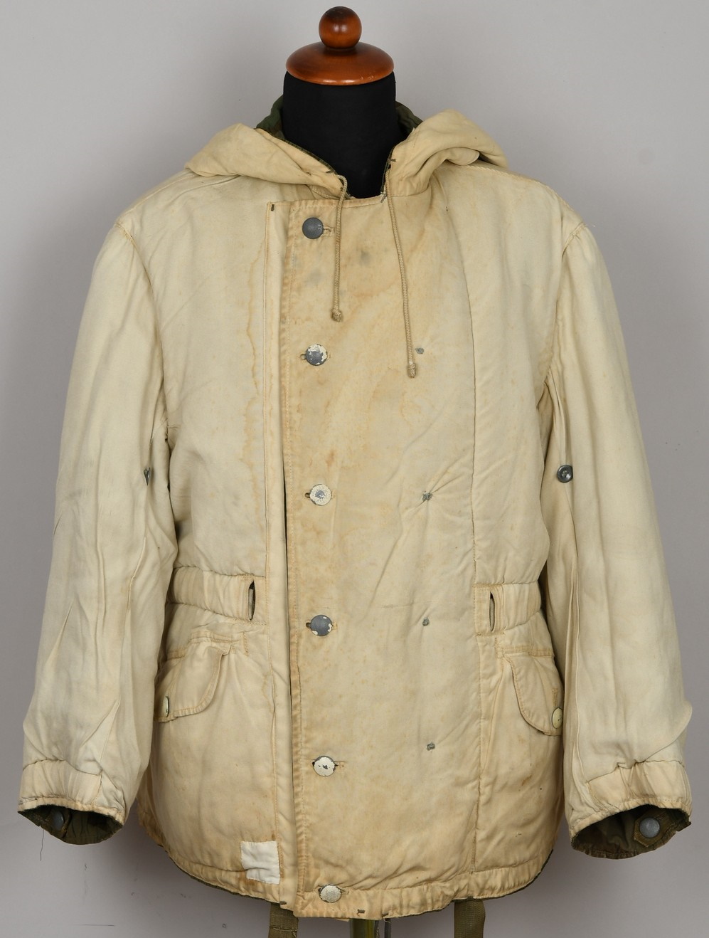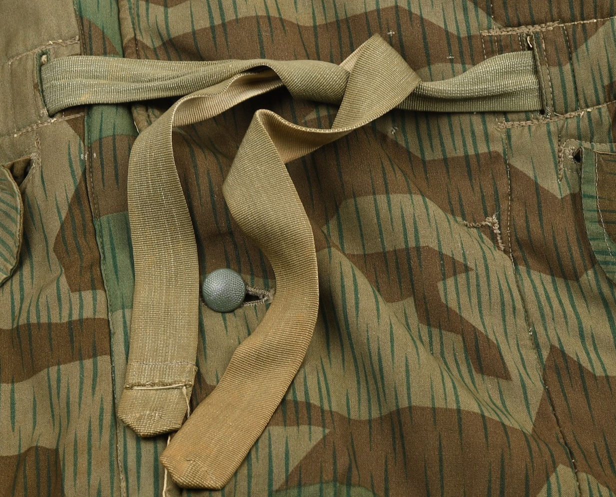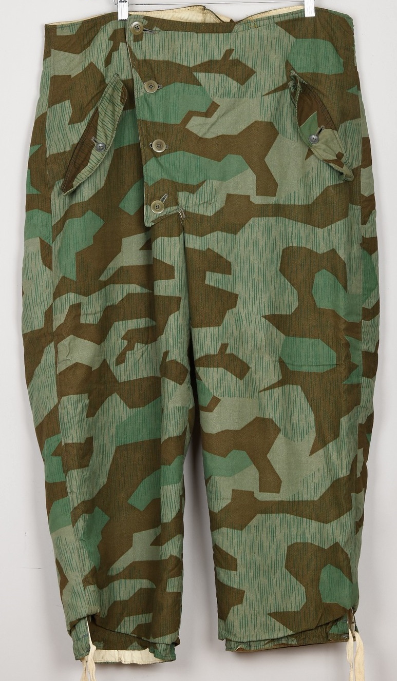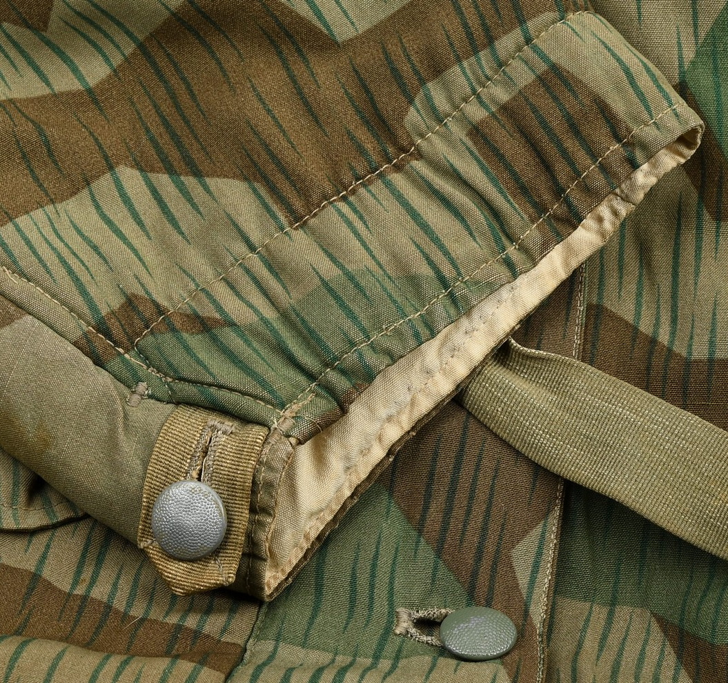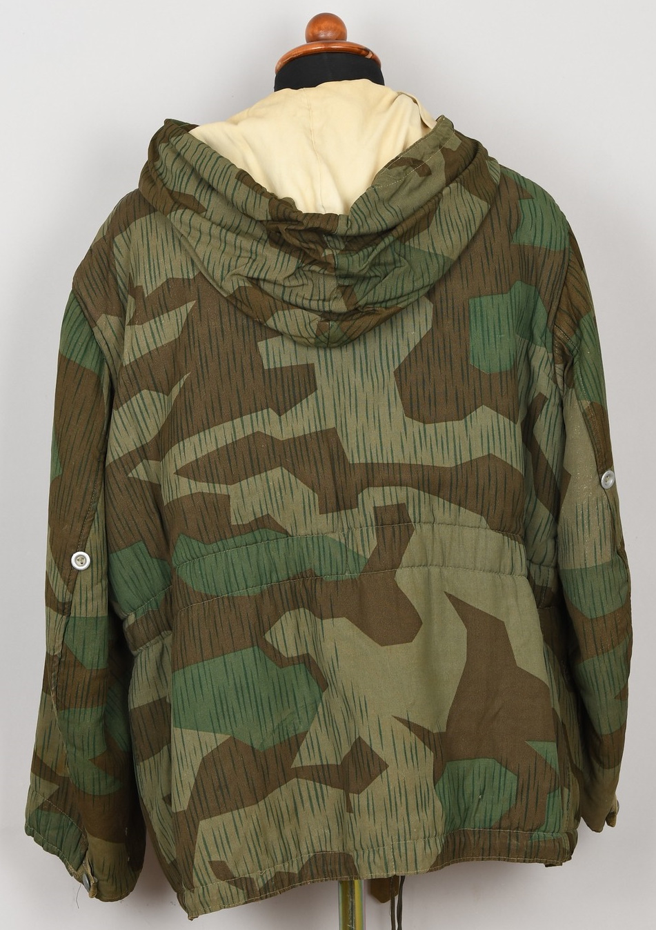 Heer / Luftwaffe winter parka and trouser set in splinter pattern. Both trousers and parka retain very strong, vivid and contrasting colors. The set retains all original factory applied buttons, hood drawstring and leg ties. Trousers even has the often missing original suspenders. The set shows light signs of use and age. The white side has one small 4cm x 4cm repair which appears to be war time made.