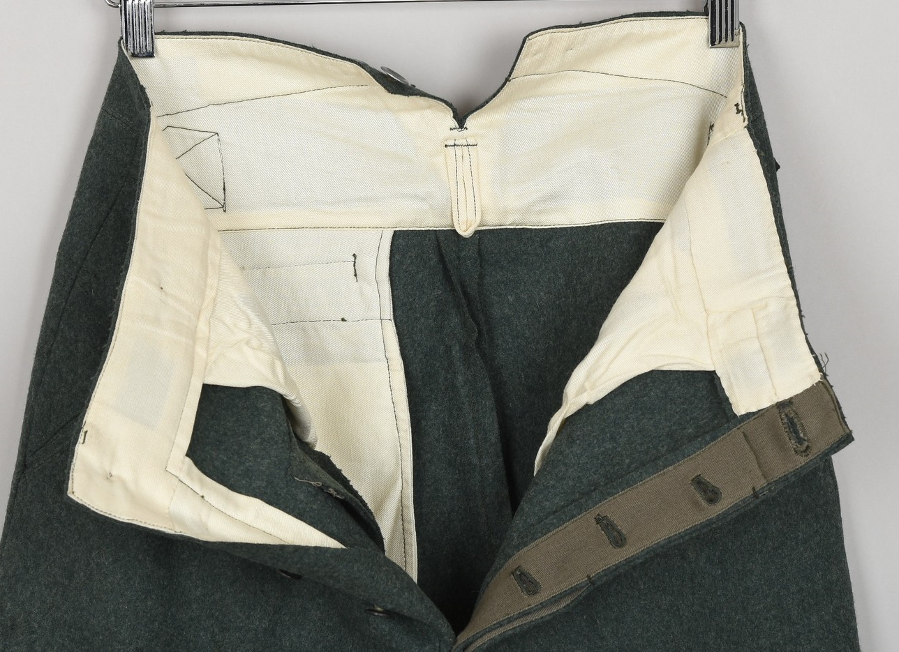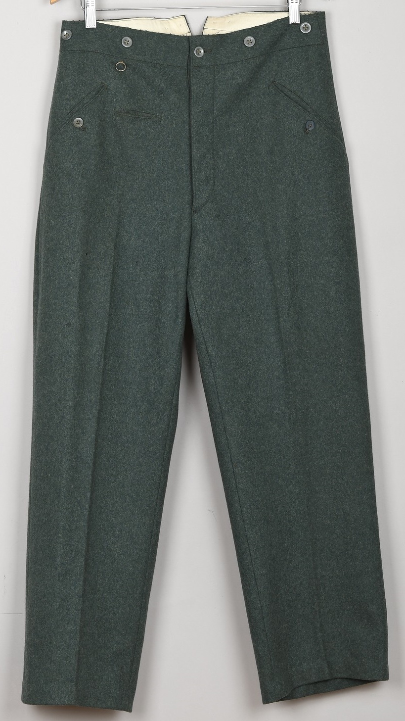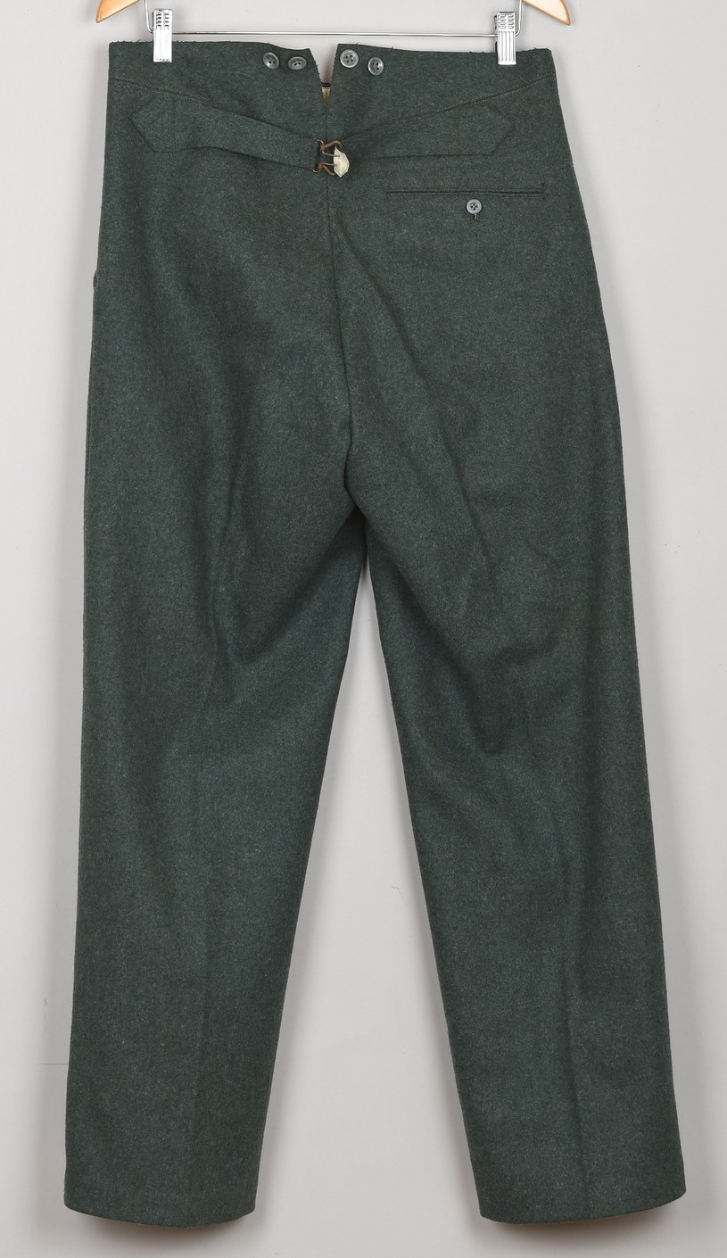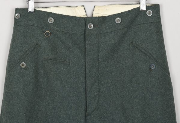 Originally the long pants were produced in stone grey fabric until 1940 when regulations dictated that newly produced long pants be constructed in field-grey fabric. The trousers are made of the standard Wehrmacht field-grey wool. The trousers have two, diagonally angled, front pockets and a small watch pocket. A strap and metal buckle is sewn on the back for size adjustment. The trousers are in very good condition with minor signs of age. There is only one minor moth bite.