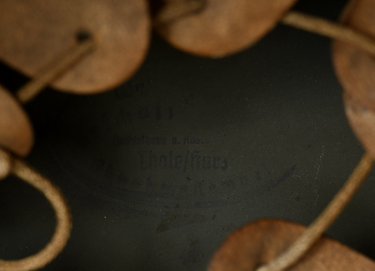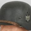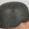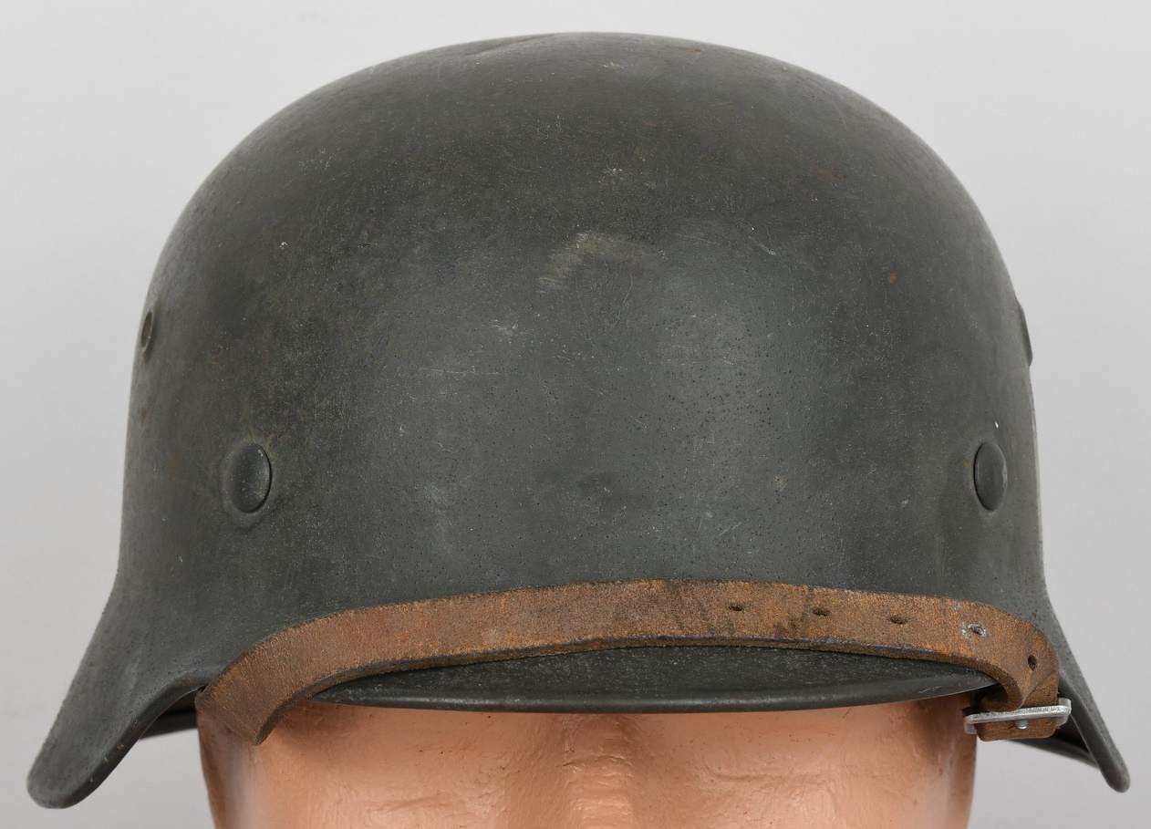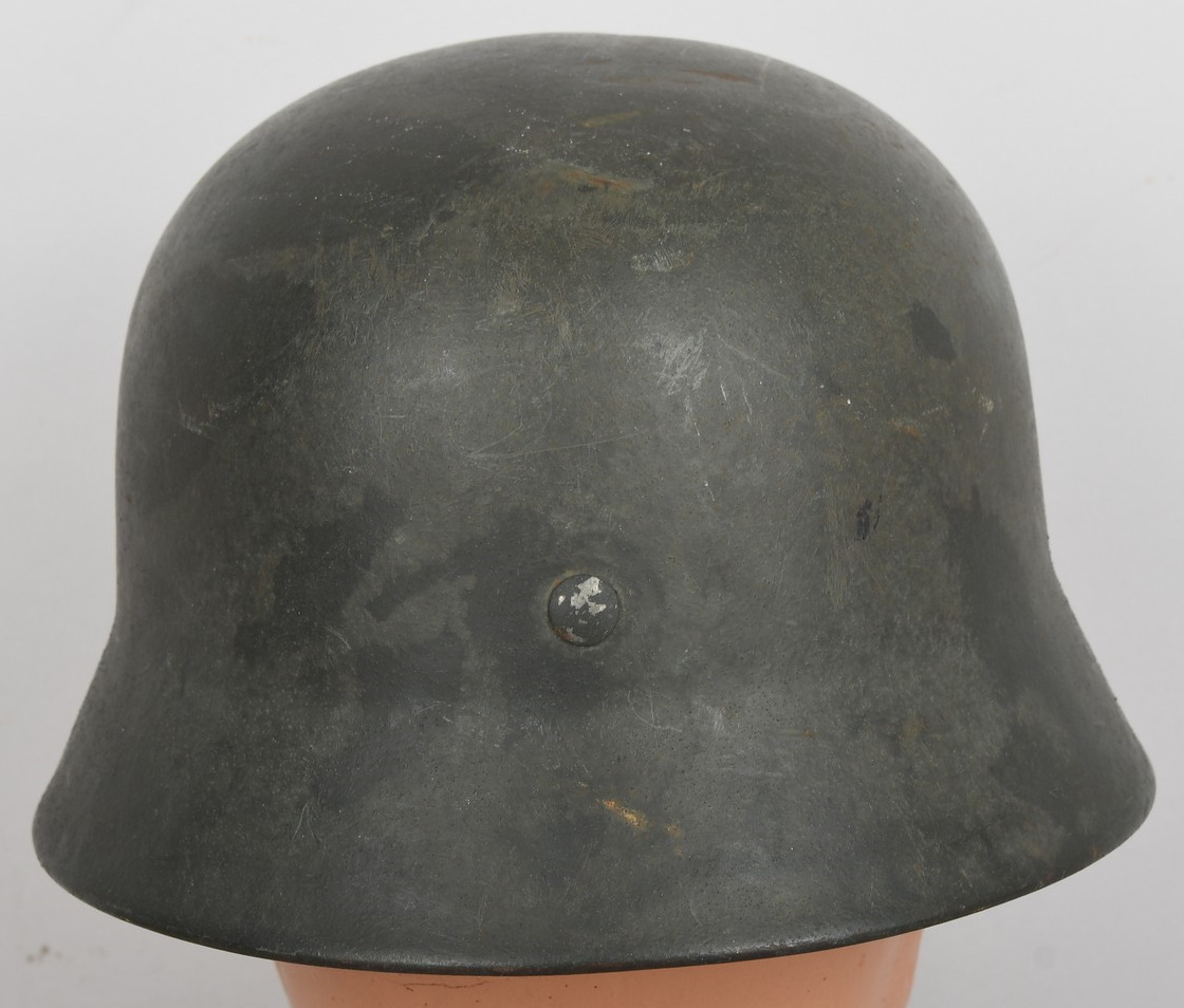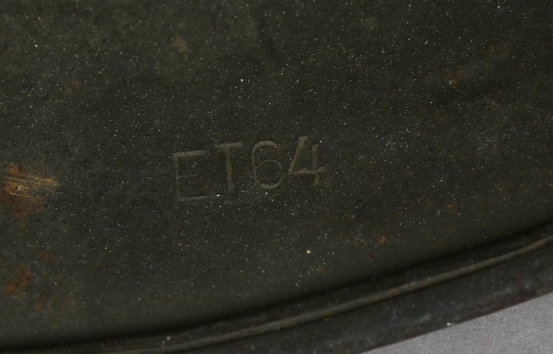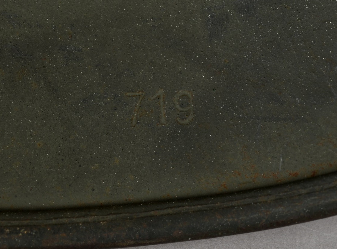 Combat steel helmet with field grey paint remains to approx 99%. Heer decal is also present to 99%. Inside complete with original liner, size 57 which is in very good condition, drawstring is still in place. Left inside is maker marked and size “ET64” indicating manufacture by “Eisen-und Hüttenwerke, AG Thale/Harz”, size 64. The reverse interior neck guard apron is serial number marked which appears to be “719”. Original chinstrap is present. Helmets doom stamp is also still clearly visable. The helmet was partly war-time re-painted with field-grey paint with saw dust or sand mixed in (for better camouflage and to prevent light deflection. The helmet is in very good condition, light and even signs of real use but no damage what so ever and the decal and paint is close to perfect. The sand/saw dust paint gives this helmet a true front feeling and look.