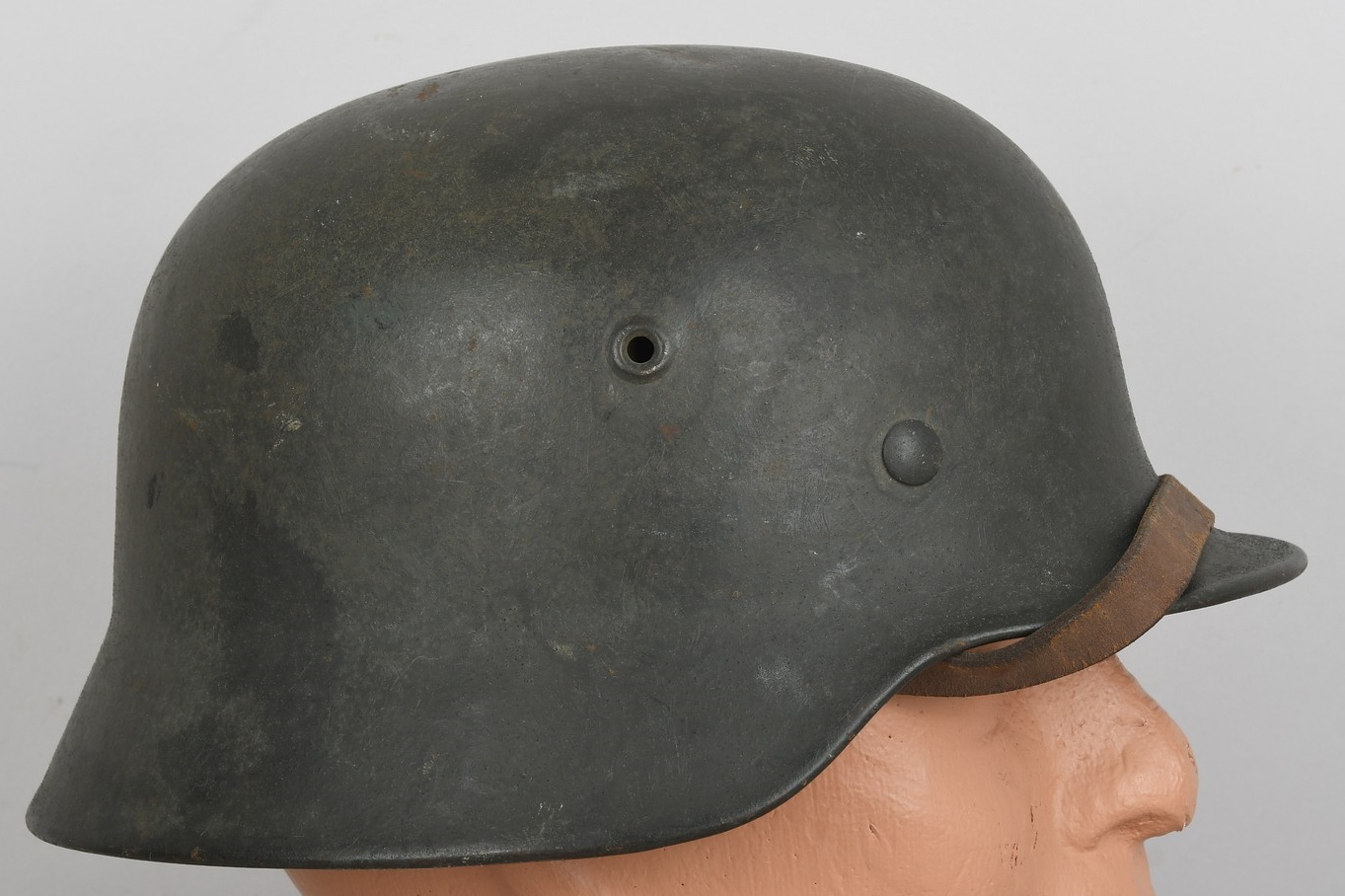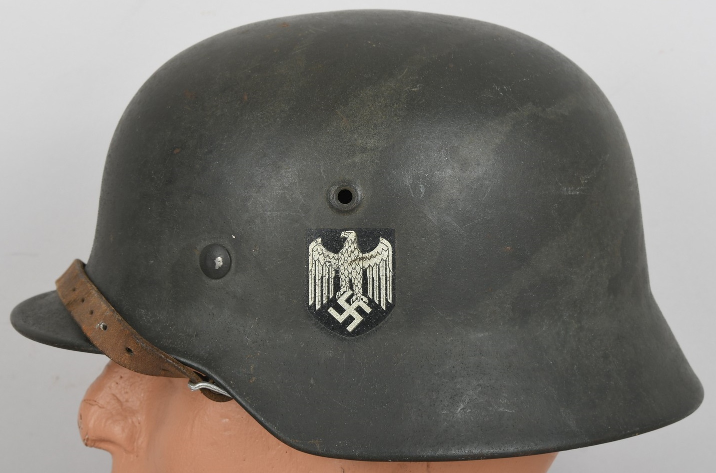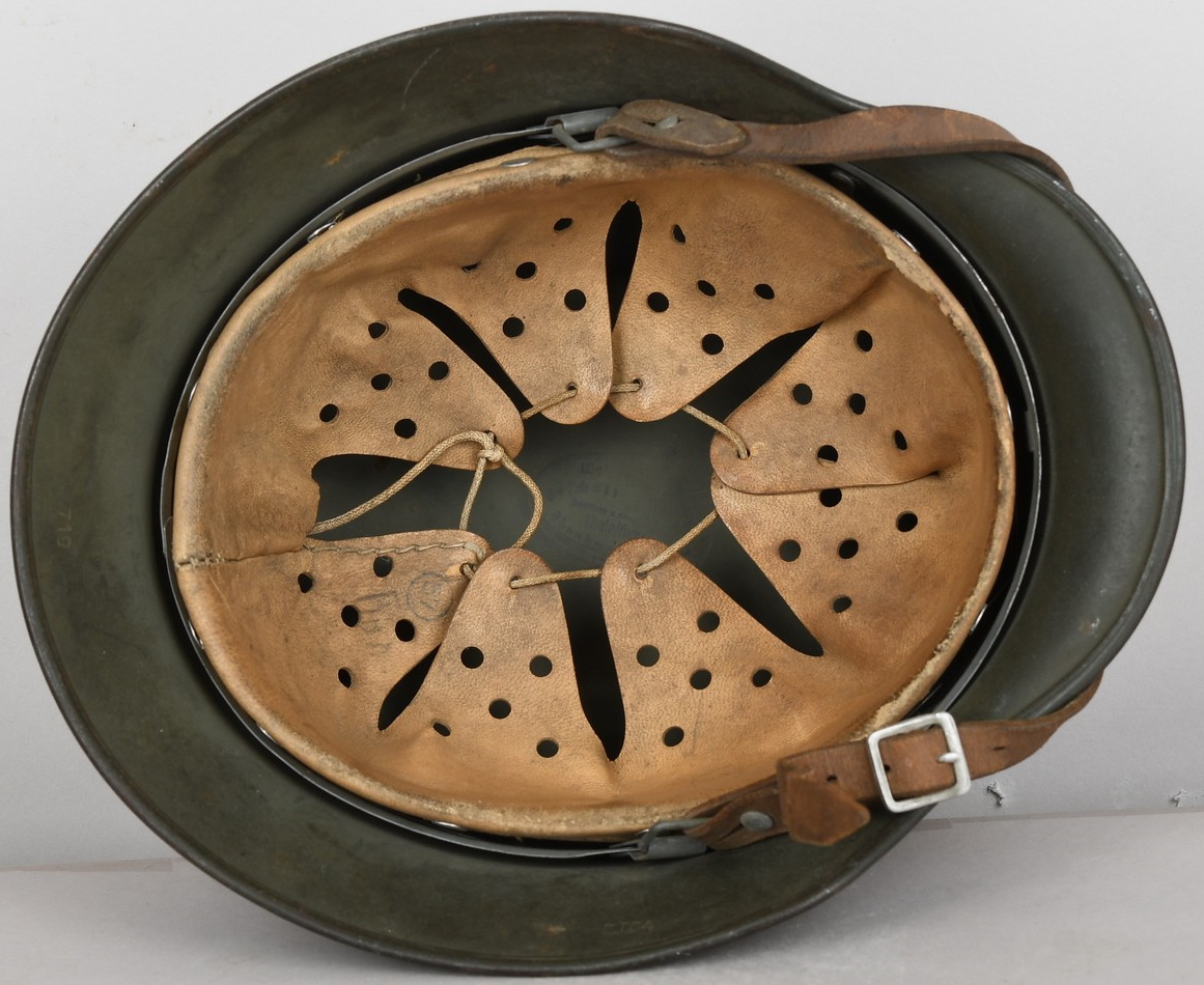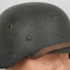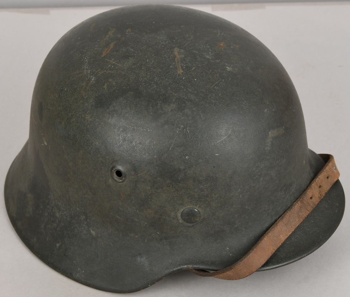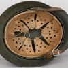 Combat steel helmet with field grey paint remains to approx 99%. Heer decal is also present to 99%. Inside complete with original liner, size 57 which is in very good condition, drawstring is still in place. Left inside is maker marked and size “ET64” indicating manufacture by “Eisen-und Hüttenwerke, AG Thale/Harz”, size 64. The reverse interior neck guard apron is serial number marked which appears to be “719”. Original chinstrap is present. Helmets doom stamp is also still clearly visable. The helmet was partly war-time re-painted with field-grey paint with saw dust or sand mixed in (for better camouflage and to prevent light deflection. The helmet is in very good condition, light and even signs of real use but no damage what so ever and the decal and paint is close to perfect. The sand/saw dust paint gives this helmet a true front feeling and look.