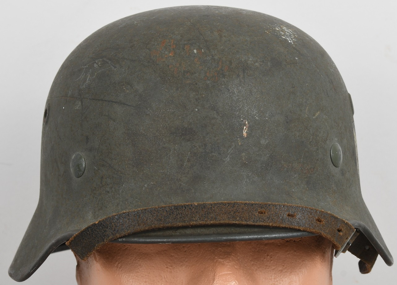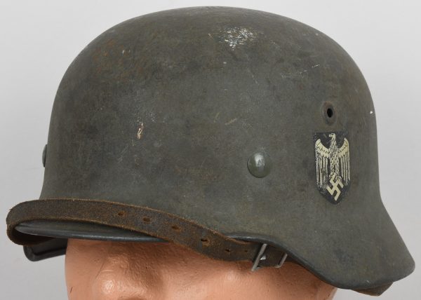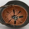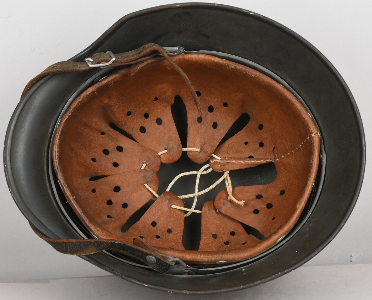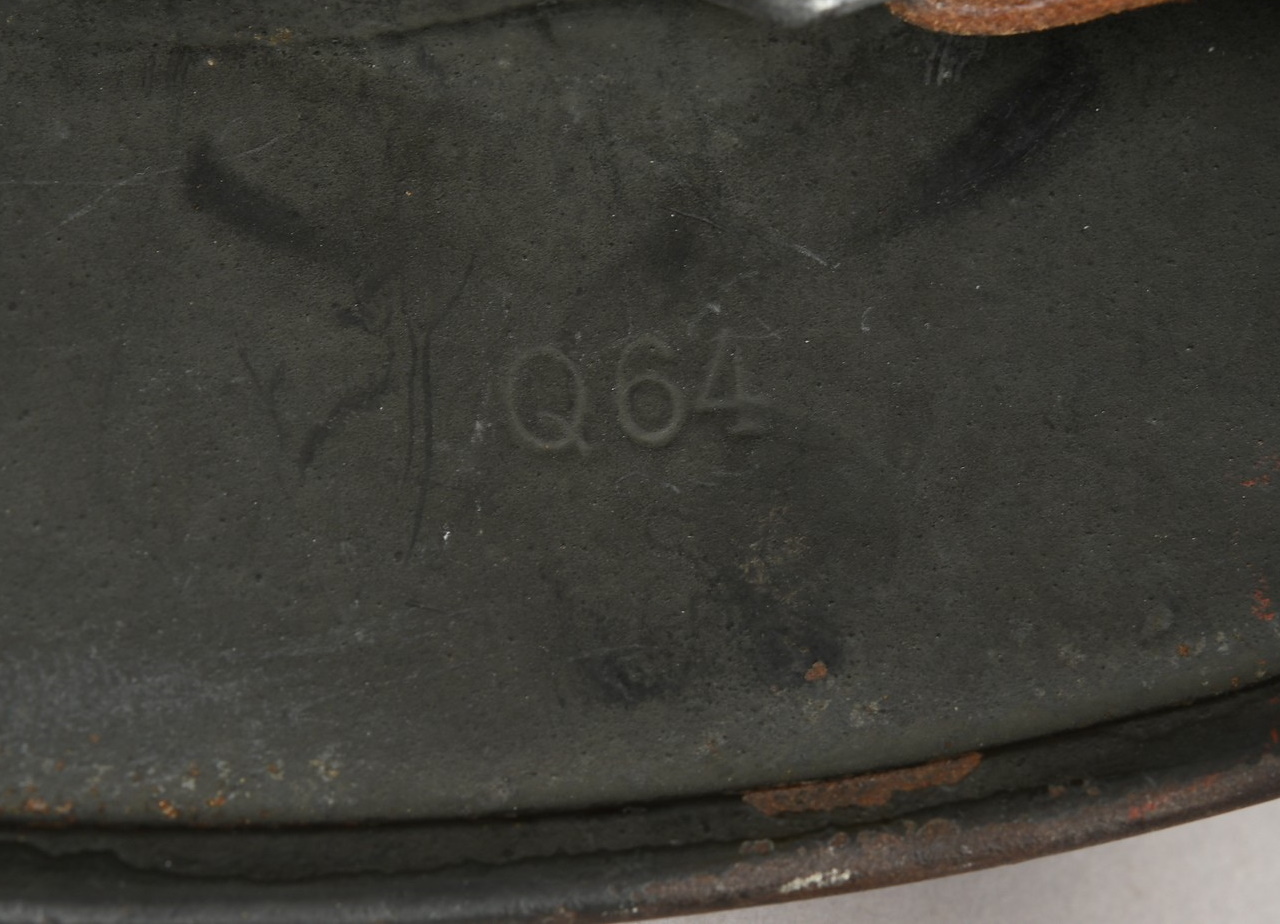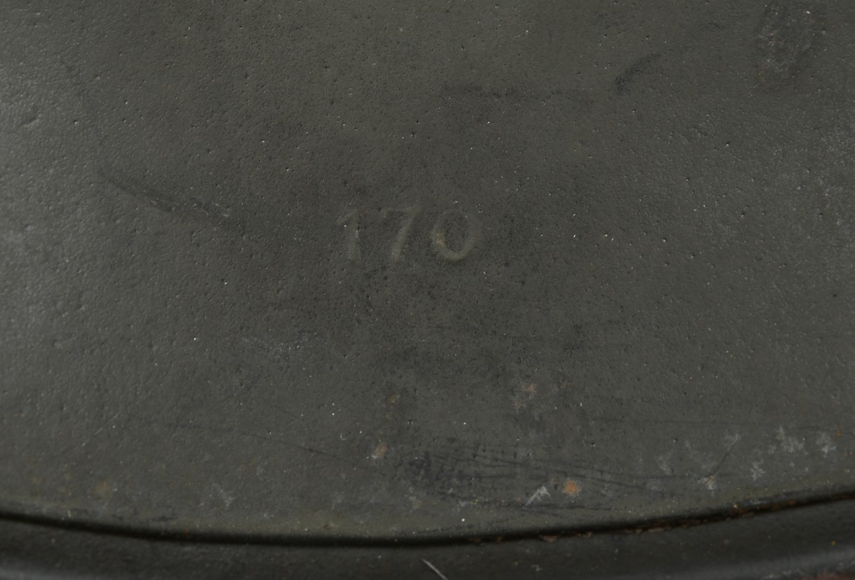 Combat steel helmet with rough field-grey paint remains to approx 99%. Heer decal is present to 90%. Inside complete with original liner, size 57 which is in very good condition, drawstring is still in place. Left inside is maker marked and size “Q64” . The reverse interior neck guard apron is serial number marked “170”. Original chinstrap is present. The helmet was war-time repainted with field-grey paint with rough texture paint (for better camouflage and to prevent light deflection. The helmet is in very good condition, light and even signs of real use with one small dent to the forehead area. The rought paint texture gives this helmet a true front feeling and look.