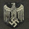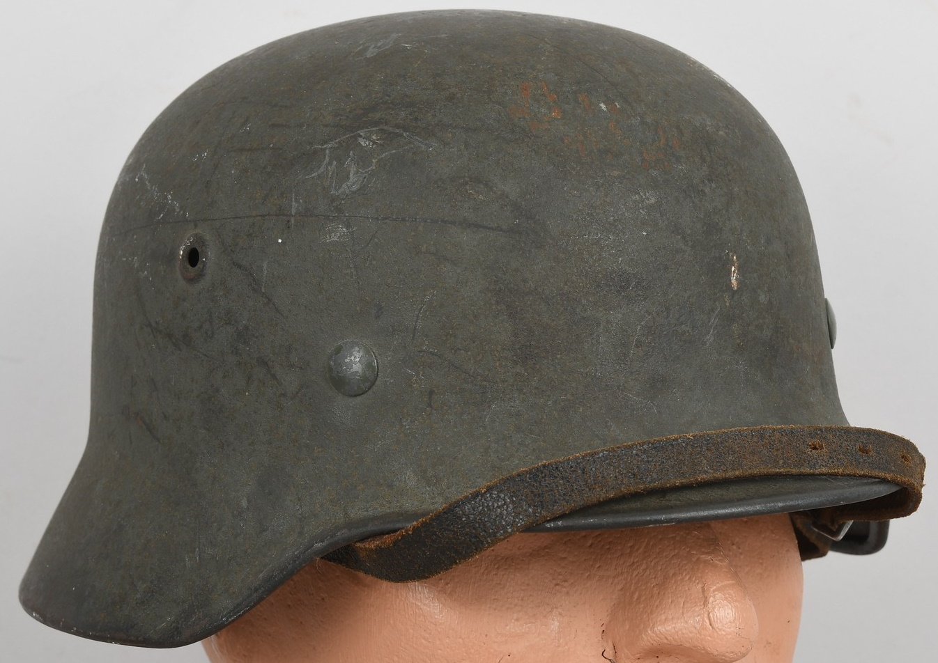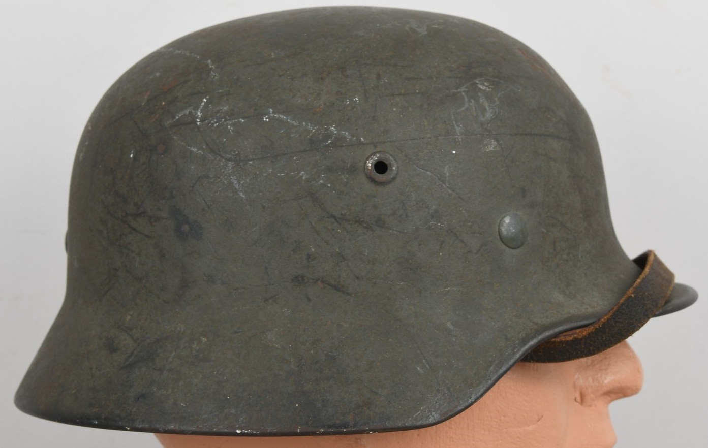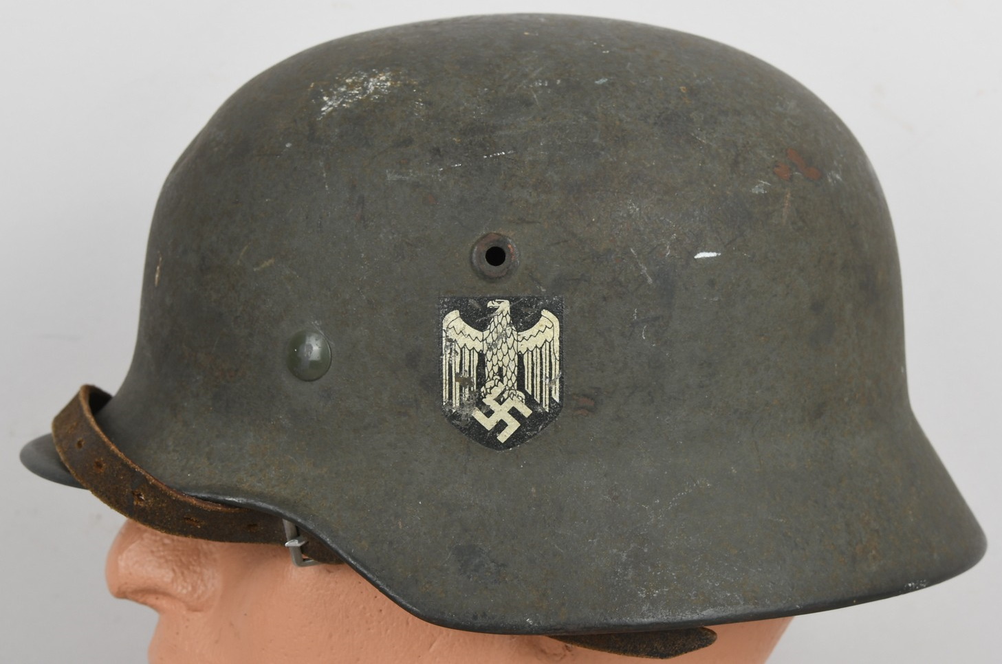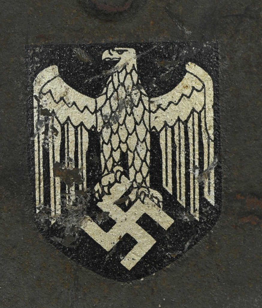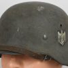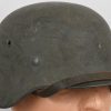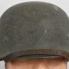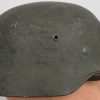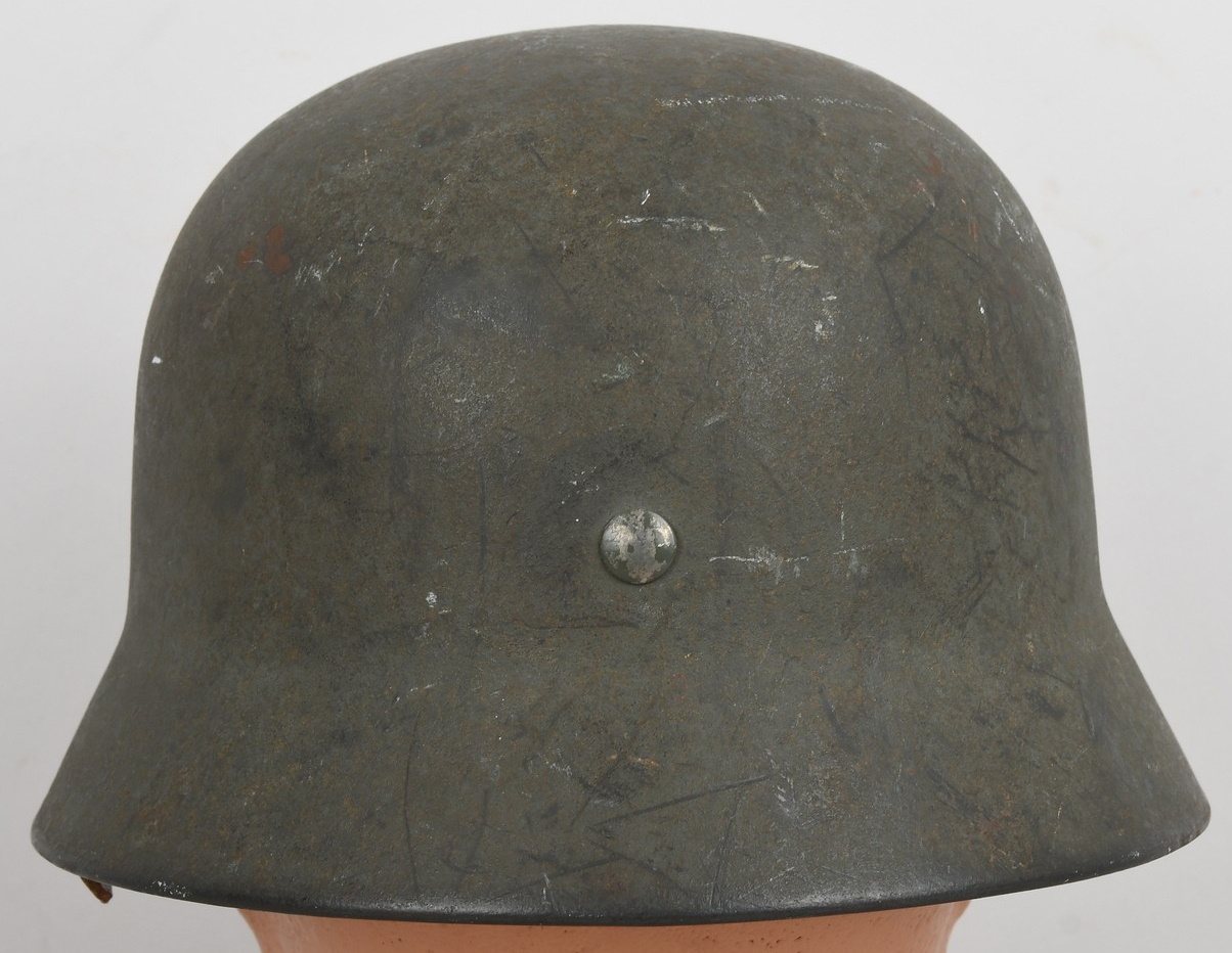 Combat steel helmet with rough field-grey paint remains to approx 99%. Heer decal is present to 90%. Inside complete with original liner, size 57 which is in very good condition, drawstring is still in place. Left inside is maker marked and size “Q64” . The reverse interior neck guard apron is serial number marked “170”. Original chinstrap is present. The helmet was war-time repainted with field-grey paint with rough texture paint (for better camouflage and to prevent light deflection. The helmet is in very good condition, light and even signs of real use with one small dent to the forehead area. The rought paint texture gives this helmet a true front feeling and look.