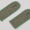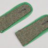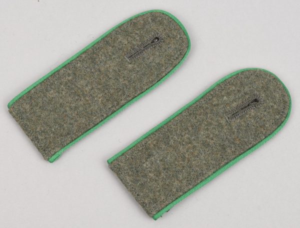 Late war, September 1944 – May 1945, m44 pattern slip on shoulder straps. Made of field-grey wool with Jäger green rayon piping. The bottoms of the shoulder straps and the slip on retaining tongues have grey rayon reinforcement strip machine sewn in place. The matching pair is in very good condition with minor signs of age.