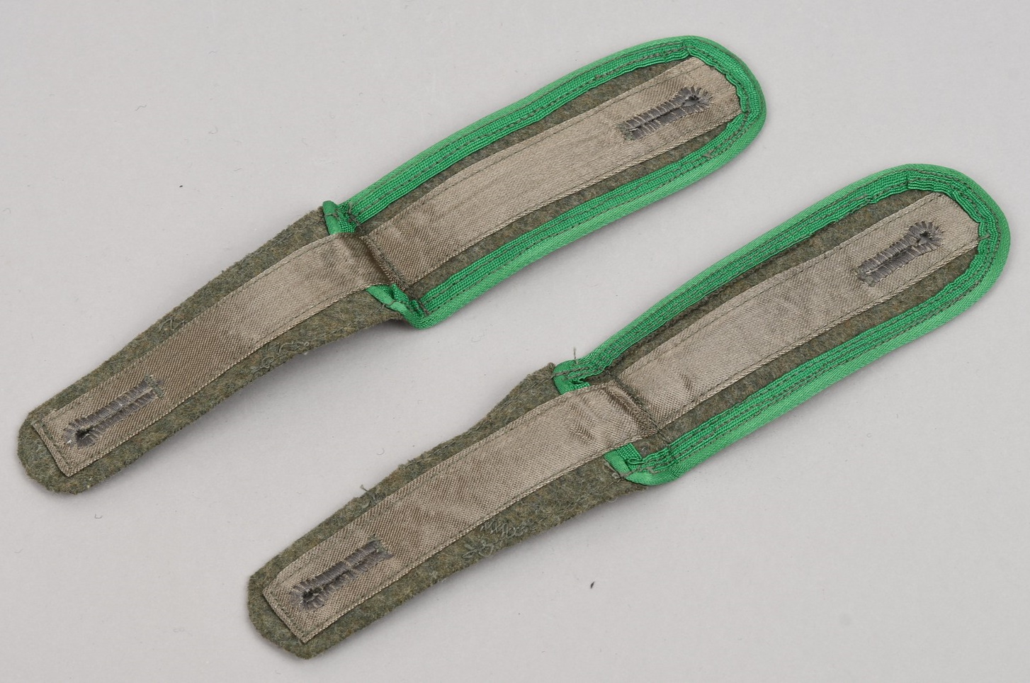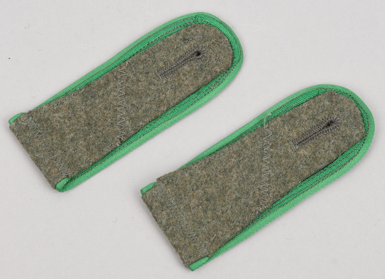 Late war, September 1944 – May 1945, m44 pattern slip on shoulder straps. Made of field-grey wool with Jäger green rayon piping. The bottoms of the shoulder straps and the slip on retaining tongues have grey rayon reinforcement strip machine sewn in place. The matching pair is in very good condition with minor signs of age.