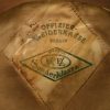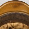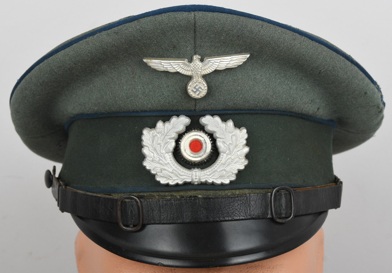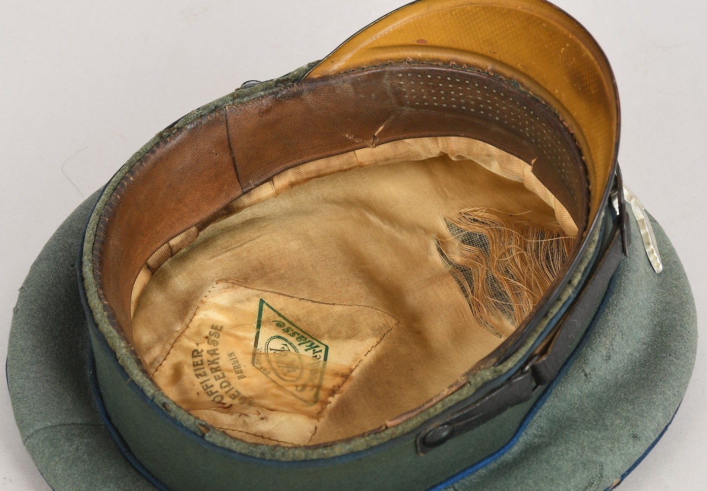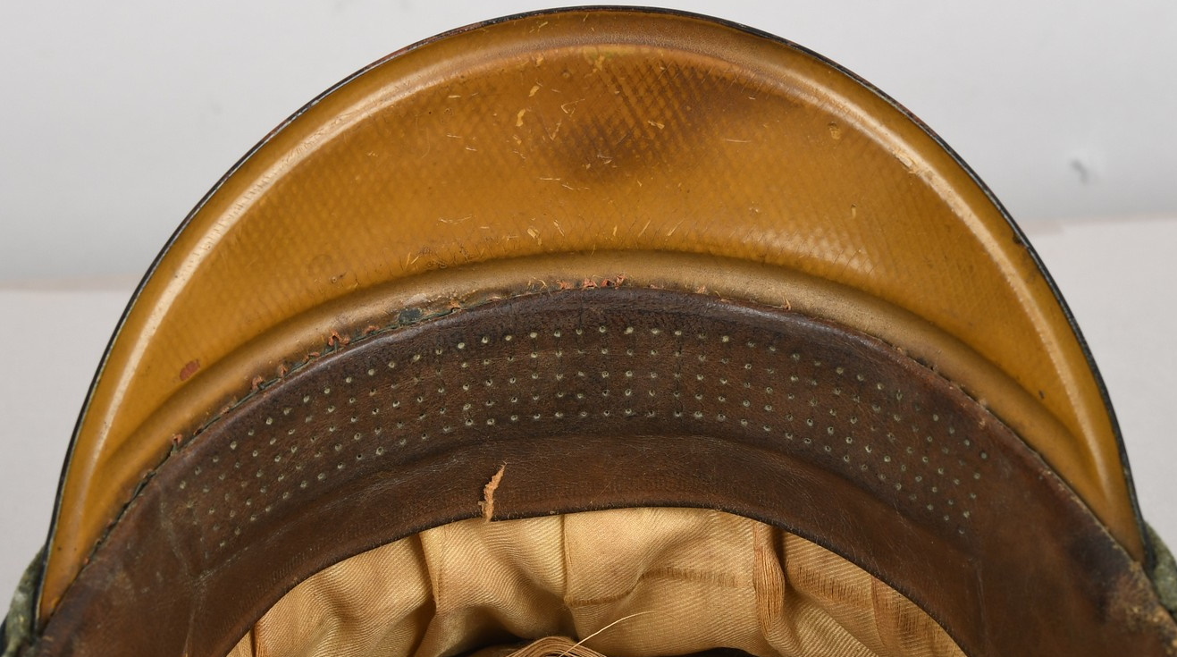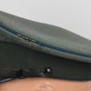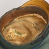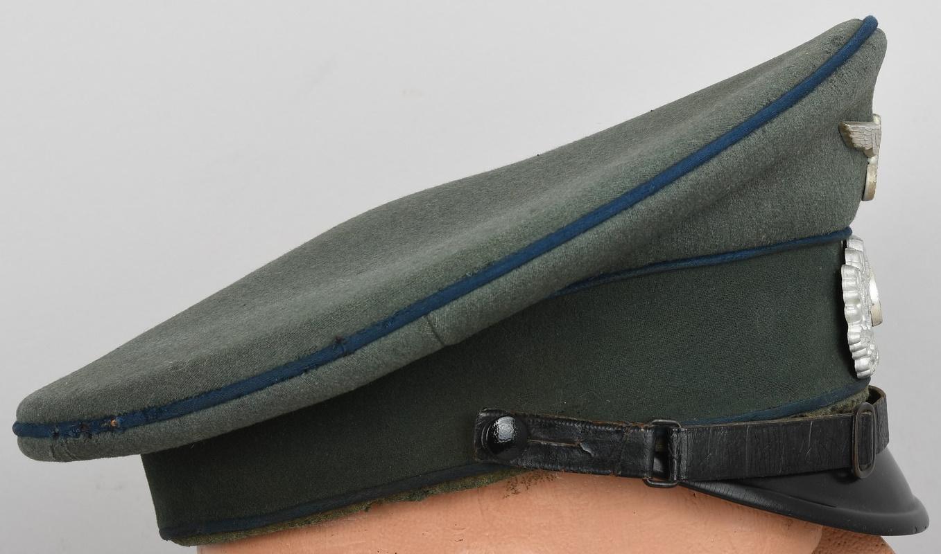 Private purchase EM/NCO´s visor cap made of field-grey cloth with dark-blue trimmed wool piping. Pinned in place to the front is a silver washed alloy national eagle and wreath/cockade. Buttoned in place to each side is a EM/NCO´s black leather chincord. Inside cap is lined with golden yellow rayon cloth. Cap original sweat shield is intact to 40%. The cap is clearly marked with Erel’s early logo and also RZM marked. Which means this is a rare, very early Erel produced visor cap. Brown leather sweatband is all intact.
