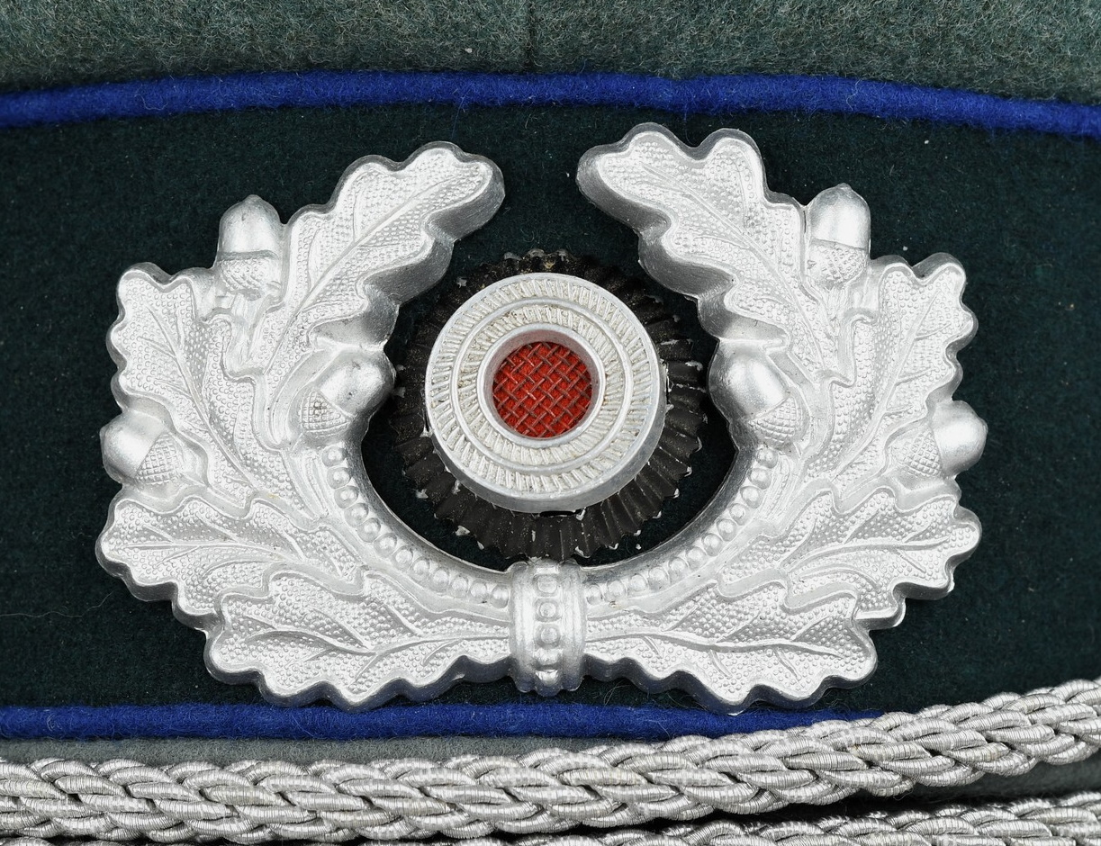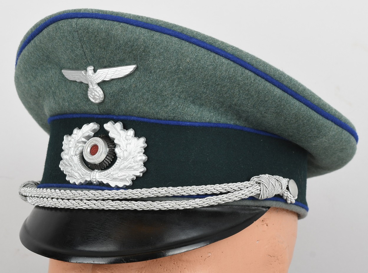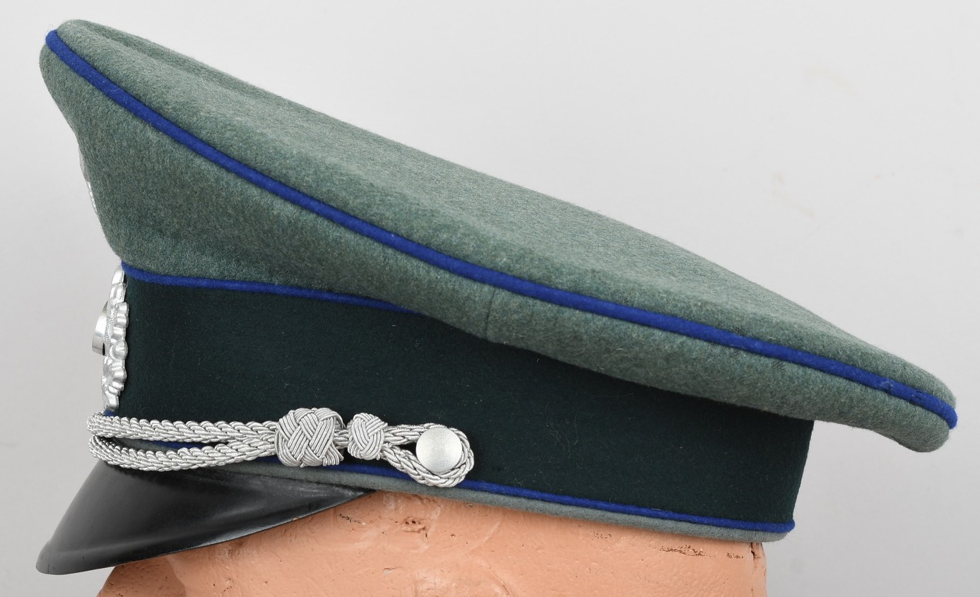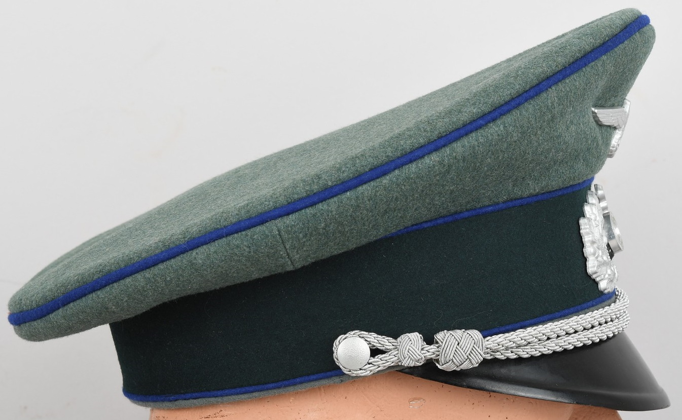 Mid war produced officer’s visor cap, constructed of field-grey cloth with medic blue wool piping. Pinned in place to the front is a silver washed alloy metal national eagle and wreath/cockade. Also in front and buttoned in place to the sides is as a officer´s heavy chincord.