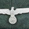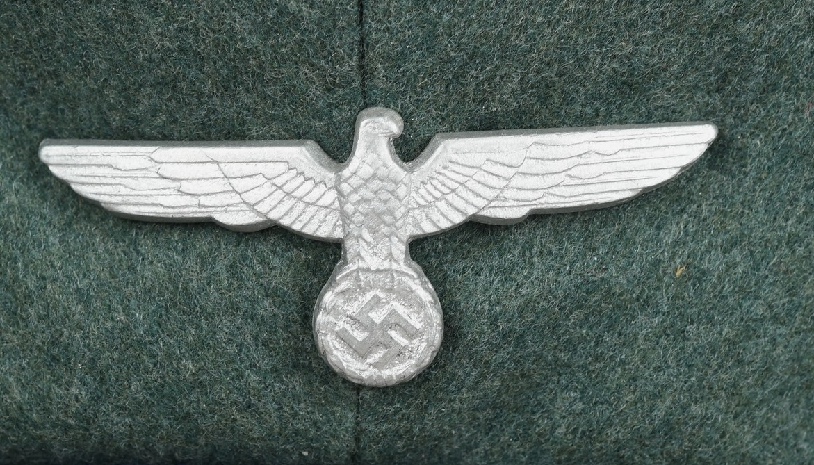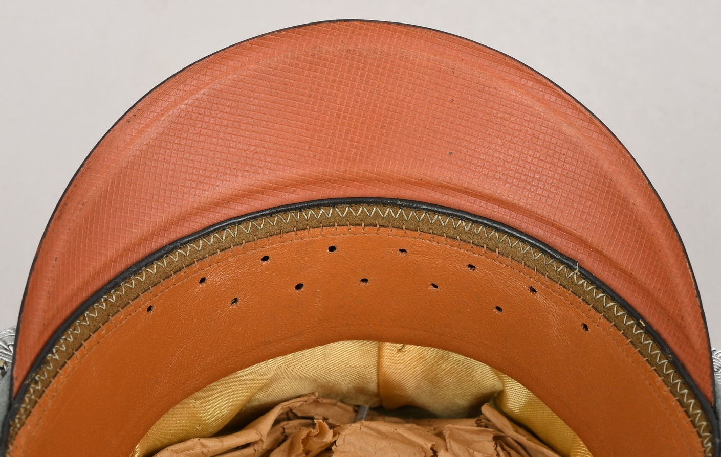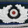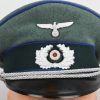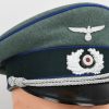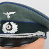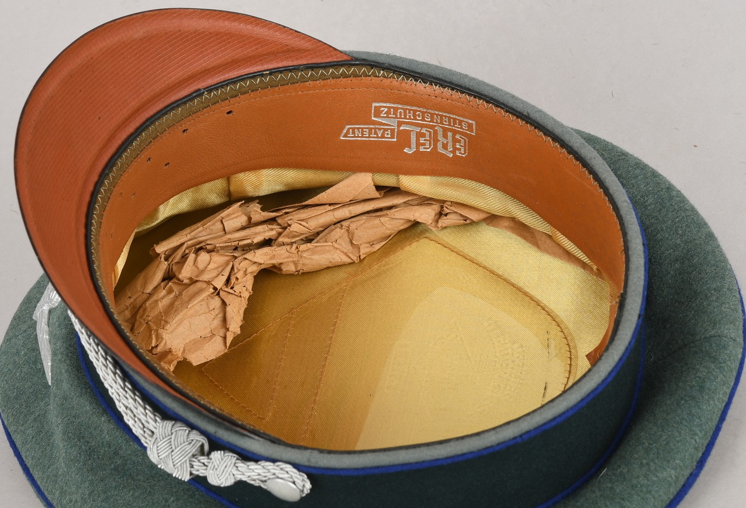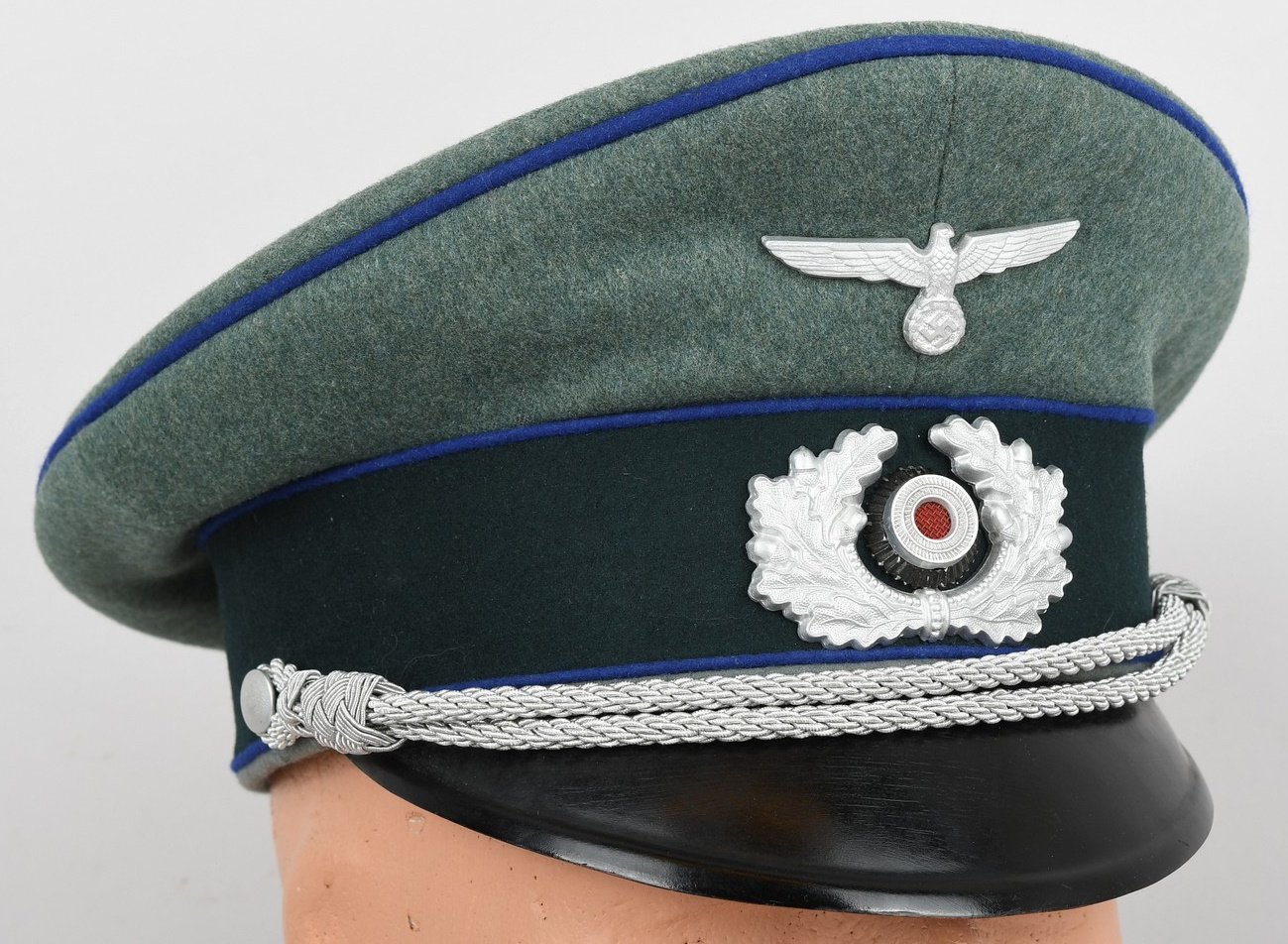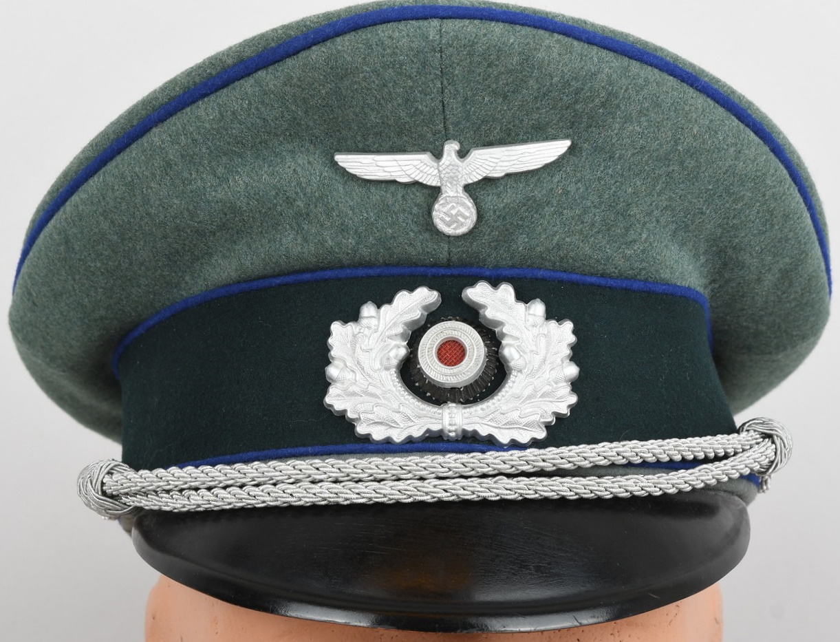 Mid war produced officer’s visor cap, constructed of field-grey cloth with medic blue wool piping. Pinned in place to the front is a silver washed alloy metal national eagle and wreath/cockade. Also in front and buttoned in place to the sides is as a officer´s heavy chincord.