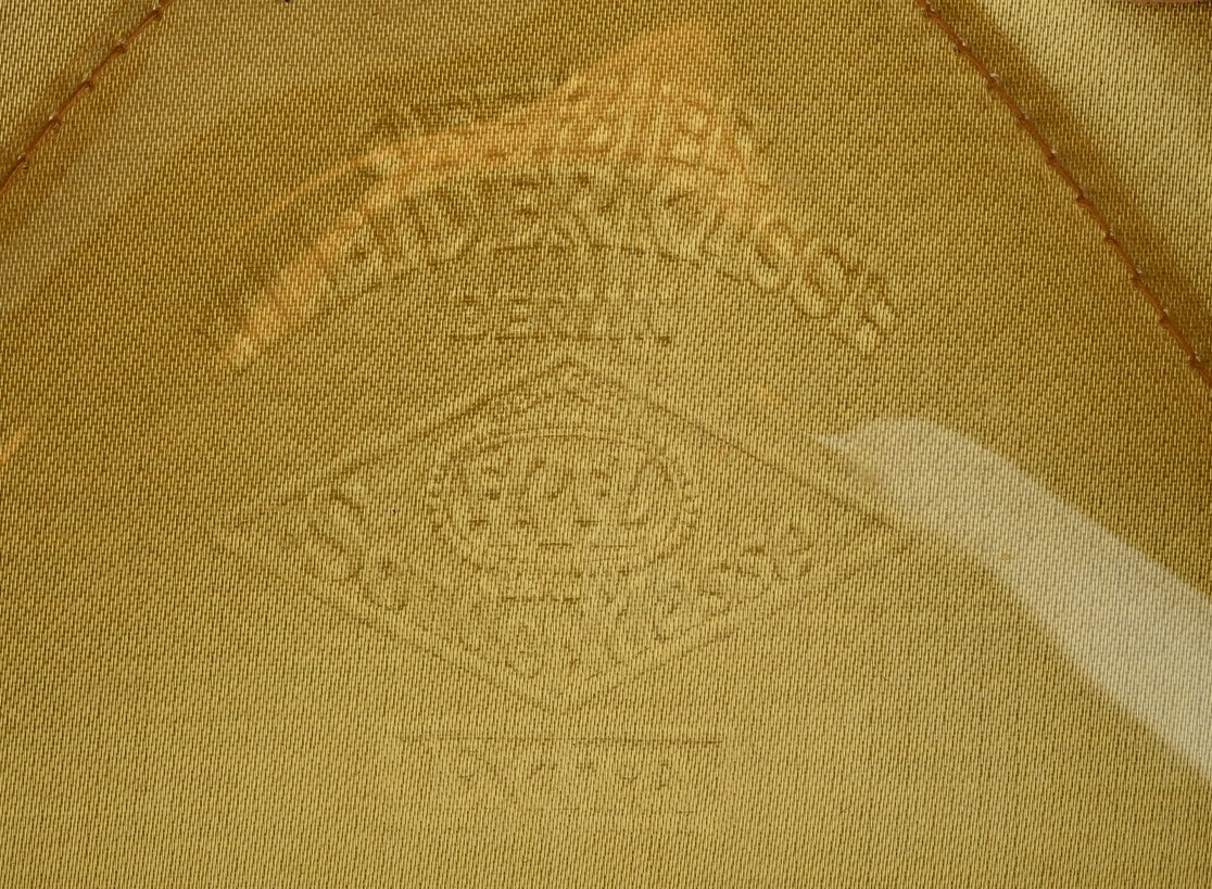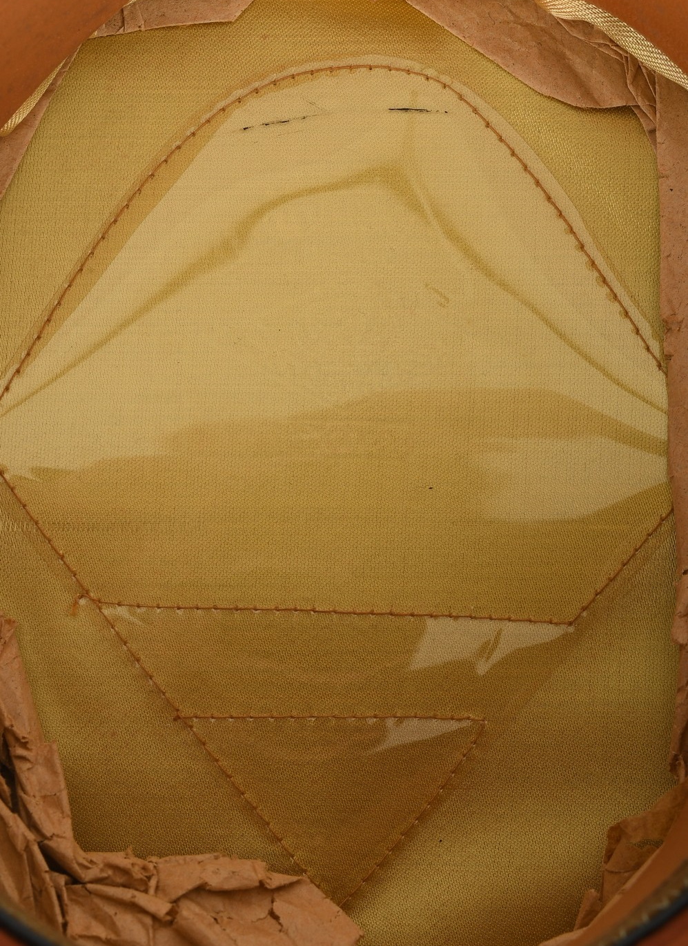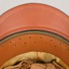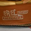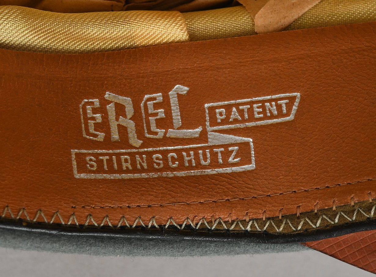 Inside cap is lined with golden yellow rayon. Cap still have it´s original sweat shield still all intact. The cap is water marked stamped “Erel” beneath the sweat shield. Light brown leather sweatband is all intact. The sweatband is clearly maker marked “Erel”. The cap is in close to mint condition. With hardly any signs of either age or real use. Inside is still filled with the original factory paper for the cap to keep it’s shape. Size is about 56.