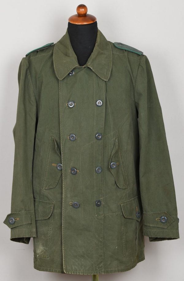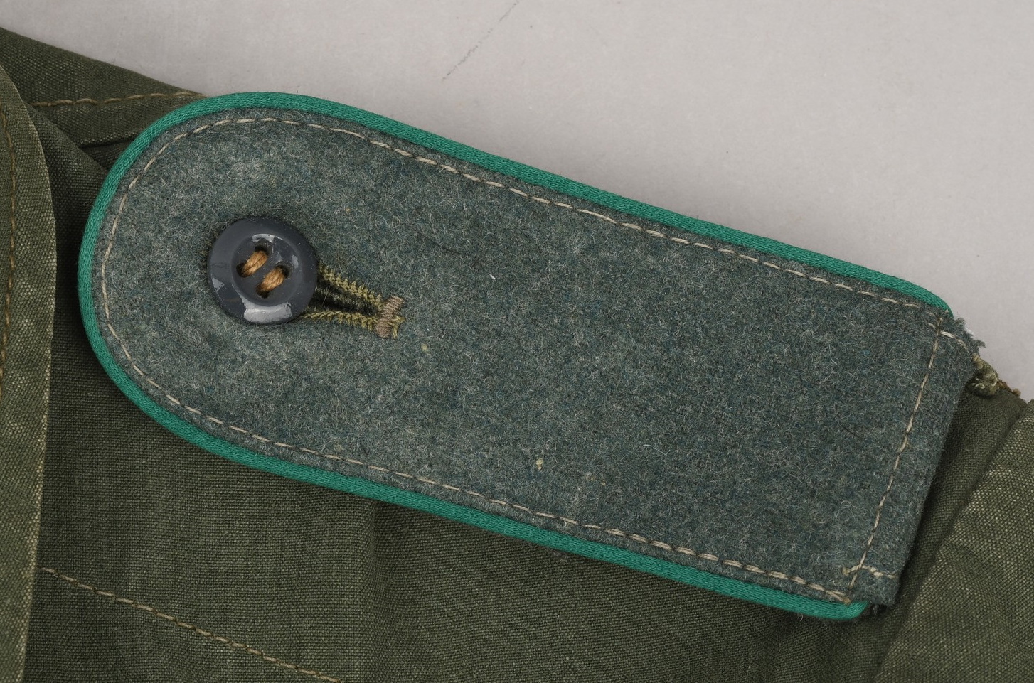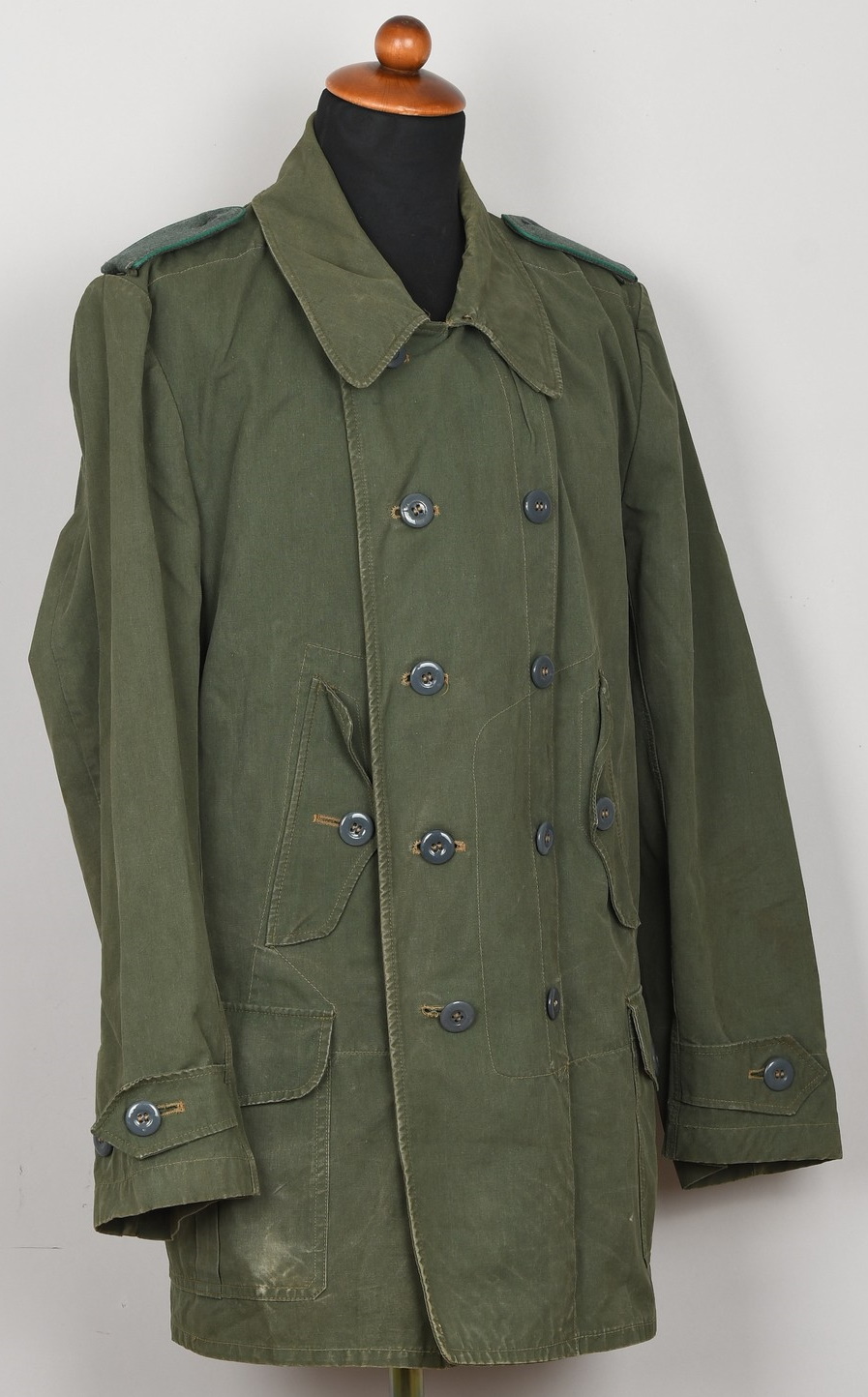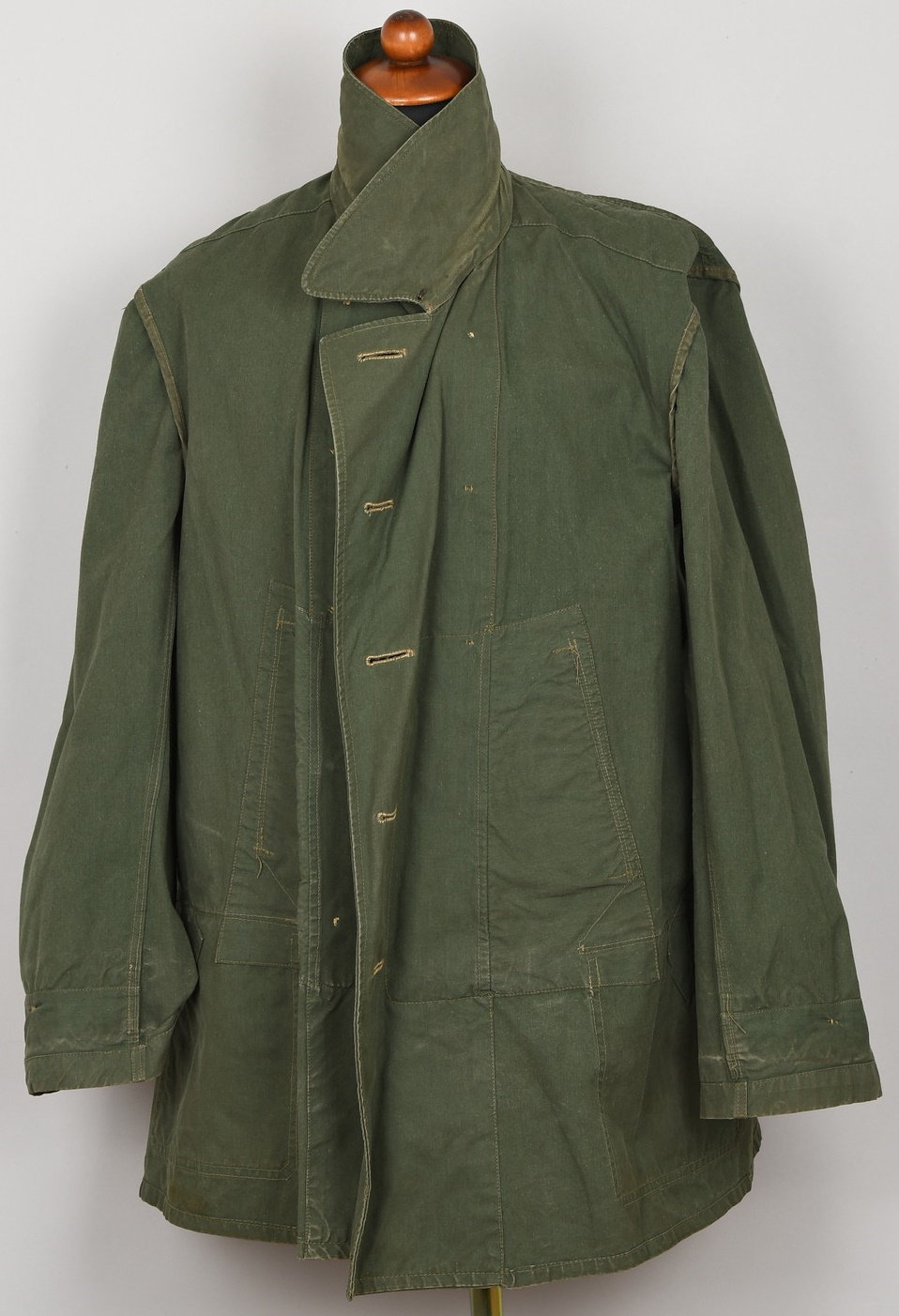 Olive drab, waterproofed, cotton duck construction, double breasted style. Mountain trooper’s wind jacket with a large, lay down collar. The jacket features dual, rows of five, front closure buttons. The jacket also has a single, metal hook and eye positioned at the forward neckline. The jacket has two, slash, lower breast pockets and two, pleated, patch, hip pockets all with scalloped, button down, flaps. The dual-ply, straight cut, sleeve cuffs each have a fit adjustment strap, with a single button eyelet. The reverse of the jacket has a non-adjustable, half-belt with two buttons. The jacket has cotton shoulder strap/board retaining loops and buttons intact. Buttoned in place tp each shoulder is a second pattern shoulder strap with green rayon piping. The large, lay down collar has no collar tabs or any evidence of any ever having been applied, as per regulations. The reverse of the collar has a fabric tab with a single button eyelet and corresponding button beneath for a secure neck closure in inclement weather. The unlined interior of the jacket has dual-ply, front closure panels. All buttons appear to have their original stitching. The jacket is in good condition with signs of age and real use. No holes, rips or mendigns.