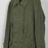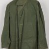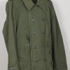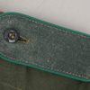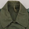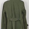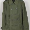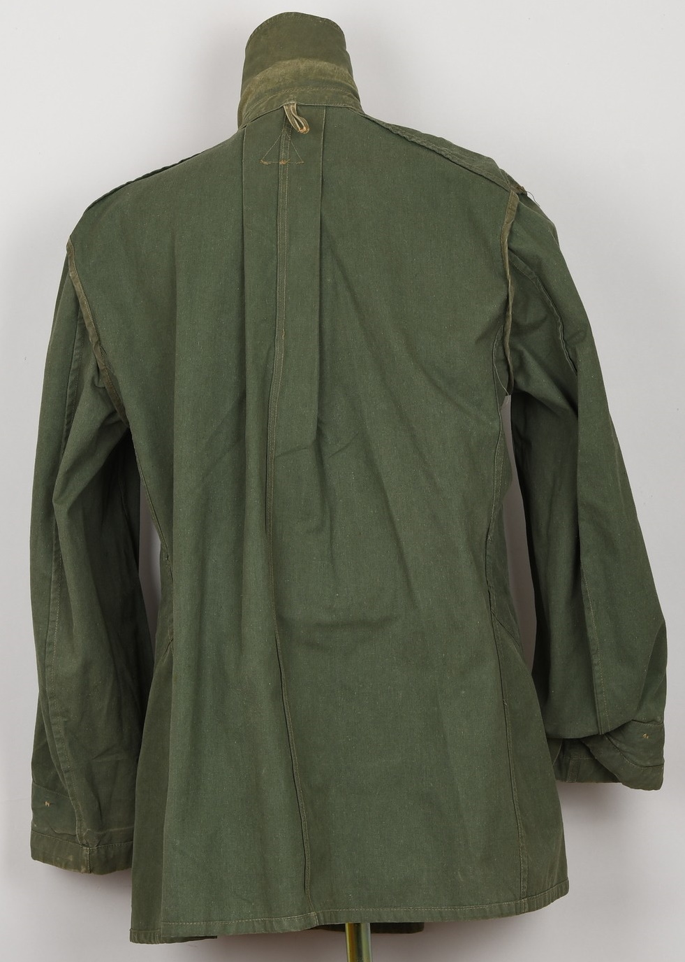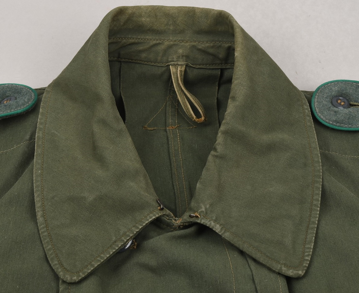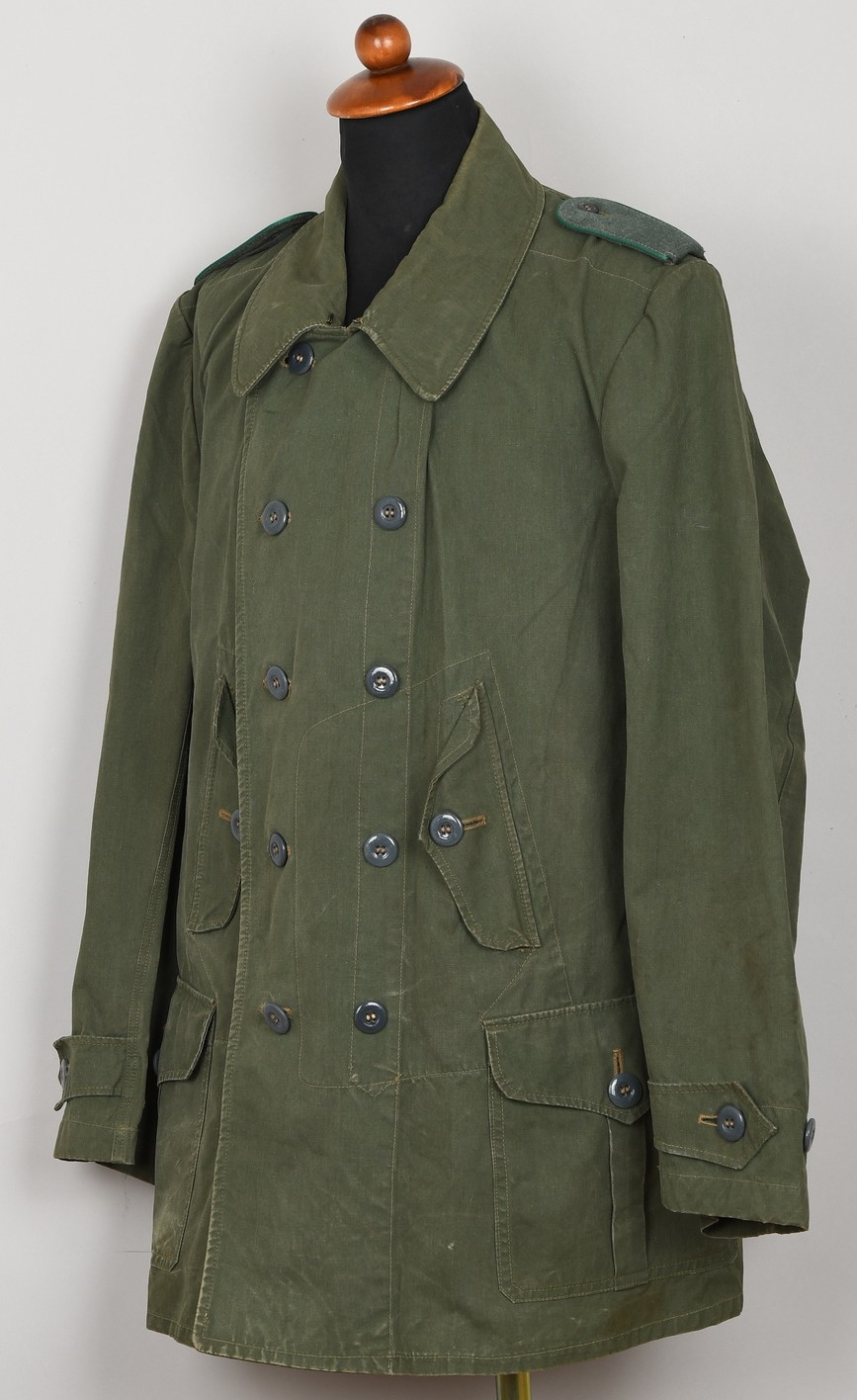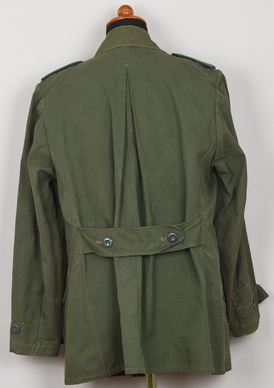Olive drab, waterproofed, cotton duck construction, double breasted style. Mountain trooper’s wind jacket with a large, lay down collar. The jacket features dual, rows of five, front closure buttons. The jacket also has a single, metal hook and eye positioned at the forward neckline. The jacket has two, slash, lower breast pockets and two, pleated, patch, hip pockets all with scalloped, button down, flaps. The dual-ply, straight cut, sleeve cuffs each have a fit adjustment strap, with a single button eyelet. The reverse of the jacket has a non-adjustable, half-belt with two buttons. The jacket has cotton shoulder strap/board retaining loops and buttons intact. Buttoned in place tp each shoulder is a second pattern shoulder strap with green rayon piping. The large, lay down collar has no collar tabs or any evidence of any ever having been applied, as per regulations. The reverse of the collar has a fabric tab with a single button eyelet and corresponding button beneath for a secure neck closure in inclement weather. The unlined interior of the jacket has dual-ply, front closure panels. All buttons appear to have their original stitching. The jacket is in good condition with signs of age and real use. No holes, rips or mendigns.