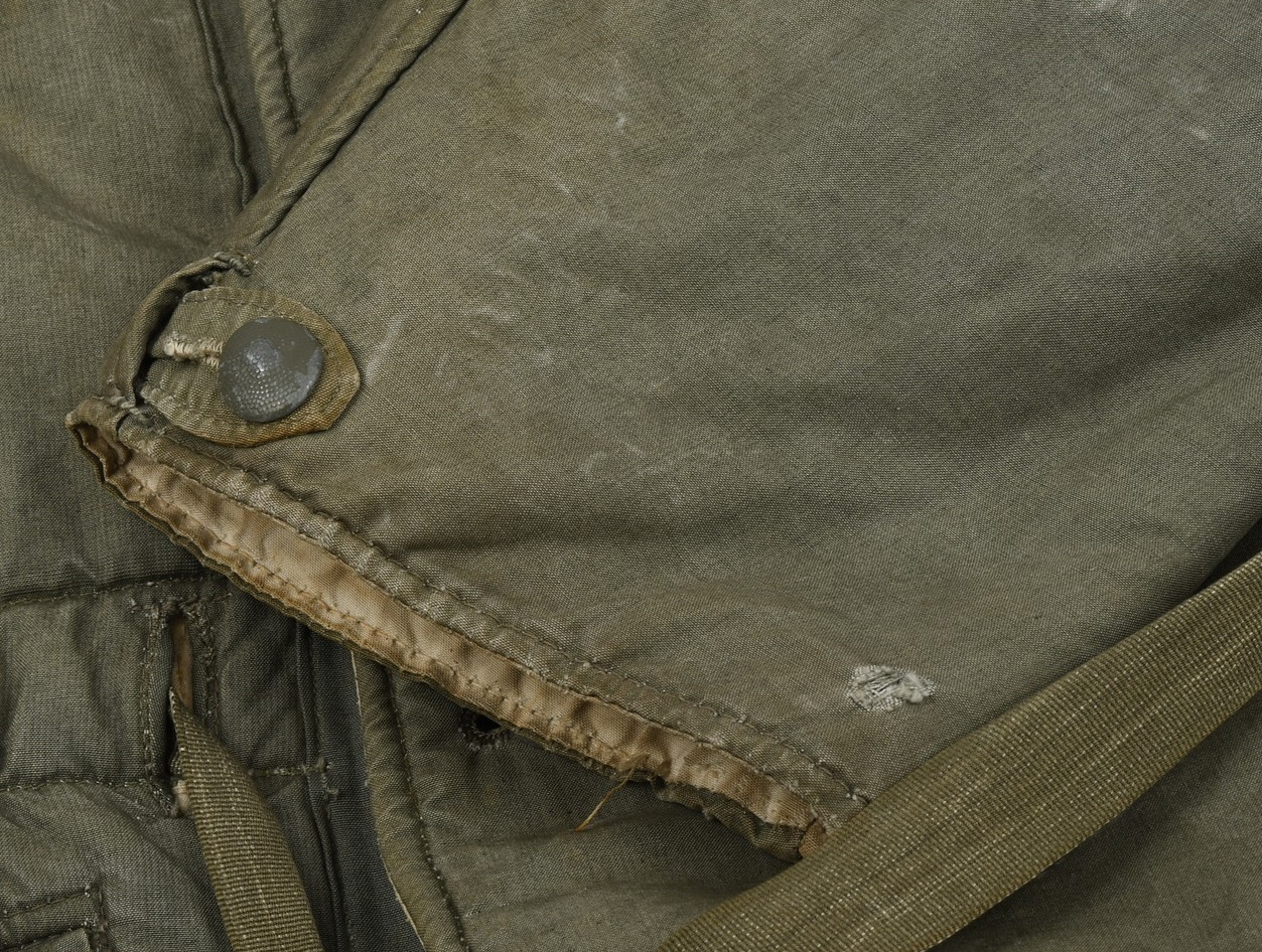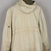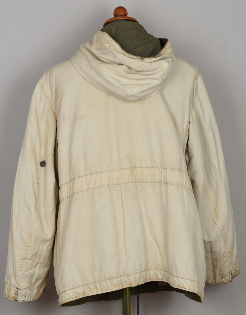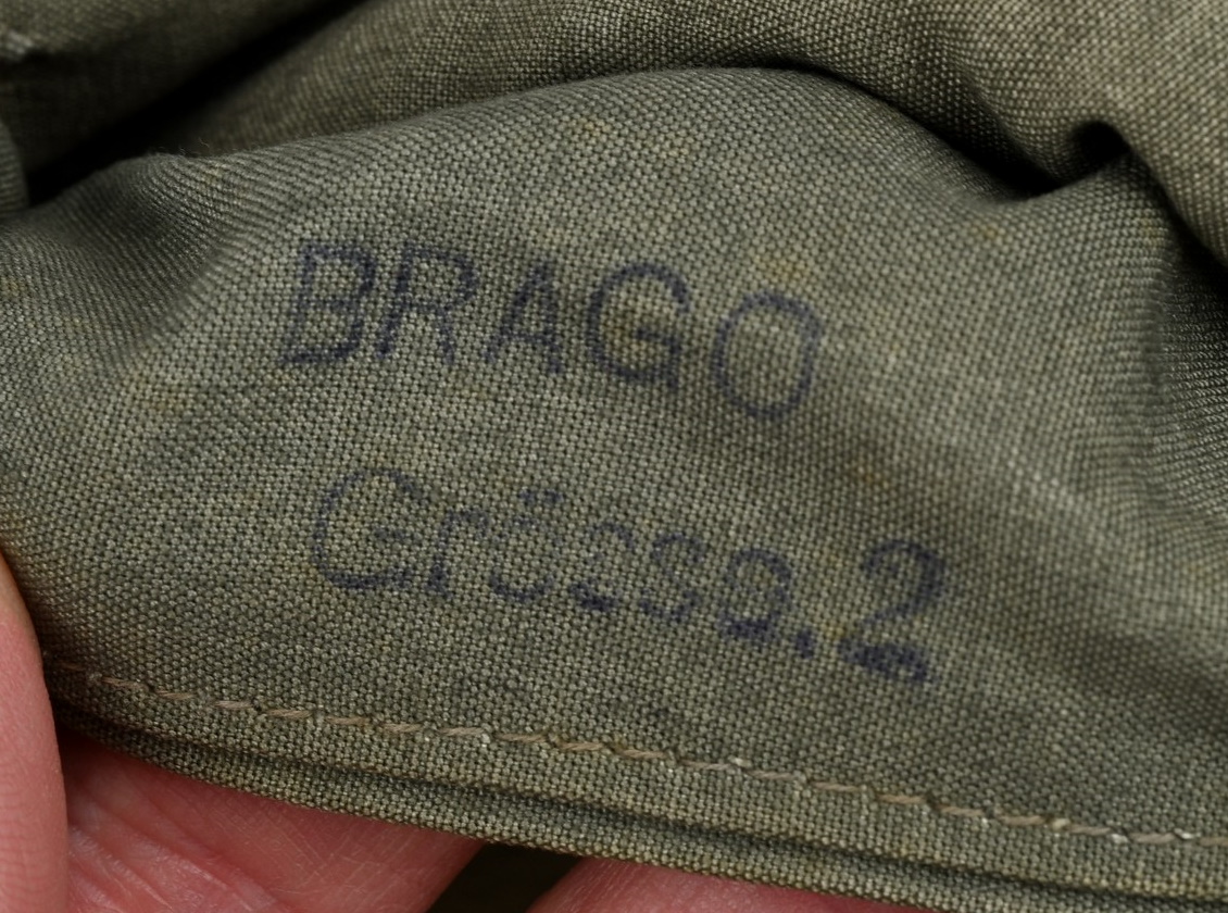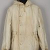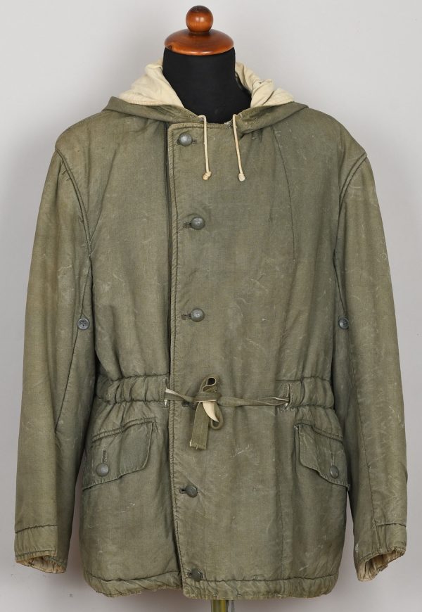 Early three quarter length, water repellant, heavy, ribbed cotton twill and cotton construction. Double breasted style parka with mouse grey (faded) to one side, reversible to white. Buttons are all complete with olriginal stitching. Original internal belts is still present. The parka has an integral hood, which is large enough to accommodate a helmet. The hood has a tunnel loop to the forward edge and the original white drawstring. The parka is fully reversible to white with all the same features as on the mouse grey side. The parka has an internal, heat retaining padding through-out. The parkas were designed large enough to fit over the standard service uniform and this example is also nicely marked “BRAGO GRÖSSE 2”. Size 2 is medium. The parka is in good still used condition with light signs of wear. Grey side shows some age and wear fading. White side is remarkably clean.