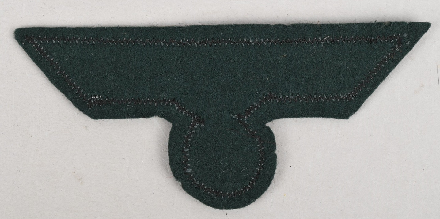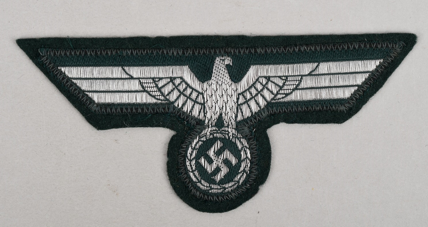 Machine woven, national breast eagle in bright, silver/aluminum flat-wire threads with interwoven blue/green accent threads on a dark green rayon base which is machine sewn on a dark green cloth backing. Un-issued example in very good condition.