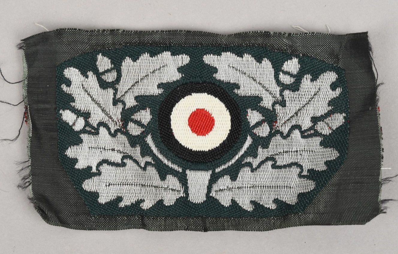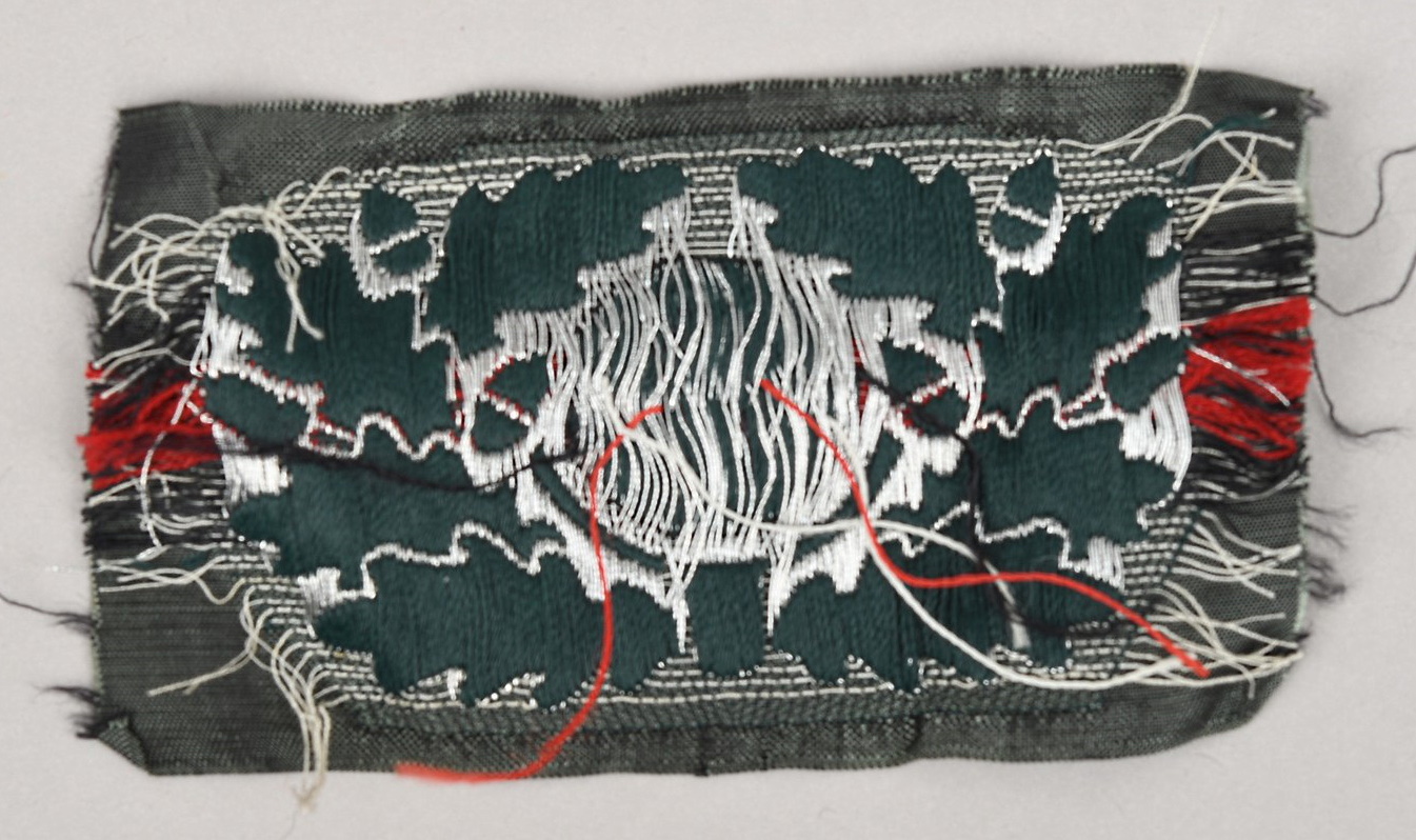 Constructed of machine embroidered flatwire threads on green/grey rayon cloth. To the center is interestingly a cockade sewn with rayon threads. In good condition with light signs of age and use.