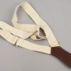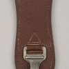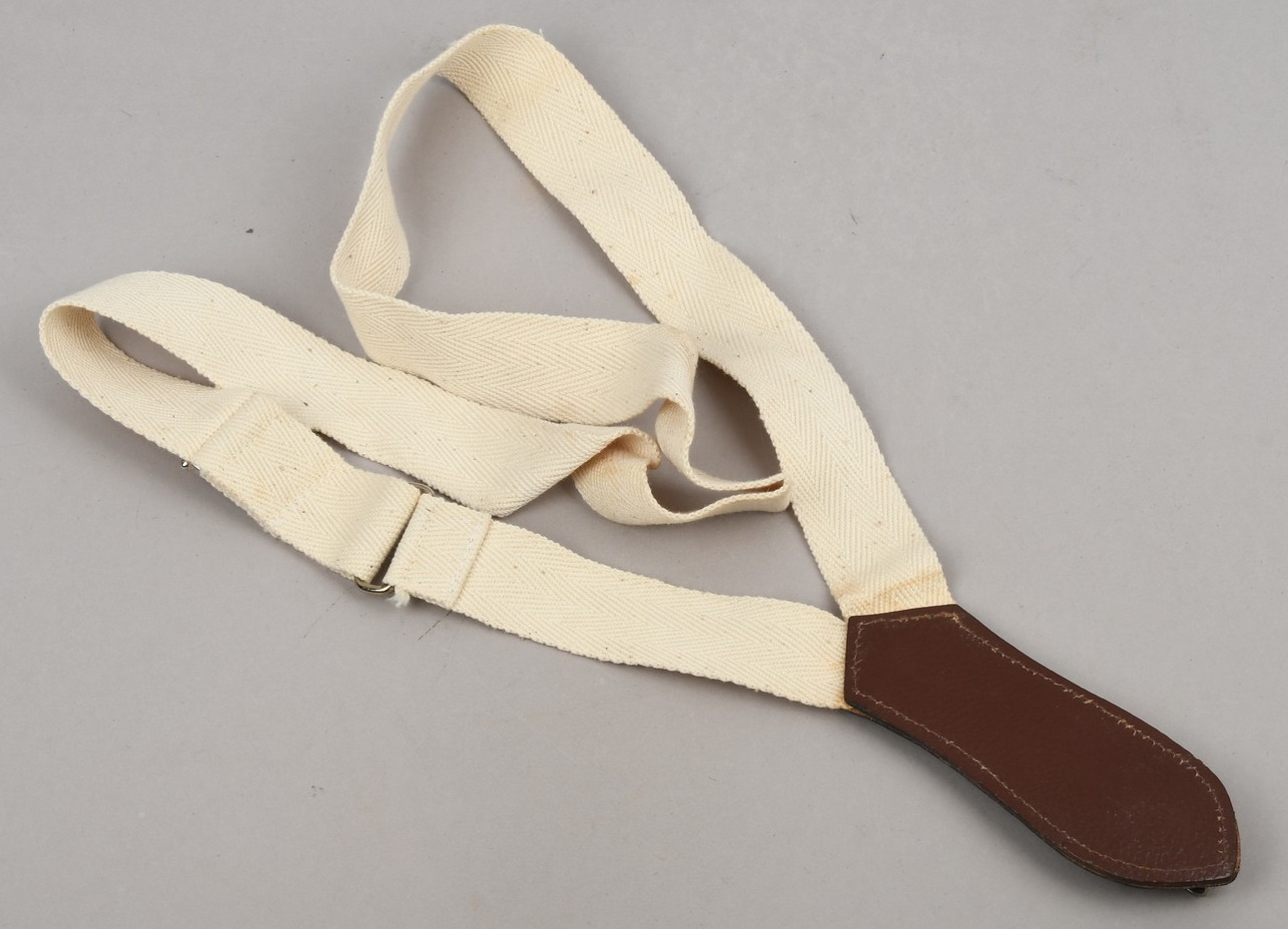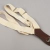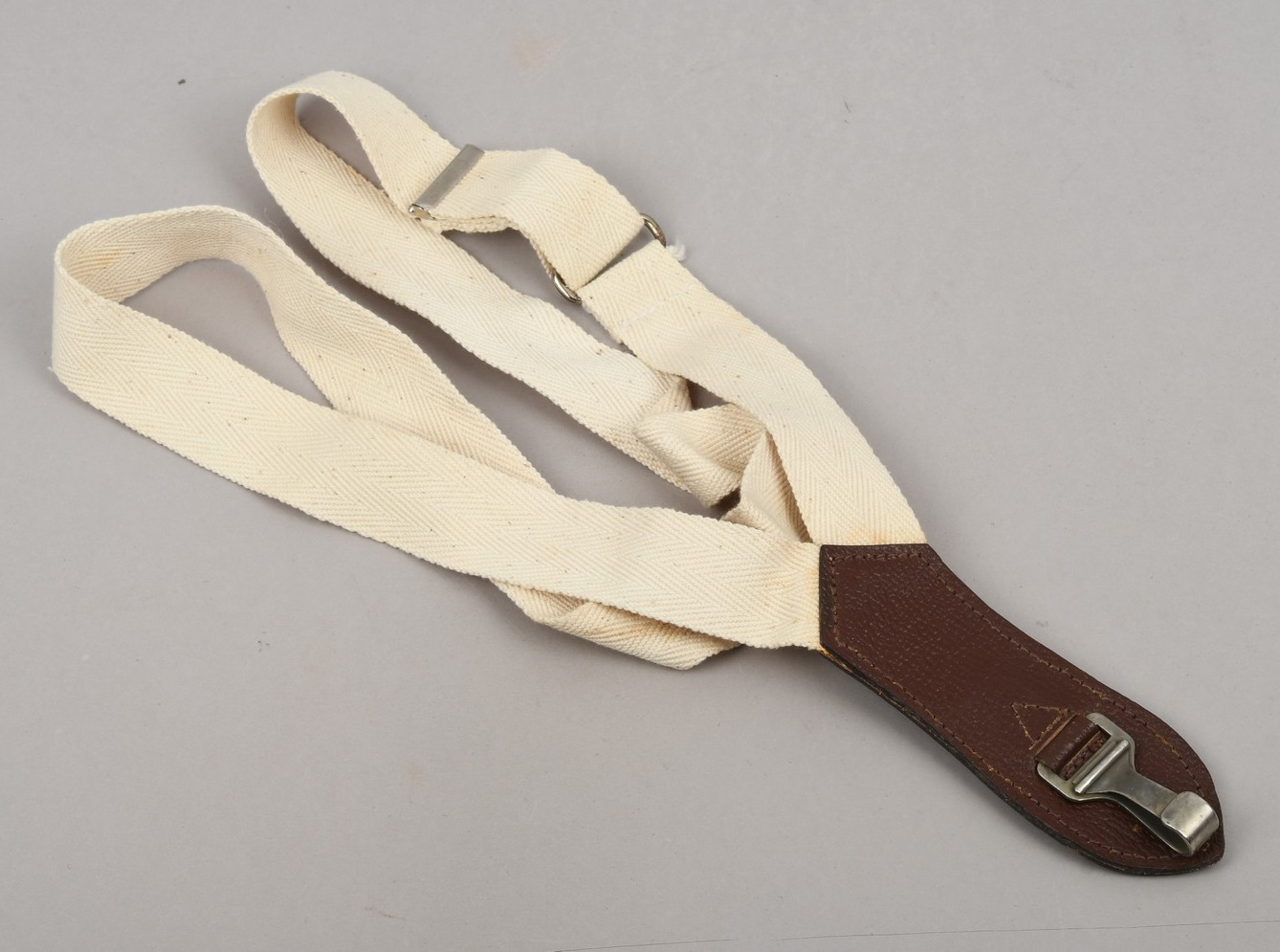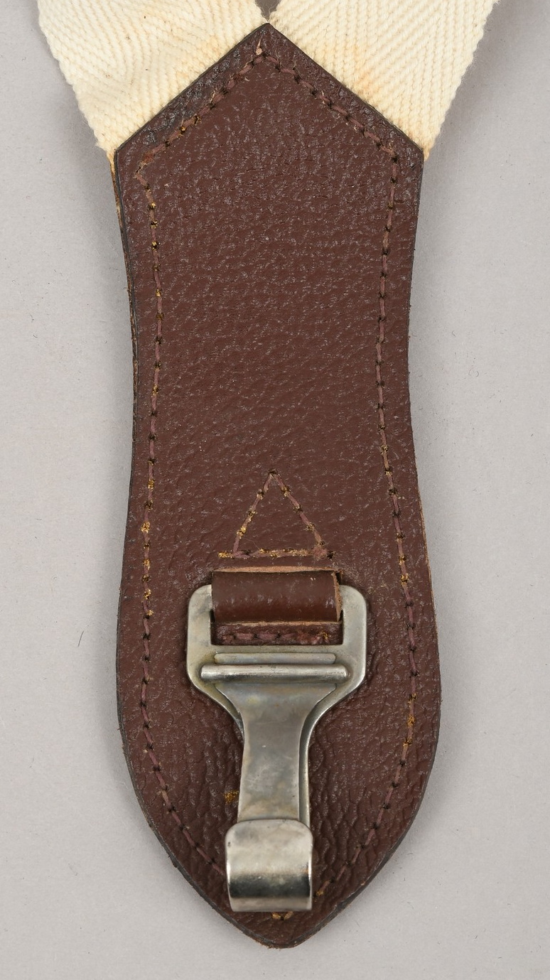 Tear-drop shape dark brown leather with a springloaded metal clip. Sewn to the leather is a size adjustable smooth, White and grey canvas strap with two silvered metal clip’s. Both harness and hanger is in well preserved condition with hardly noticable age toning.