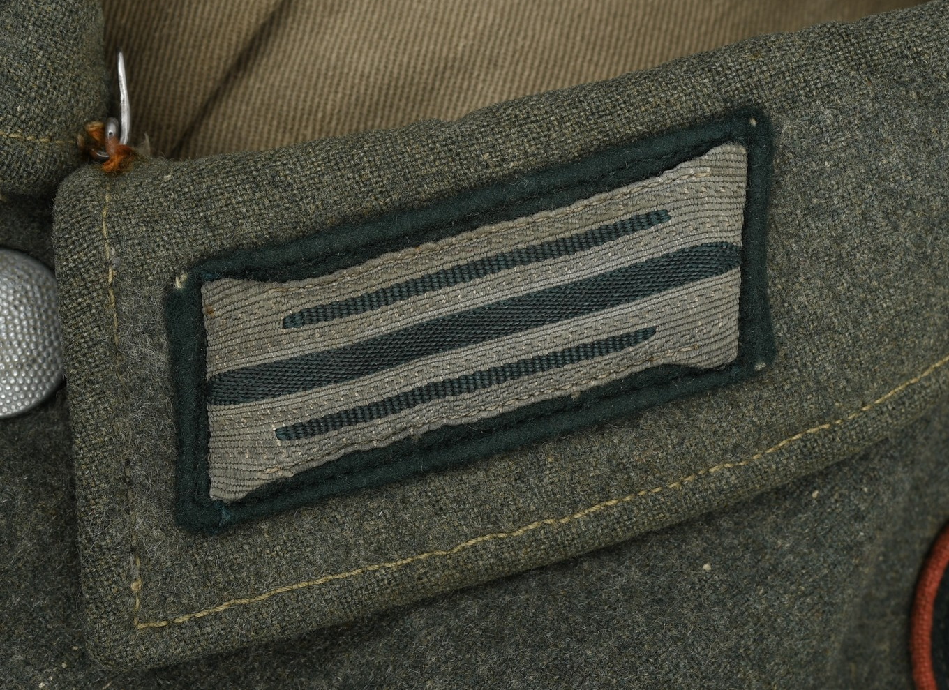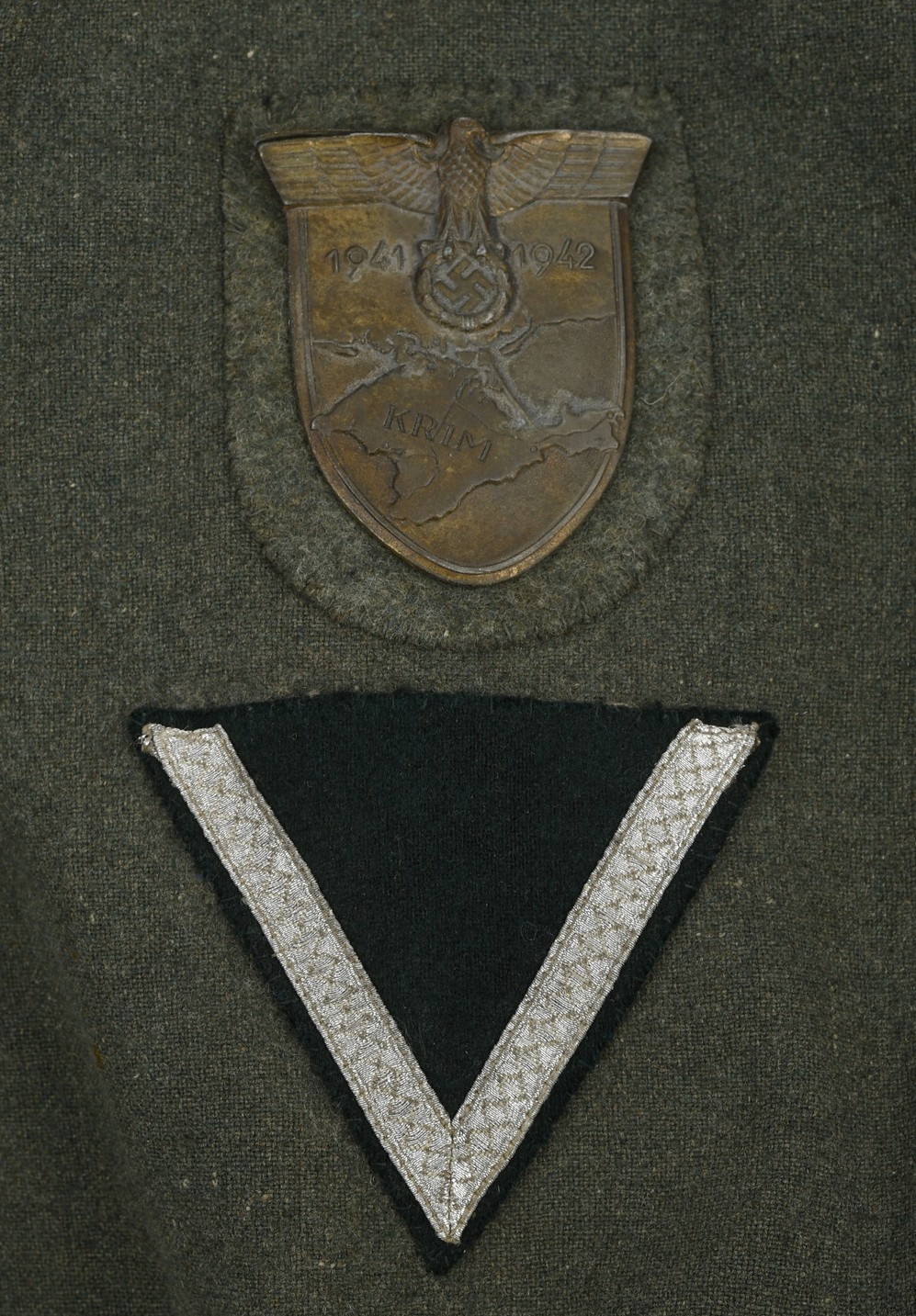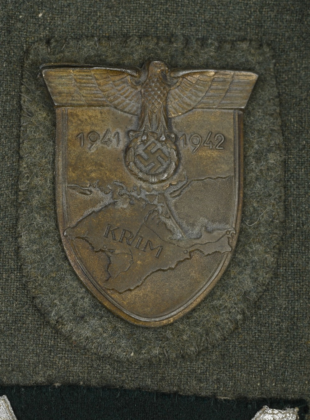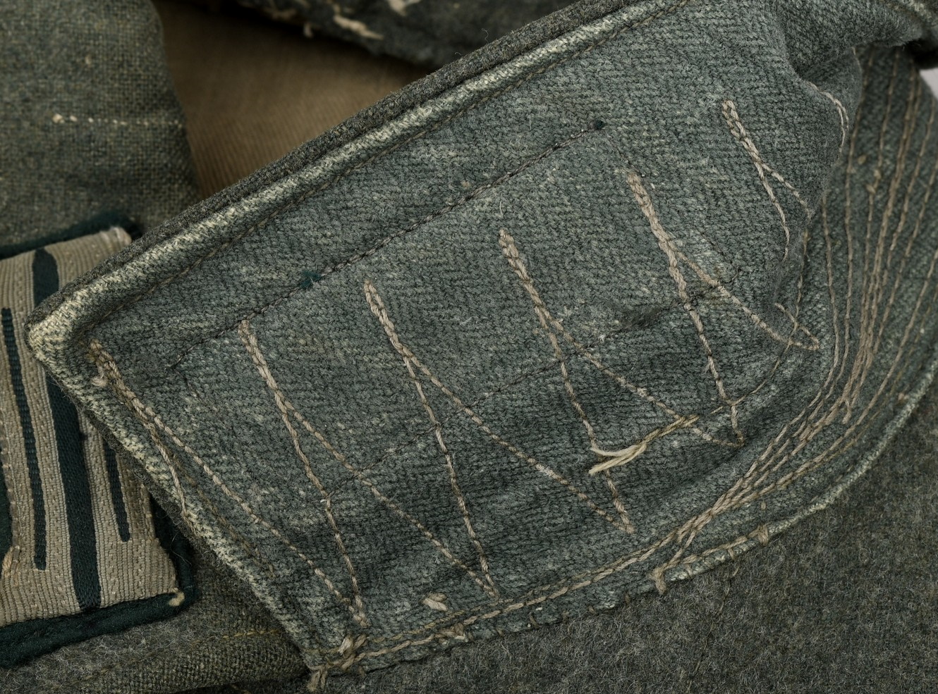 Field-grey wool tunic, five button front closure with a singel metal hook and eye at the neck. The tunic has four pleated front pockets with scalloped button down flaps. Heer general issue collar tab’s, dark-green cloth with bottle green center stripes, period machine sewn in place. Slip-on shoulder straps, not a matching pair, one with rayon pink piping and the other one with wool. However they was for sure used as a pair with similar signs of age and use. The straps are constructed of bottle green wool. Above right breast pocket is a EM/NCO’s national eagle in grey threads on dark green rayon backing. The eagle is machine sewn, top edge then folded down and rest is hand sewn (correct way of application). To the upper left sleeve is a gefreiters rank chevron and a KRIM shield neatly hand sewn in place. To the left chest pocket is loops sewn for two awards and above the pocket is loops sewn for a 2-3 place ribbon bar. The tunic is lined with with mouse grey, brushed cotton cloth. The lining is size stamped in black ink. As well as stamped “41” for year of prodcution. The intact medic pocket is maker marked stamped.