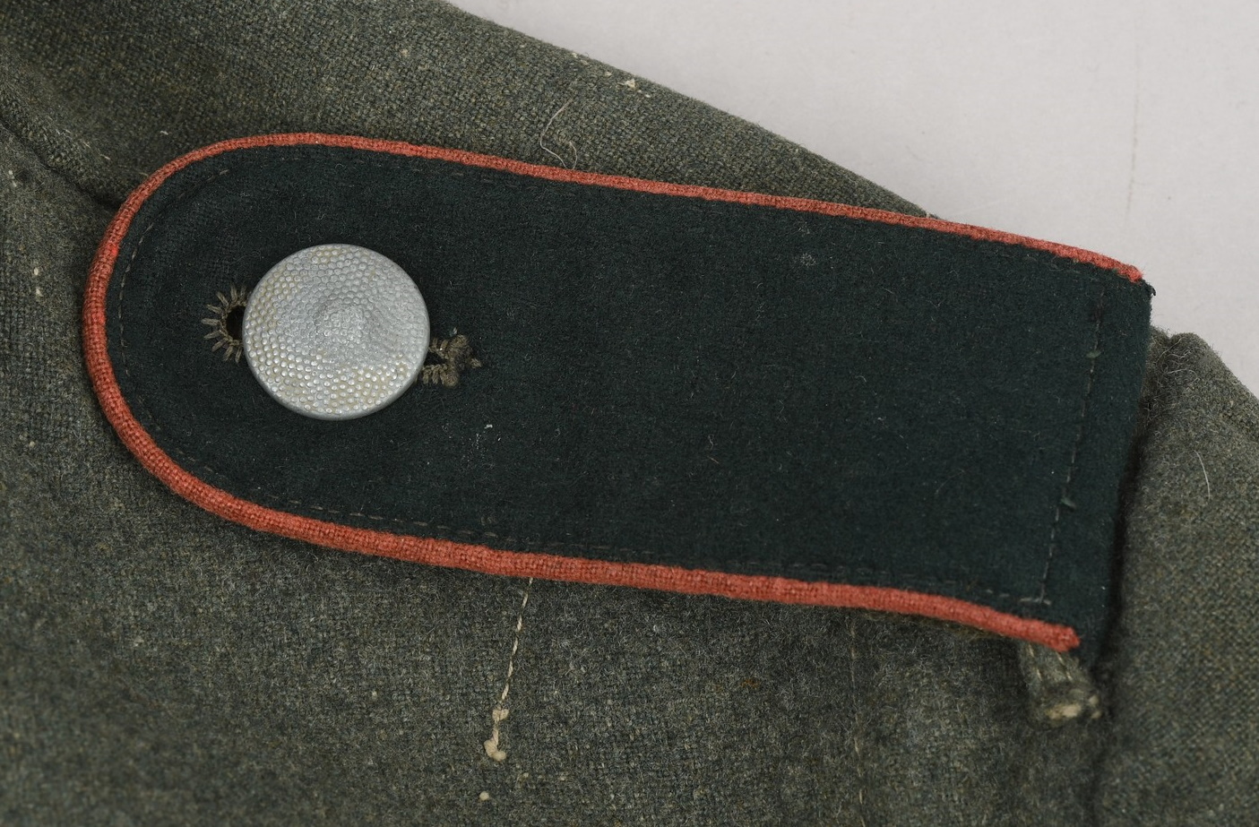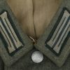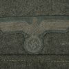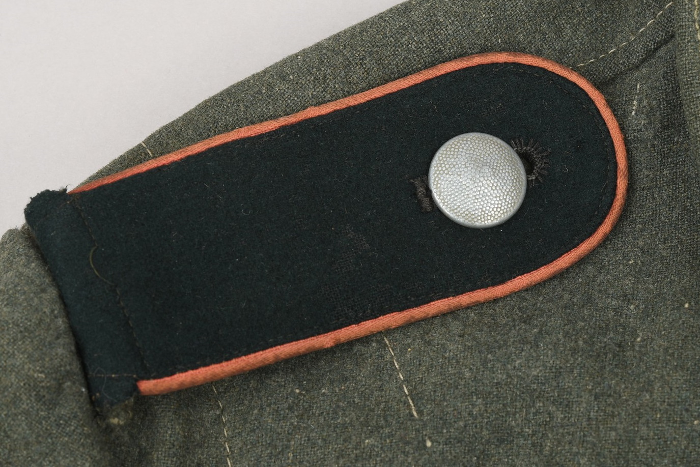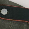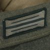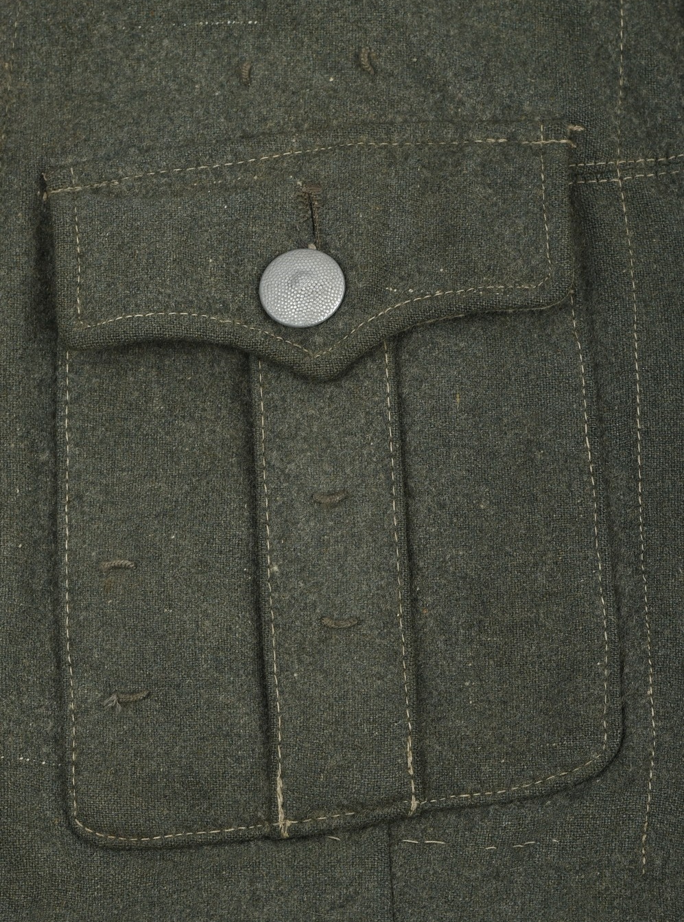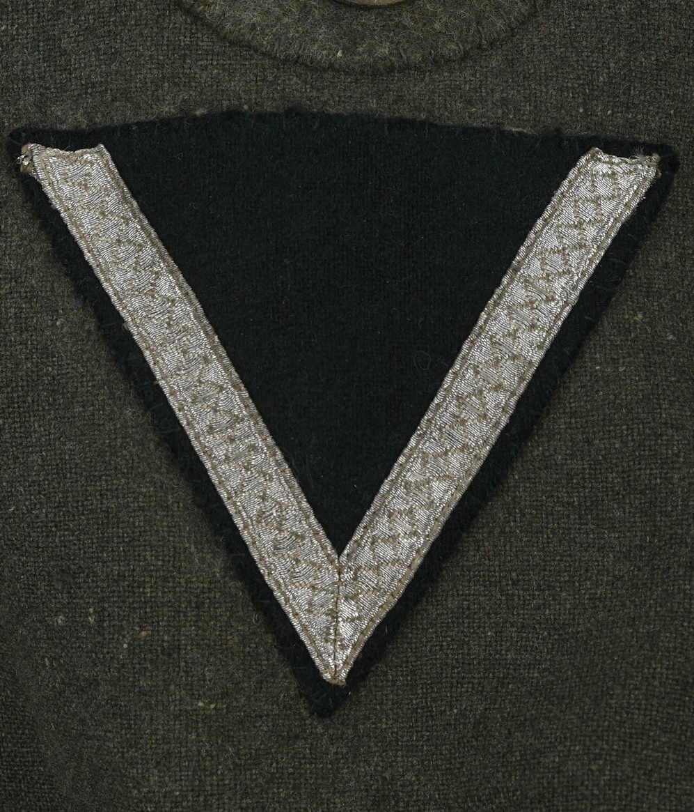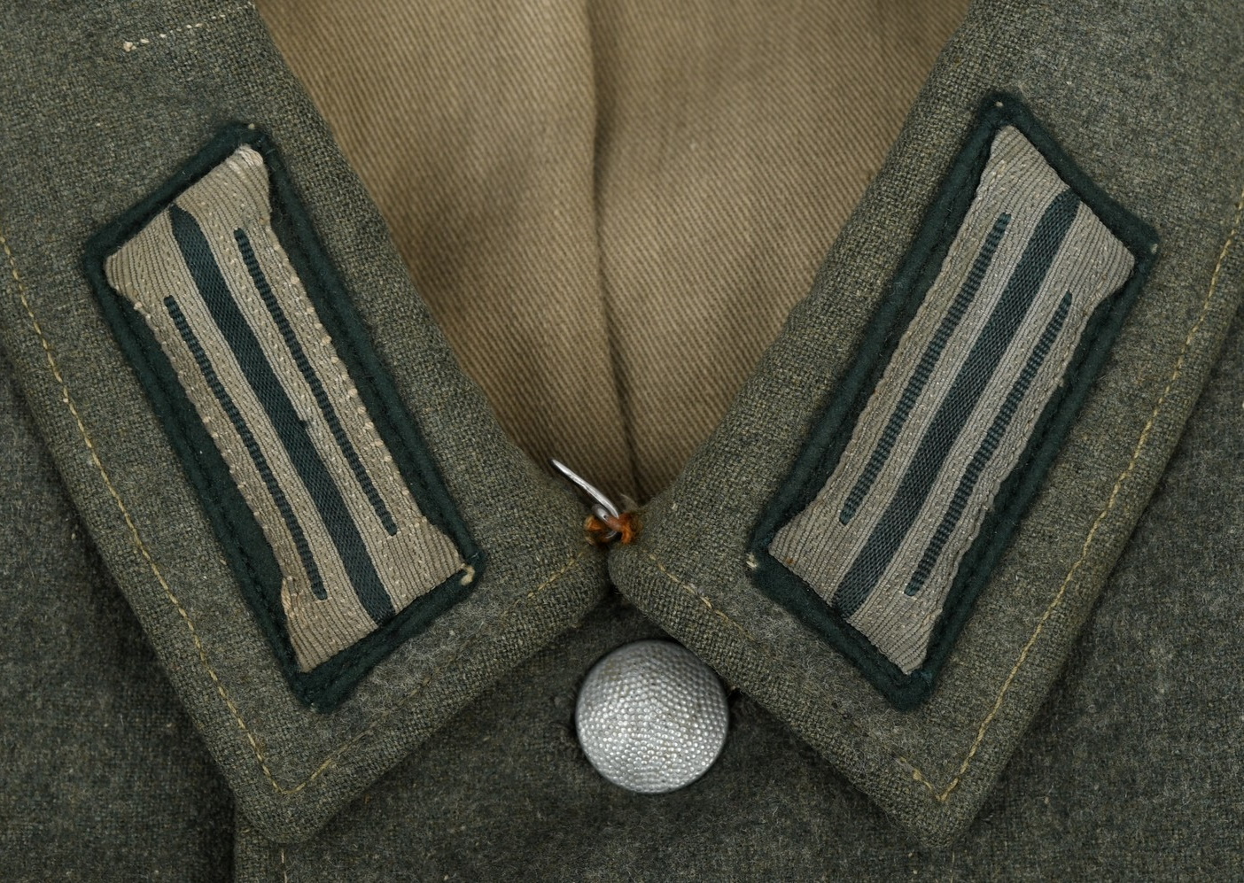 Field-grey wool tunic, five button front closure with a singel metal hook and eye at the neck. The tunic has four pleated front pockets with scalloped button down flaps. Heer general issue collar tab’s, dark-green cloth with bottle green center stripes, period machine sewn in place. Slip-on shoulder straps, not a matching pair, one with rayon pink piping and the other one with wool. However they was for sure used as a pair with similar signs of age and use. The straps are constructed of bottle green wool. Above right breast pocket is a EM/NCO’s national eagle in grey threads on dark green rayon backing. The eagle is machine sewn, top edge then folded down and rest is hand sewn (correct way of application). To the upper left sleeve is a gefreiters rank chevron and a KRIM shield neatly hand sewn in place. To the left chest pocket is loops sewn for two awards and above the pocket is loops sewn for a 2-3 place ribbon bar. The tunic is lined with with mouse grey, brushed cotton cloth. The lining is size stamped in black ink. As well as stamped “41” for year of prodcution. The intact medic pocket is maker marked stamped.