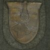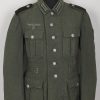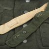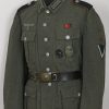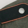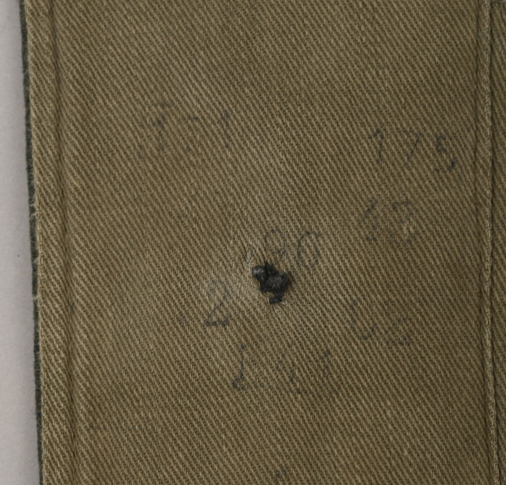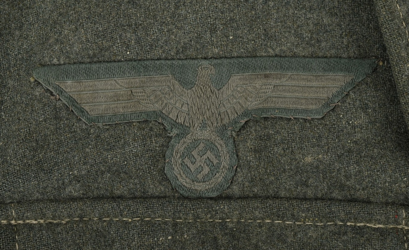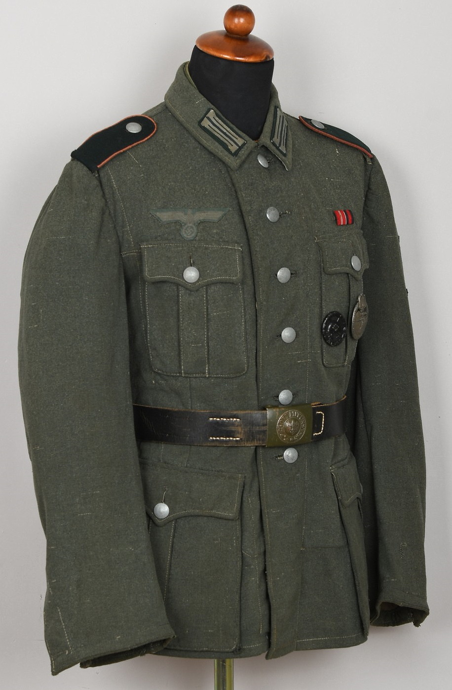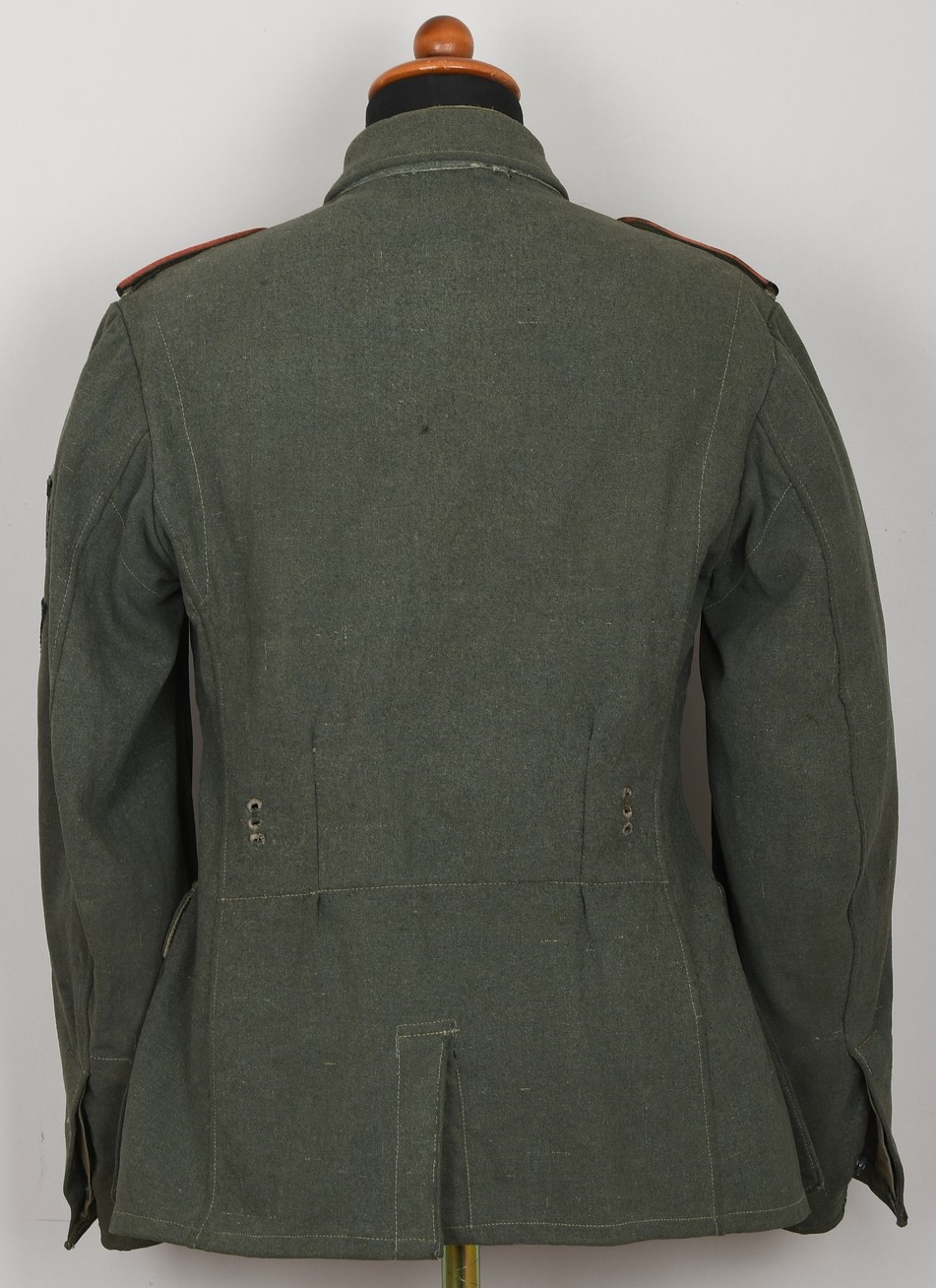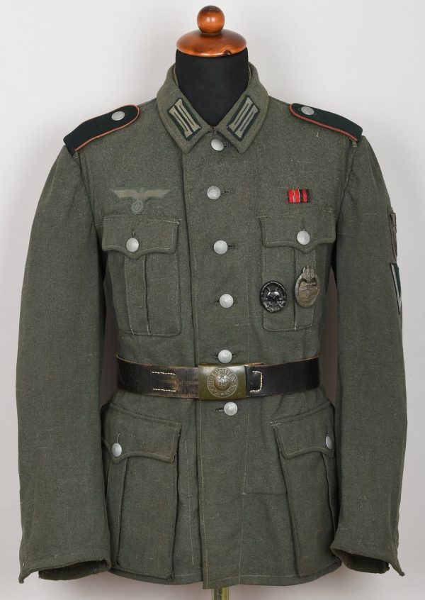 Field-grey wool tunic, five button front closure with a singel metal hook and eye at the neck. The tunic has four pleated front pockets with scalloped button down flaps. Heer general issue collar tab’s, dark-green cloth with bottle green center stripes, period machine sewn in place. Slip-on shoulder straps, not a matching pair, one with rayon pink piping and the other one with wool. However they was for sure used as a pair with similar signs of age and use. The straps are constructed of bottle green wool. Above right breast pocket is a EM/NCO’s national eagle in grey threads on dark green rayon backing. The eagle is machine sewn, top edge then folded down and rest is hand sewn (correct way of application). To the upper left sleeve is a gefreiters rank chevron and a KRIM shield neatly hand sewn in place. To the left chest pocket is loops sewn for two awards and above the pocket is loops sewn for a 2-3 place ribbon bar. The tunic is lined with with mouse grey, brushed cotton cloth. The lining is size stamped in black ink. As well as stamped “41” for year of prodcution. The intact medic pocket is maker marked stamped.