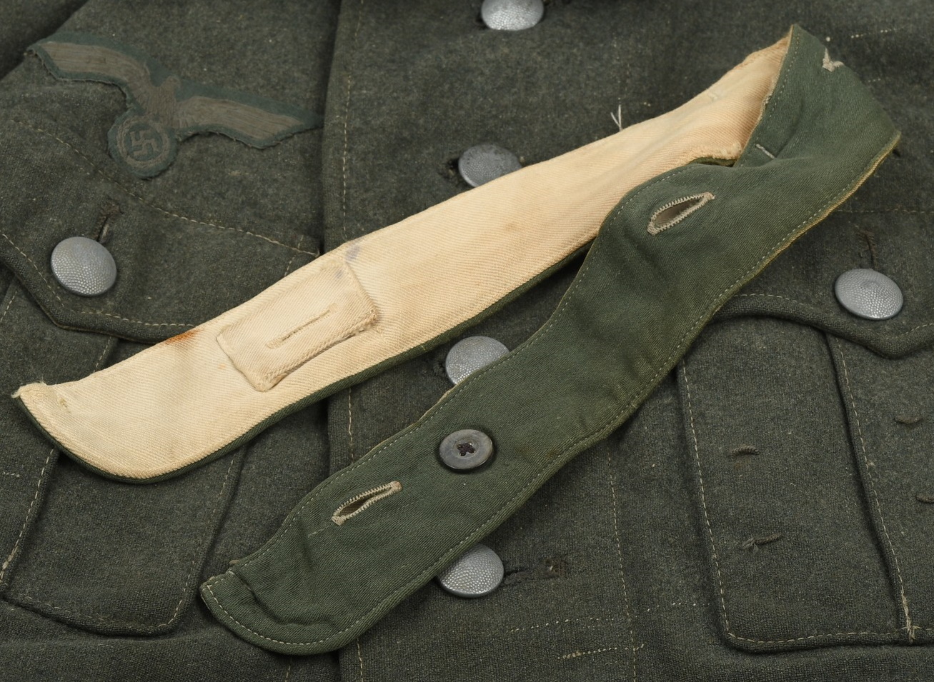 The tunic shows clear signs of real use with all napwear worn and washed of. The buttons are mostly replaced, although now matching (most likely war-time replaced). The tunic also comes with a inner protective collar.