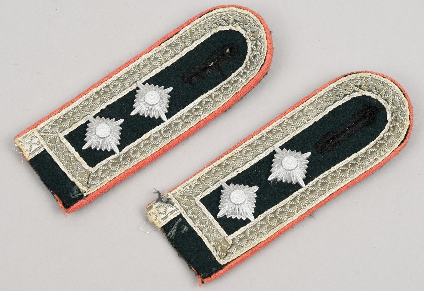 Early second pattern sew-on shoulder boards, constructed of dark green with pink wool piping. Two silver washed rank alloy pips are pinned in place to each board and bright silver NCO tresse all arround edges. The fully matching pair is in good condition with signs of age and use.