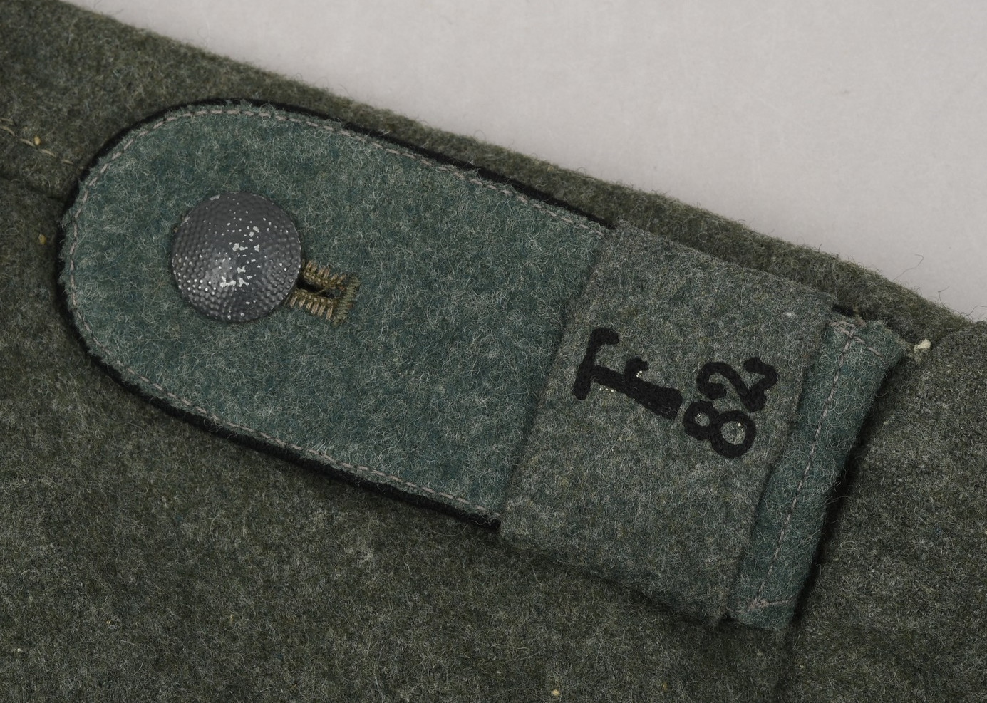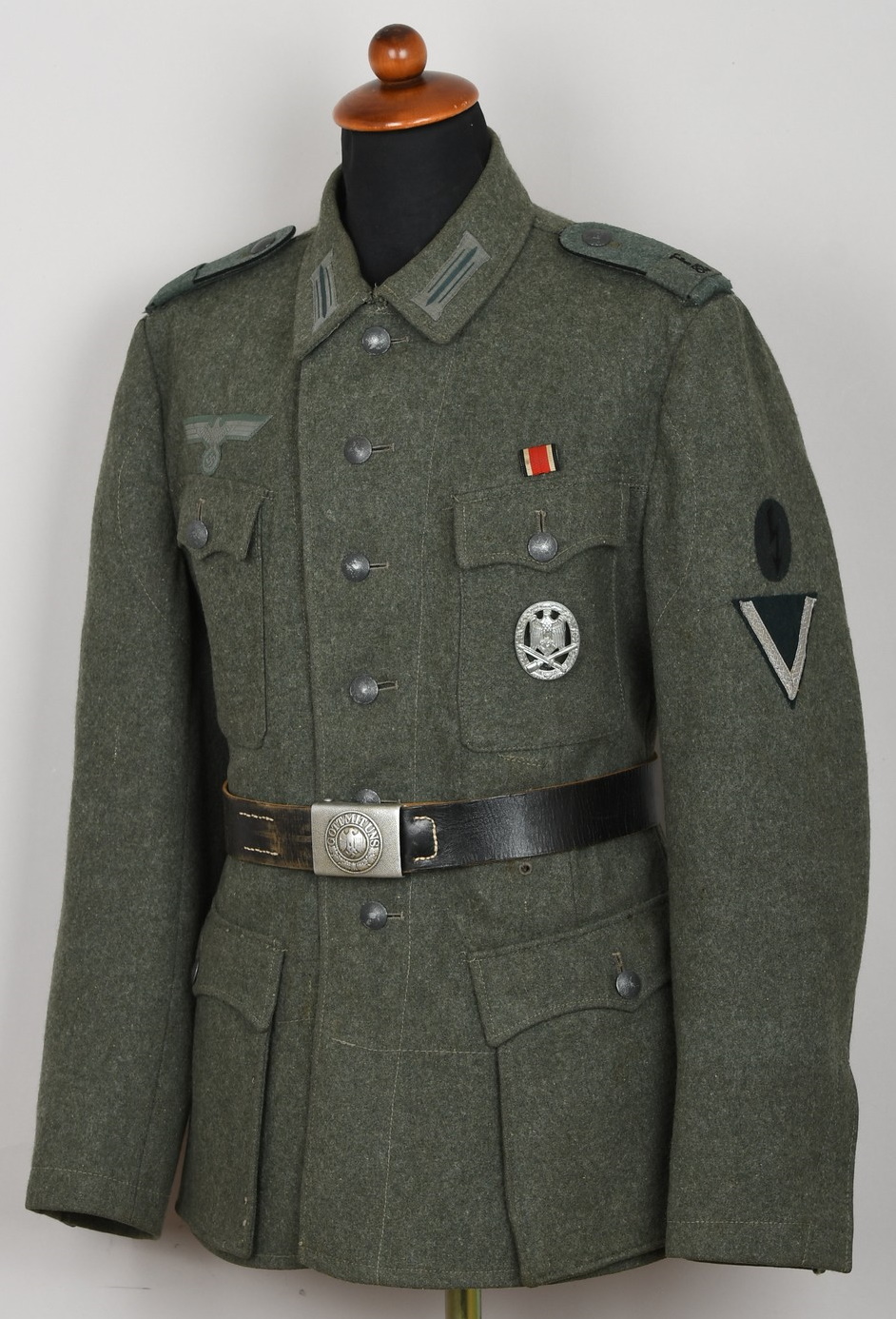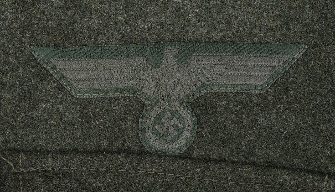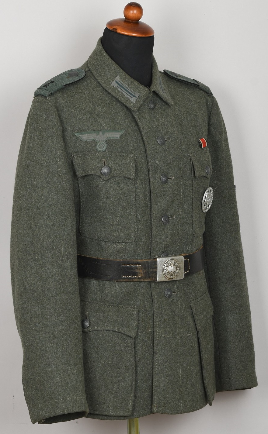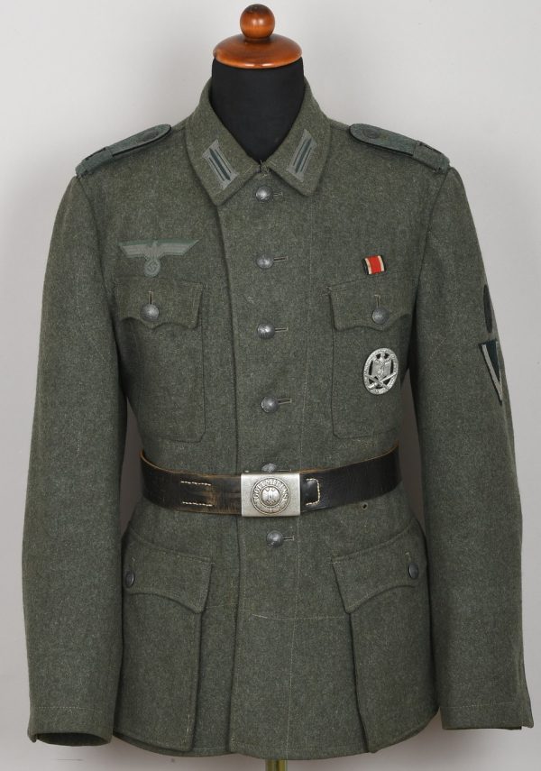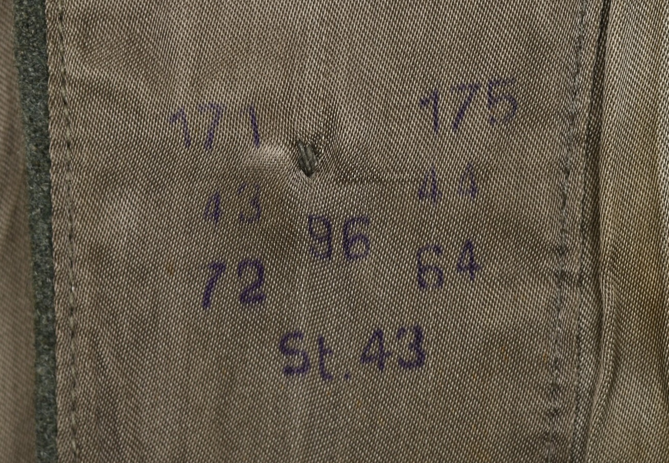Field-grey wool construction, issue tunic, six button front closure with a single metal hook and eye positioned at the neckline. The field blouse has four, non-pleated, front pockets with scalloped edged button down flaps. Machine sewn to the collar is general issue collar tabs. Above the right chest pocket is a national eagle in grey thread on field-grey rayon. The eagle is both hand and machine sewn in place and is original to the tunic. Slipped and buttoned in place to each shoulder is a field-grey shoulder straps with black rayon piping. Slided in place to each strap is a unit cloth cypher which reads: “F 82”. To the left sleeve is a gefreiters chevron and a pioneer signal insignia neatly hand sewn in place. To the left breast pocket is award loops sewn for one award. Above the same pocket is a Iron Cross second class ribbon pinned in place to two sewn loops. Inside is clearly size marked as well as year of production marked “43” for 1943. Medic pocket still intact. Medic pocket is stamped with a faint RBnr. The tunic is in very good condition with signs of real use and age.