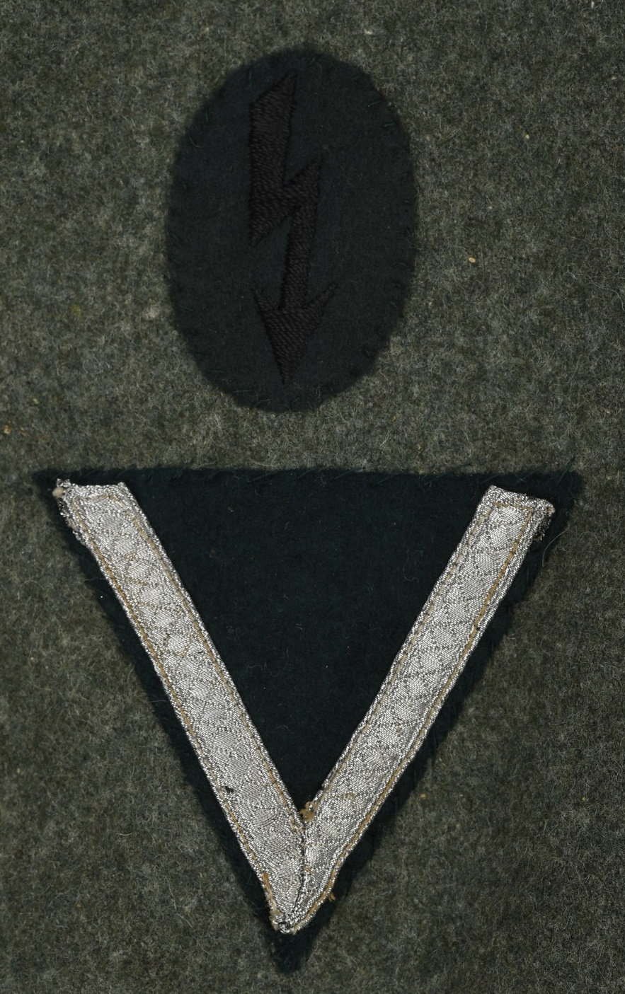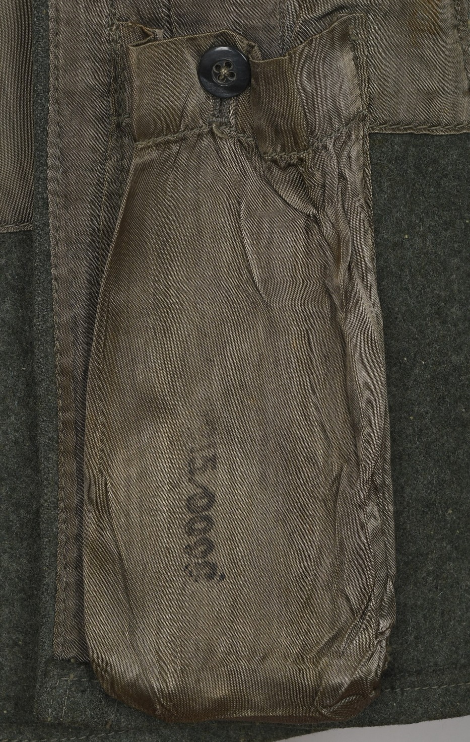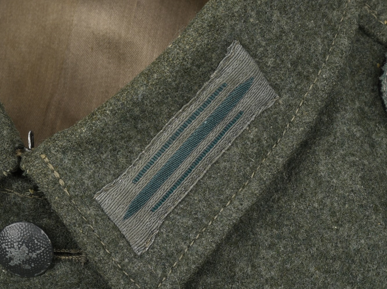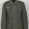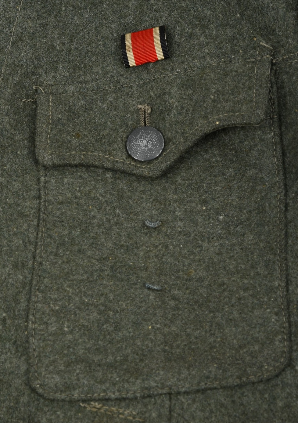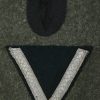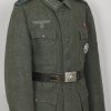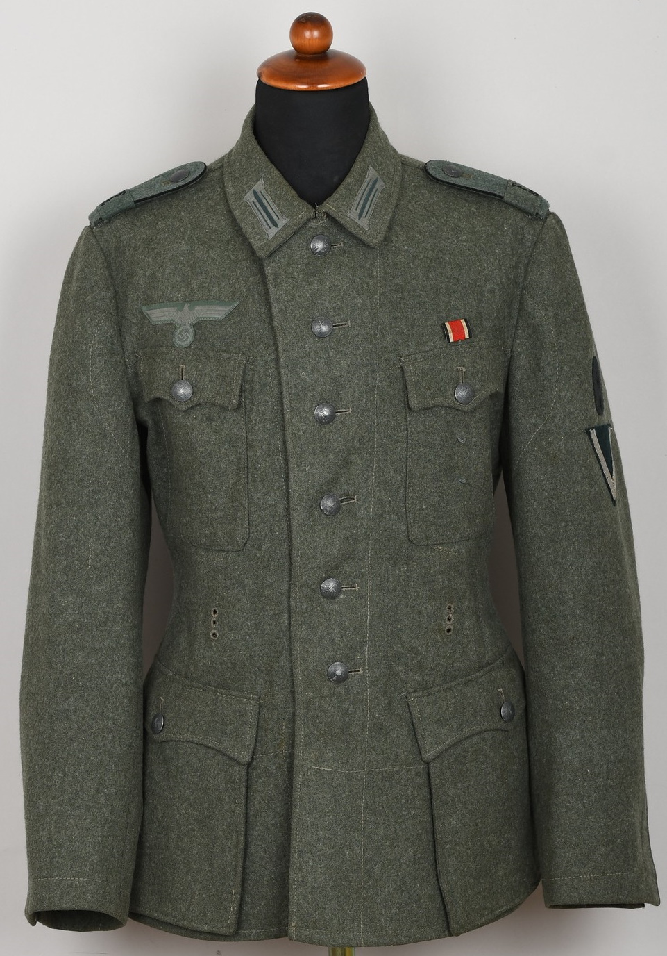 Field-grey wool construction, issue tunic, six button front closure with a single metal hook and eye positioned at the neckline. The field blouse has four, non-pleated, front pockets with scalloped edged button down flaps. Machine sewn to the collar is general issue collar tabs. Above the right chest pocket is a national eagle in grey thread on field-grey rayon. The eagle is both hand and machine sewn in place and is original to the tunic. Slipped and buttoned in place to each shoulder is a field-grey shoulder straps with black rayon piping. Slided in place to each strap is a unit cloth cypher which reads: “F 82”. To the left sleeve is a gefreiters chevron and a pioneer signal insignia neatly hand sewn in place. To the left breast pocket is award loops sewn for one award. Above the same pocket is a Iron Cross second class ribbon pinned in place to two sewn loops. Inside is clearly size marked as well as year of production marked “43” for 1943. Medic pocket still intact. Medic pocket is stamped with a faint RBnr. The tunic is in very good condition with signs of real use and age.
