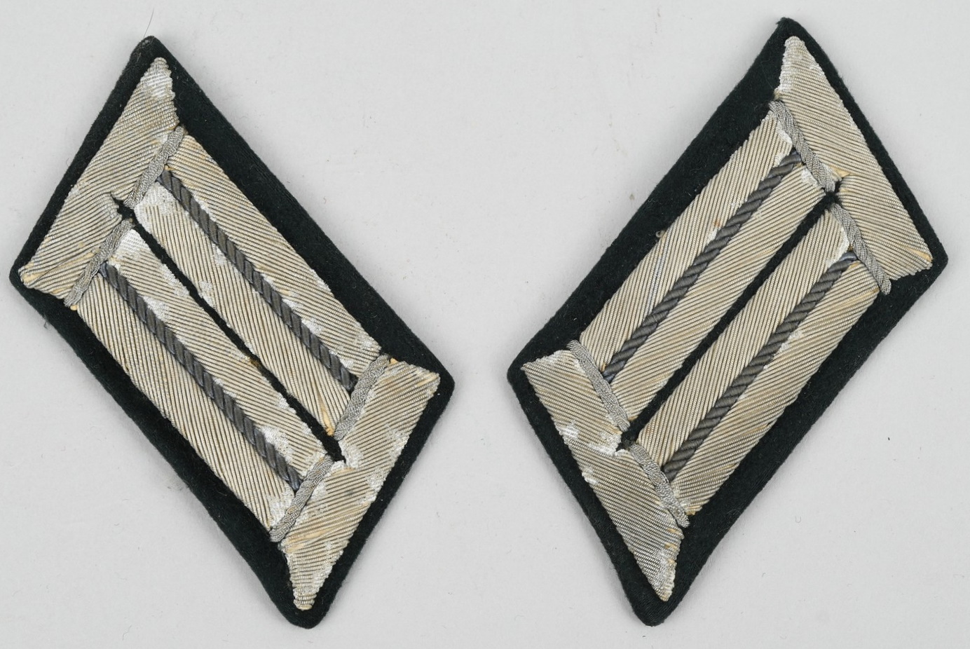 Hand embroidered litzen in silver/grey threads with scarce grey branch of service stripes for propaganda company. Mounted on a dark blue/green badge cloth bases. The blue/green badge cloth base shows through as the center stripe of the litzen. Perfect matching, uniform removed with a very nice age patina.