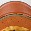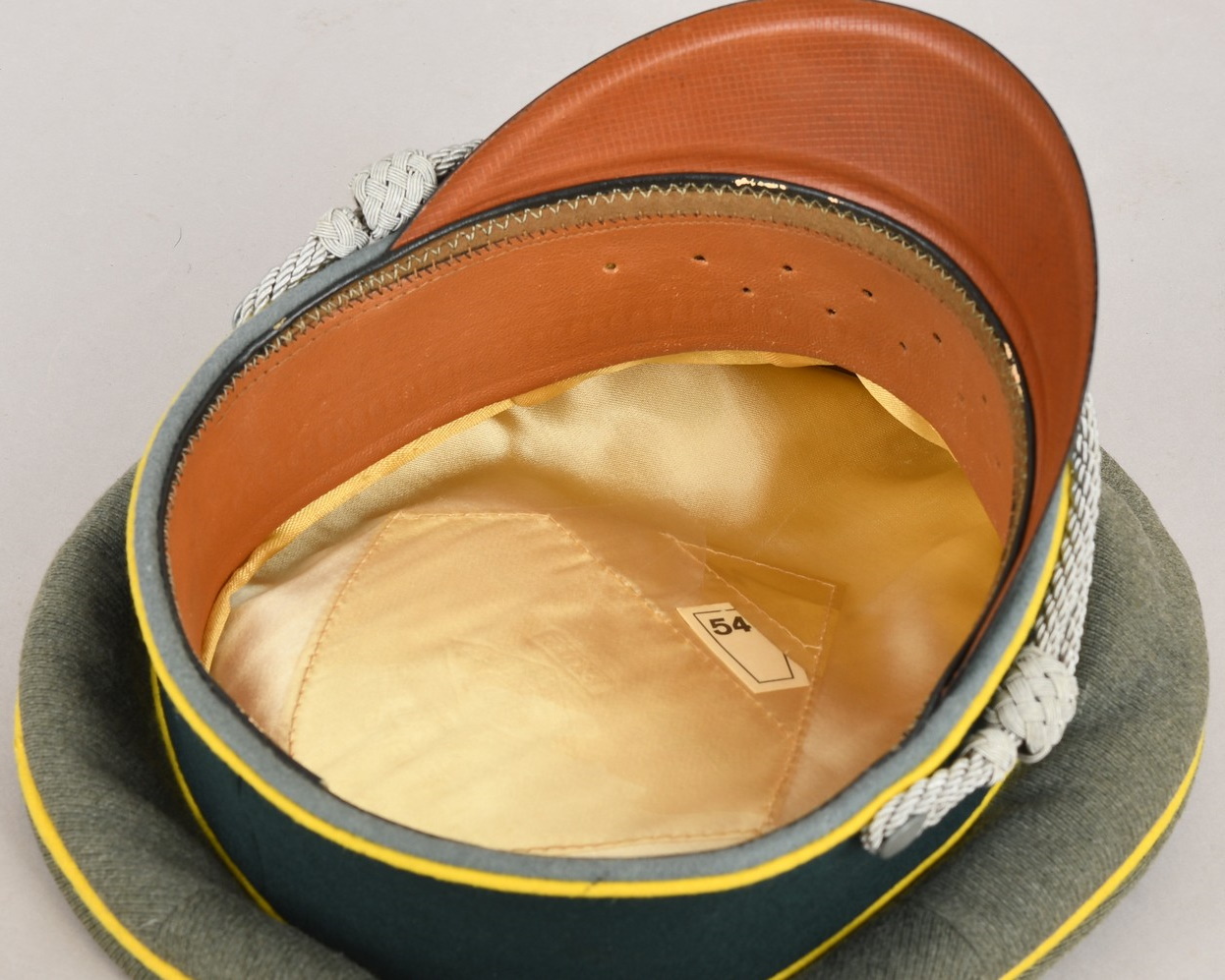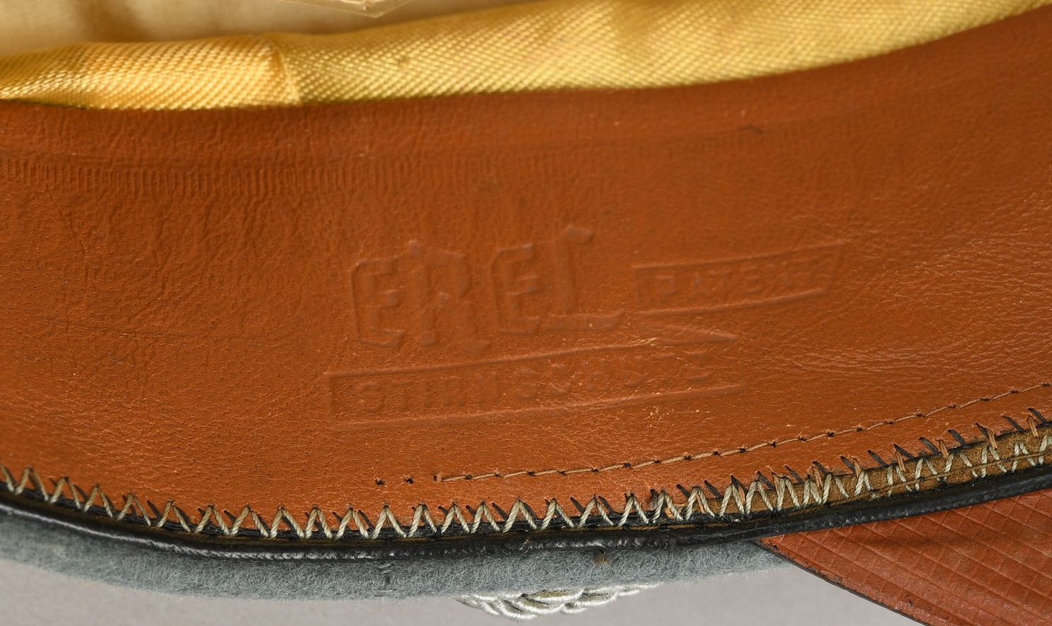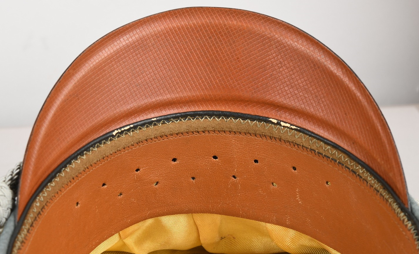 Mid – later war produced officer’s visor cap, constructed of field-grey tricot cloth with lemon yellow wool piping. Pinned in place to the front is a zinc national eagle and alloy metal wreath/cockade. Also in front and buttoned in place to the sides is as a officer´s heavy chincord. Inside cap is lined with golden yellow rayon. Cap still have it´s original sweat shield all intact. The cap is water marked stamped “Erel” beneath the sweatshield. Brown leather sweatband is all intact. Sweatband is clearly maker marked “Erel”.
