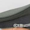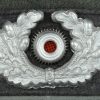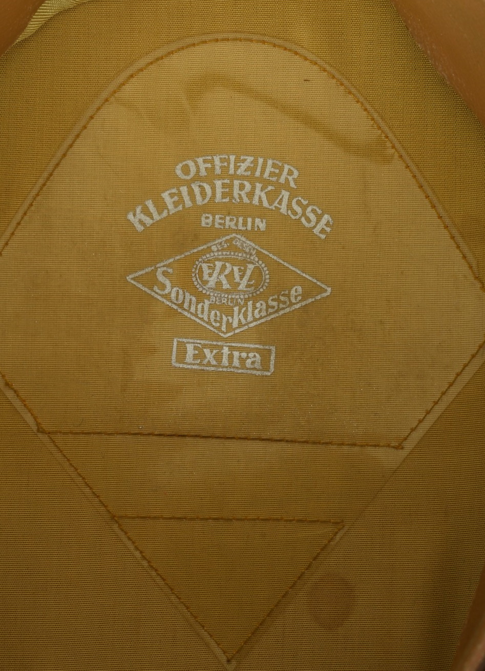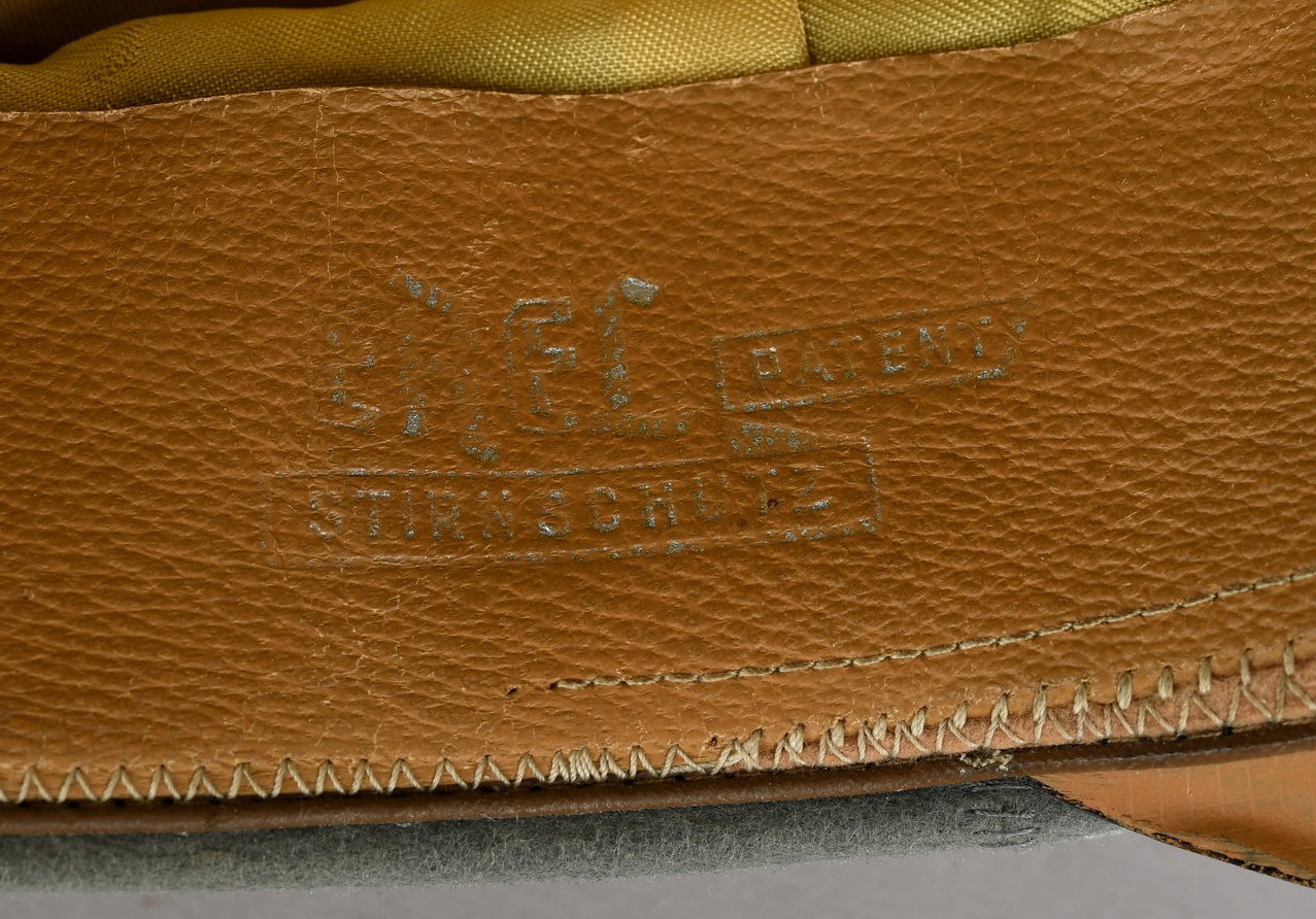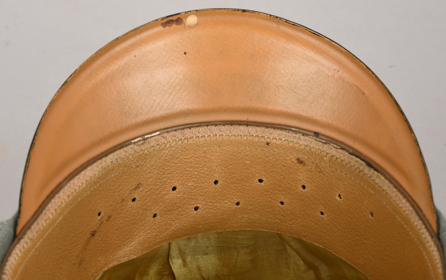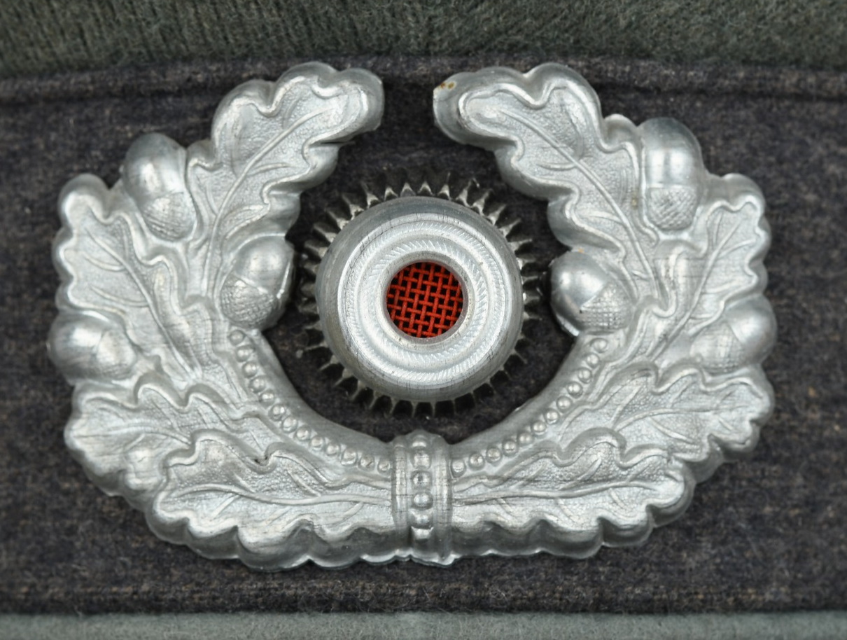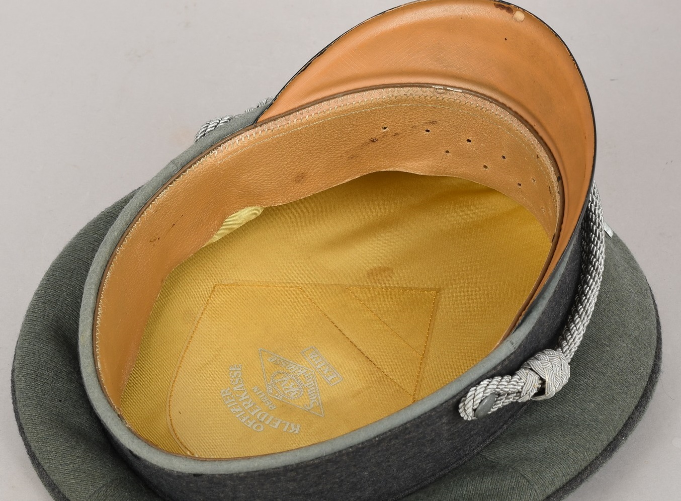 Mid-war officer’s visor cap, field-grey tricot cloth construction body and crown, a grey coarse wool centerband and grey, trimmed wool branch color piping to the top crown edge and both the top and bottom edges of the centerband. Pinned in place to the front is a silver painted Zinc national eagle and wreath / cockade. The cockade is Erel’s special vantilated one. The cap has a bright, twisted, silver/aluminum chin cord secured in place by two, silver washed sheet metal buttons. The cap has a black lacquered vulcanfibre visor with a subtly raised lip to the forward edge. Inside is fully lined in golden yellow rayon. The interior crown lining has a clear celluloid sweat diamond which is all intact. The sweat diamond is marked “Erel Berlin Sonderklasse Extra”. The cap is large, size 58-59 and is in very good condition outside is in perfect “mint” condition inside shows a couple of minor wear / age spots.