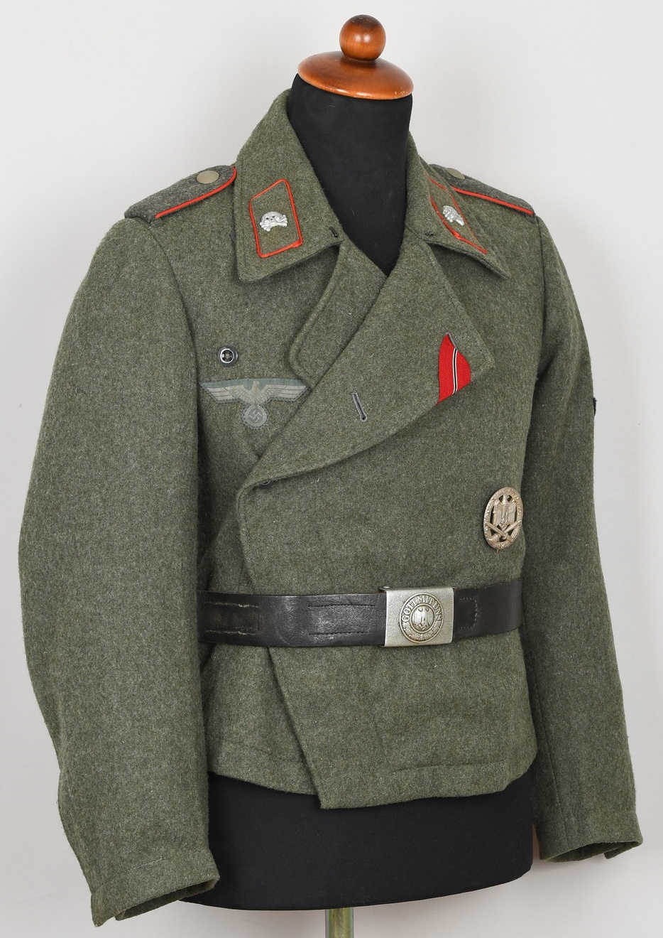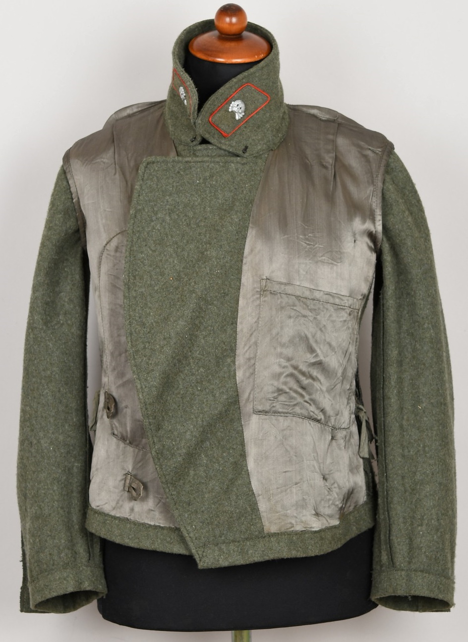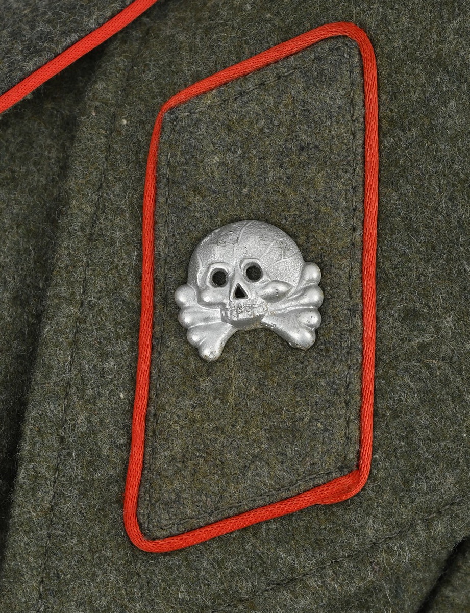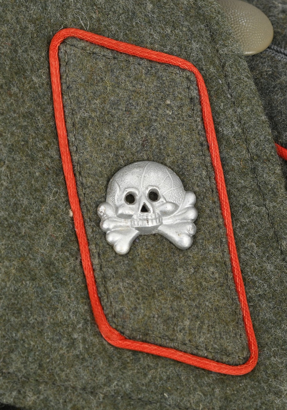 Field-grey wool construction, double breasted tunic with small fold back lapels and a large lay down collar. The left front closure panel of the tunic has four hidden button holes and an additional three, visible button holes on the fold back lapel. The right front closure panel has all four large and two of the three smaller corresponding buttons intact. The edge of the right front closure panel has an additional two, small, buttons underneath the overlapping left closure panel with corresponding, internal, fabric loops for a secure closure with a neat appearance. The tunic also has a single metal hook and eye positioned at the forward neckline for a secure closure. The right breast has an machine woven, national eagle in matte grey threads on a cut-out, woven field-grey rayon base. The eagle is factory hand and machine sewn in place. The reverse of the tunic has a central seam. EM slip on shoulder straps with red rayon piping slided and buttoned in place. The collar has the typical zig-zag reinforcement stitching to the reverse. The collar features collar tabs with red rayon piping and silver washed . The collar features the elongated, field-grey wool collar tabs with the typical, silver washed, Danziger style Totenkopf cyphers pinned in place. The collar tabs are machine sewn to the collar. To the upper left sleeve is a obergefreiters rank chevron on bottle green cloth backing neatly hand sewn in place. East front ribbon is hand sewn to the upper button hole and there is award loops sewn for one award. The interior breast panels are lined in silver/grey rayon cloth. The lining has a patch pocket to the right breast panel and a slash patch pocket to the left breast panel. The interior of the tunic also has two, rayon straps with six stitched eyelets to each, situated at the waistline to secure the belt support hooks. The interior also has a tunnel looped, grey drill cloth fit adjustment drawstring to each of the waistline side panels. Clearly size and Rbnr marking to the inner left lining.